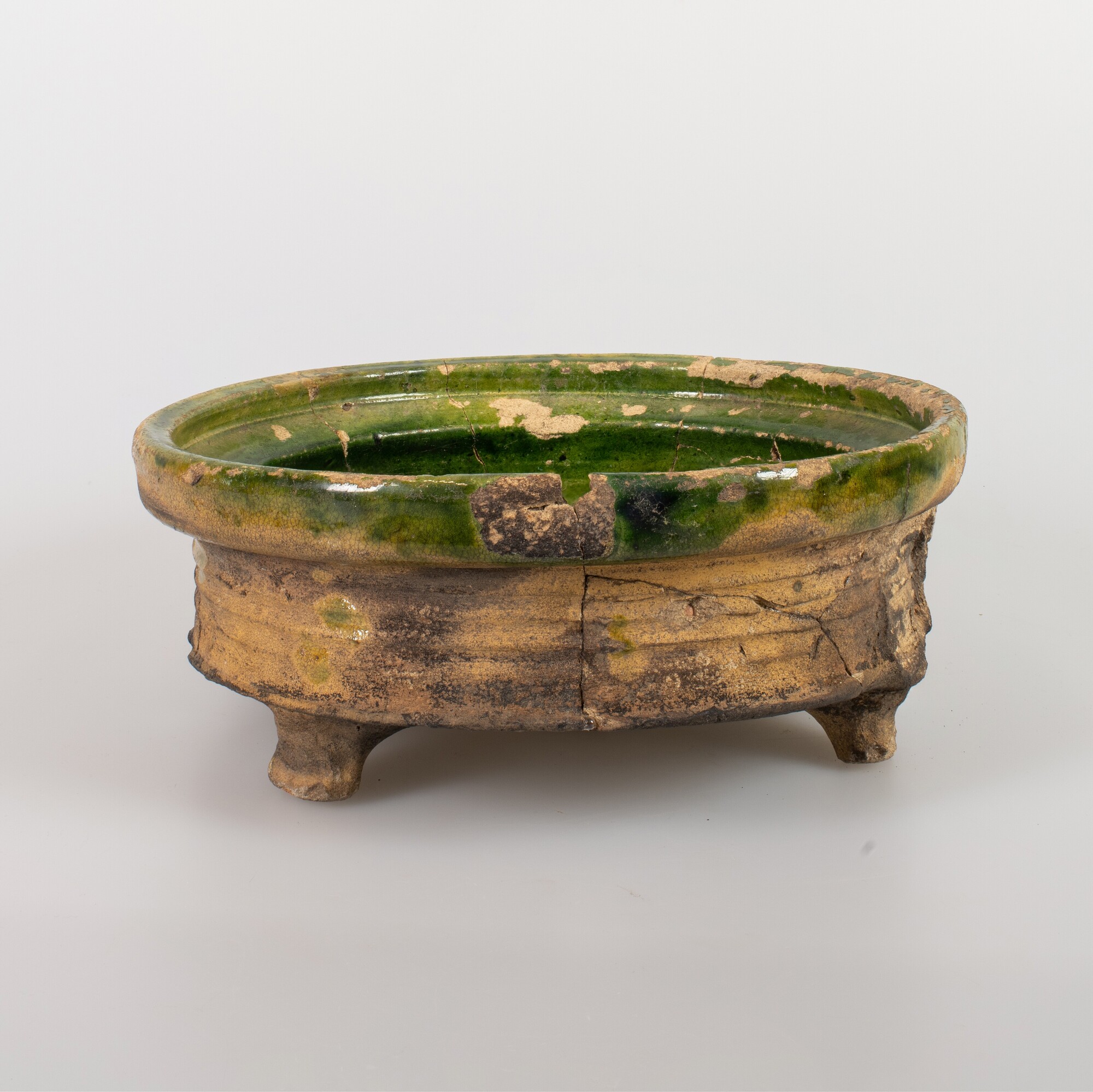 Grape; w-gra-36; wijde grape met scherpe knik tussen bodem en vrijwel verticale wand, naar buiten geknikte rand met dekselgeul, ronde holle steel (ontbreekt), drie poten; witbakkend aardewerk; inwendig loodglazuur met koperoxide; bodem beroet; herkomst: West-Nederland