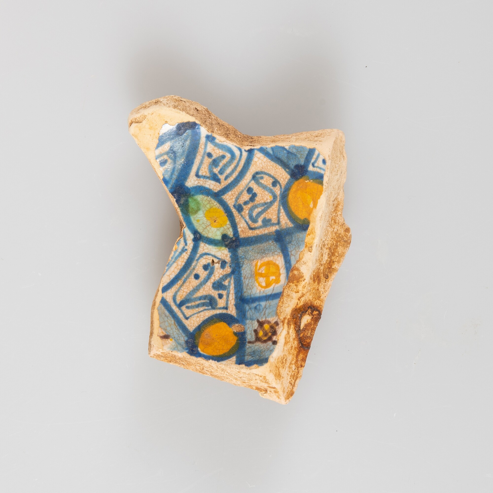 Kom; i-kom-8b (bodemfragment); kom met rechte rand, standvlak; Italiaans tinglazuuraardewerk; tinglazuur; inwendig polychrome beschildering: geometrische motieven: arabesken; uitwendig: twee blauwe biezen; herkomst: Montelupo, Italie