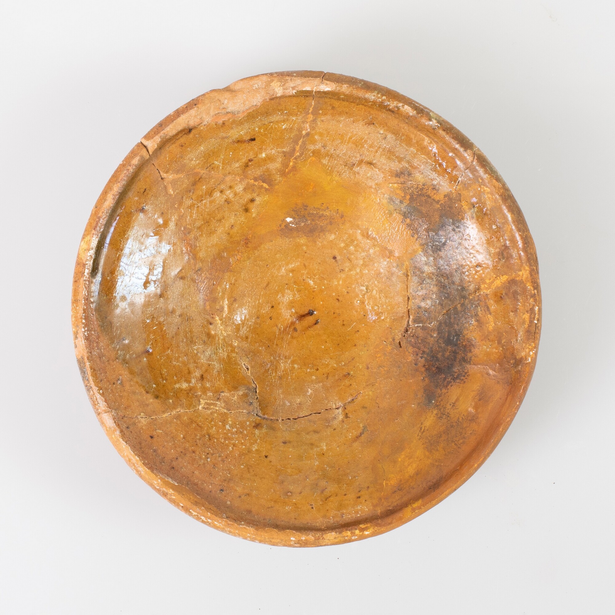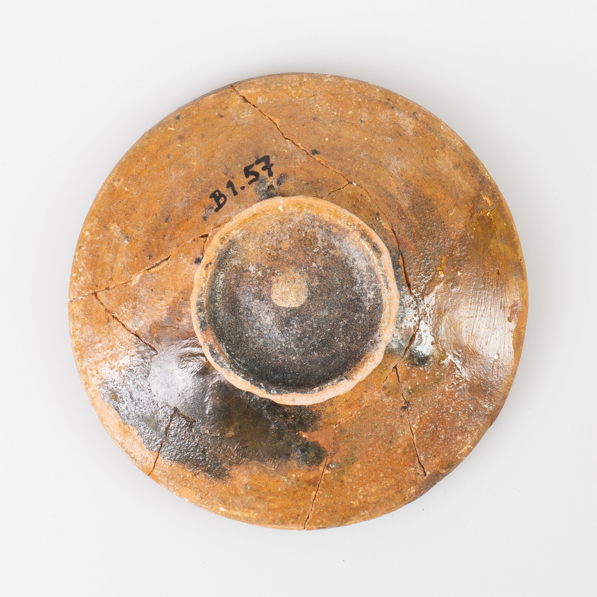 Bord; r-bor-4; afgerond bord zonder vlag, verdikte rand met opstaande lip, standring; roodbakkend aardewerk; loodglazuur; herkomst: Friesland