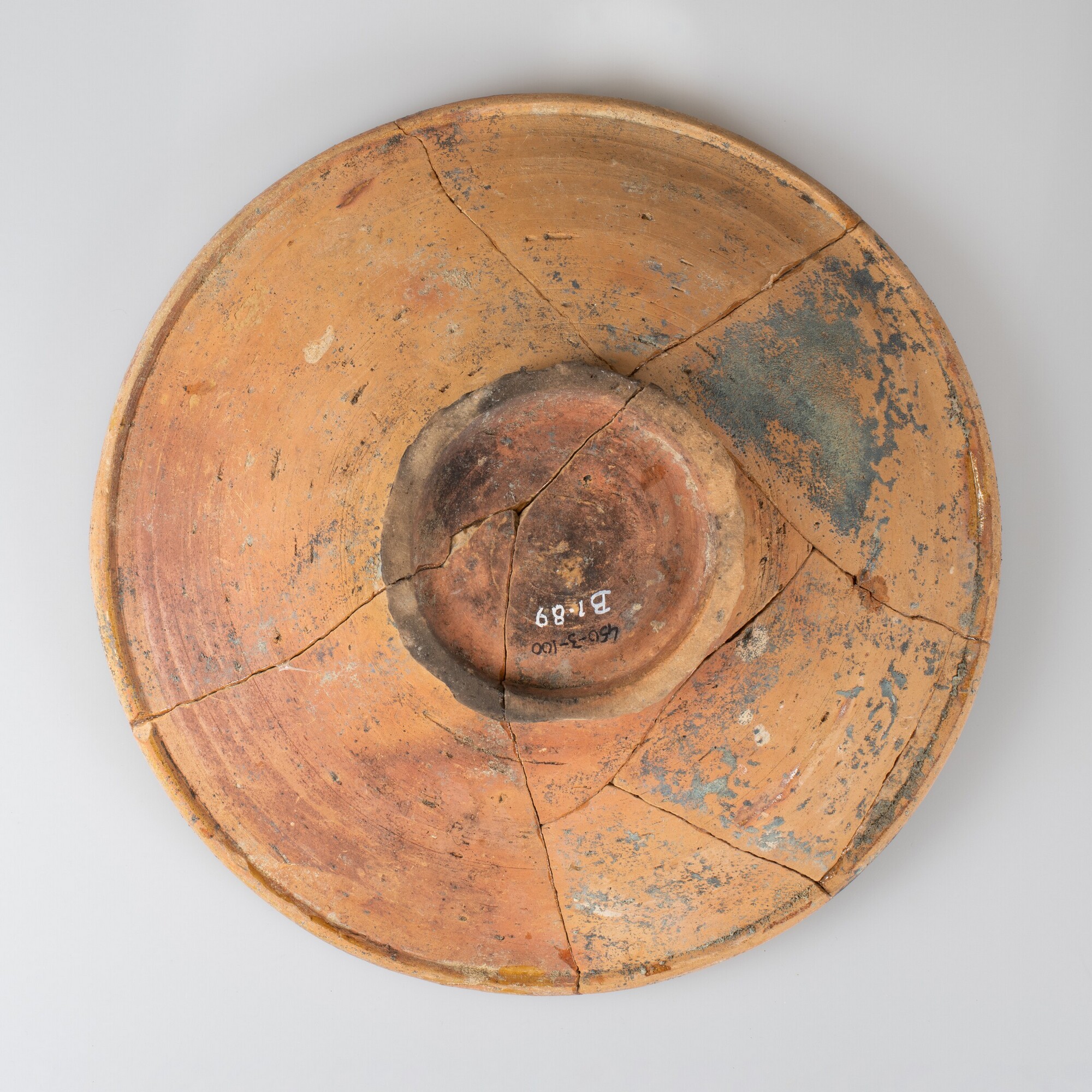 Bord; r-bor-3; bord zonder vlag met afgeronde kraagrand, standring; roodbakkend aardewerk; inwendig loodglazuur; slibversiering: spiegel: gemarmerde witte en rode kleislib; bodem licht beroet; herkomst: Friesland