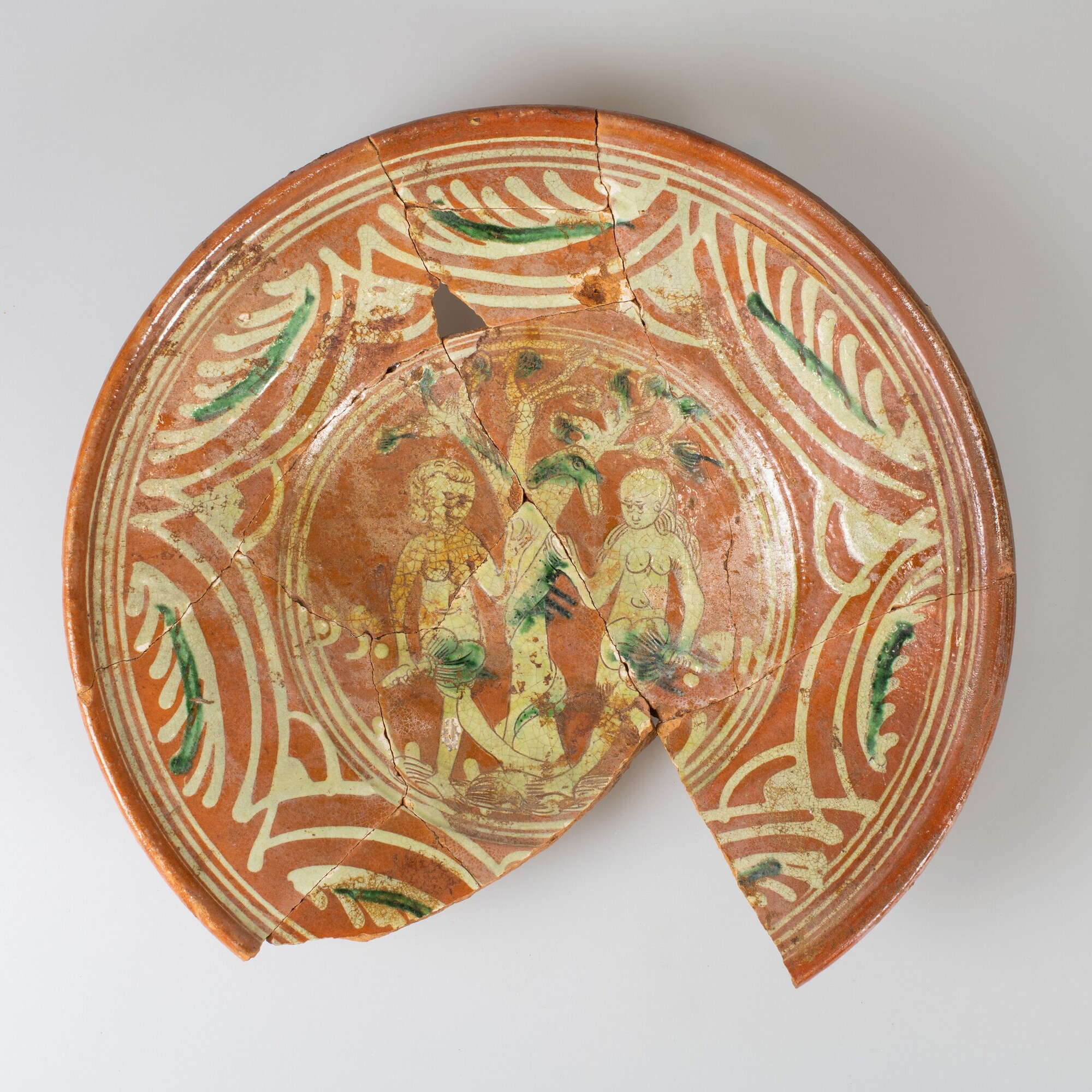 Bord; wa-bor-1; conisch bord met smalle afgeronde kraagrand, standvlak; Werra-aardewerk; inwendig loodglazuur; slibversiering met accenten van koperoxide: slib-krastechniek; spiegel: adam en eva met slang in de boom en jaartal 15 91.; vlag: ornamentbanden en concentrische cirkels; herkomst: Werra-gebied, Duitsland