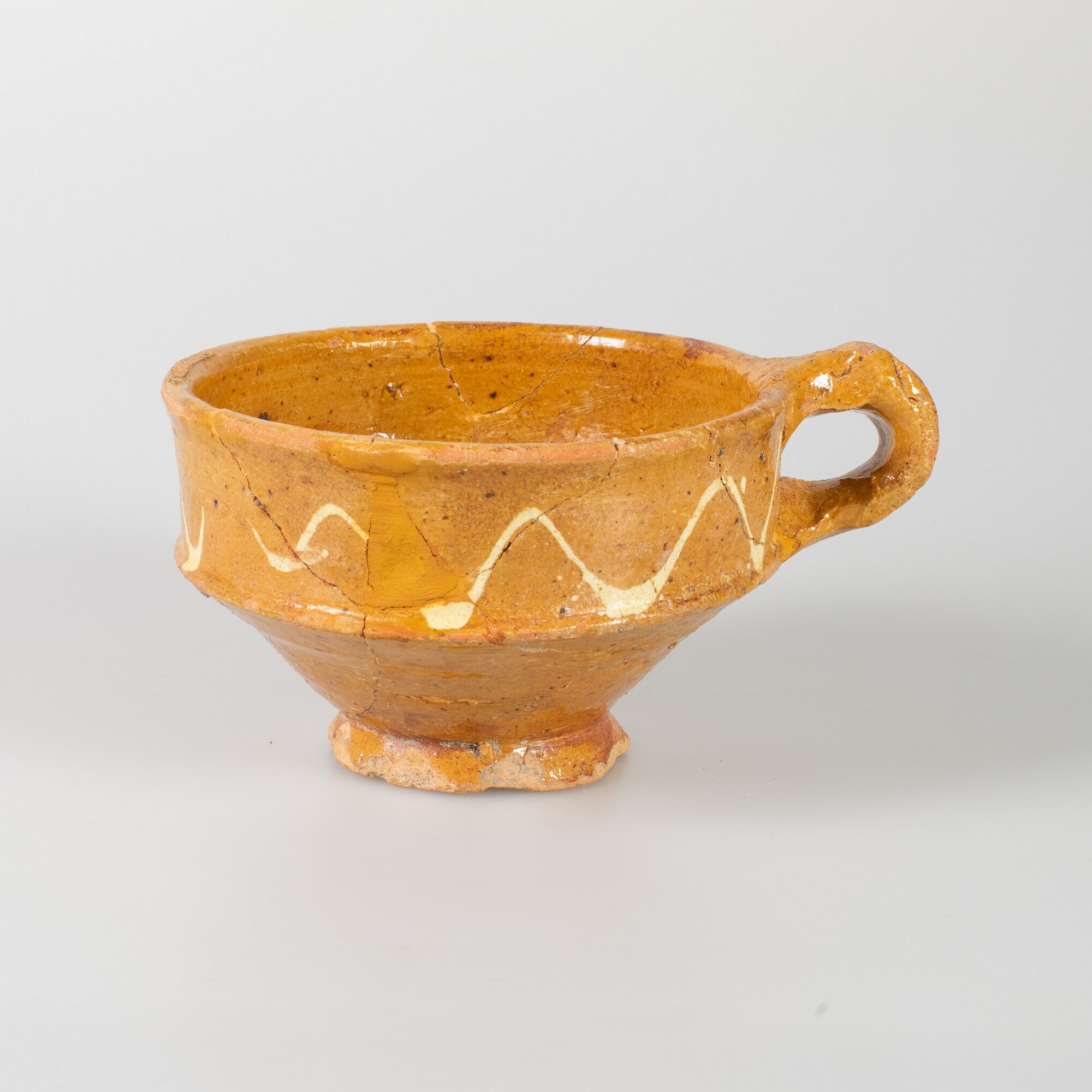 Kop; r-kop-4; kop met scherpe knik bodem-wand, hoge wand, standring; roodbakkend aardewerk; loodglazuur; inwendig laag van witte kleislib, uitwendig slingerlijn van witte kleislib; herkomst: Friesland