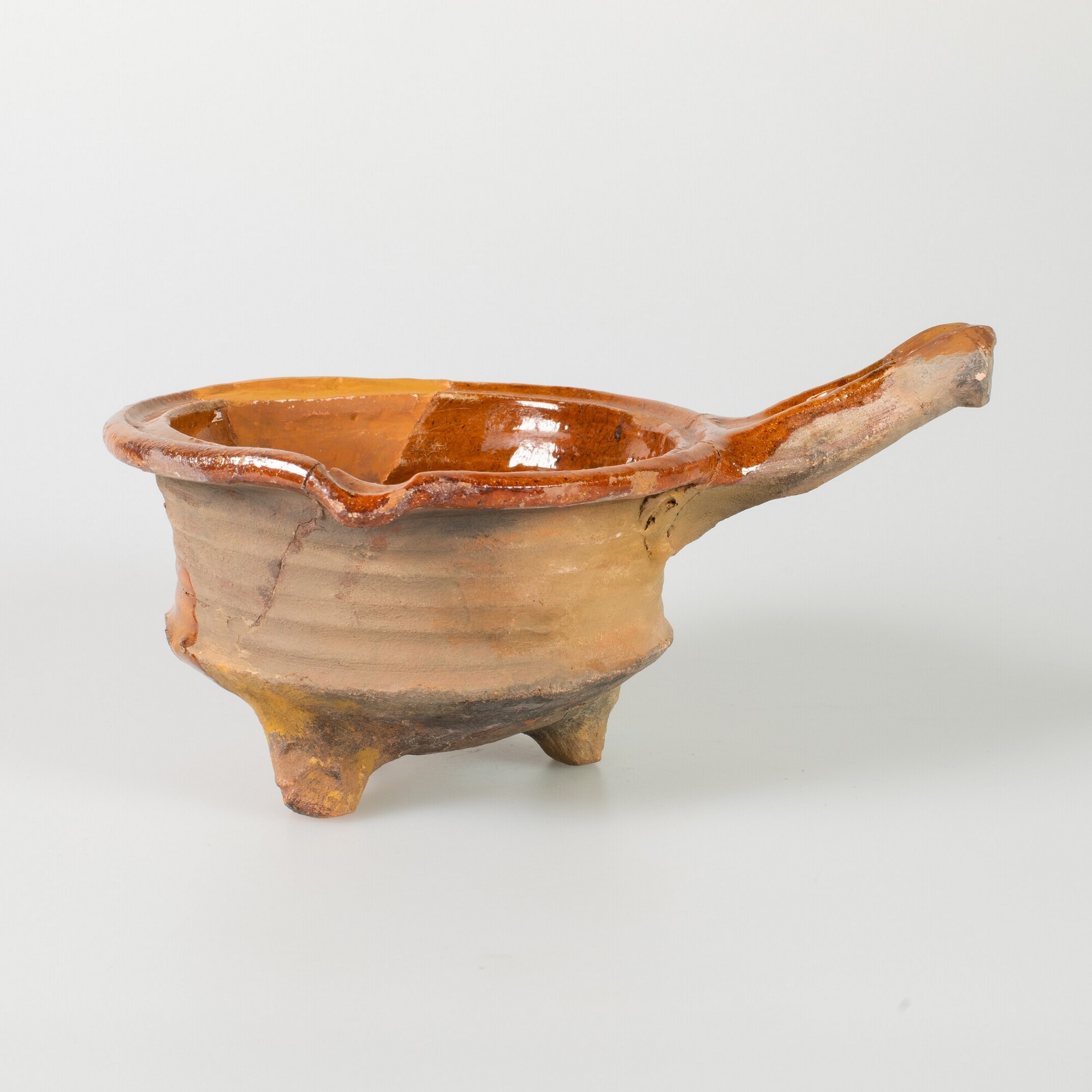 Steelkom; r-stk-5; steelkom met scherpe knik bodem-wand en uitgebogen rand met dekselgeul, drie poten, kromme geknepen steel, schenklip; roodbakkend aardewerk; inwendig loodglazuur; bodem beroet; herkomst: West-Nederland