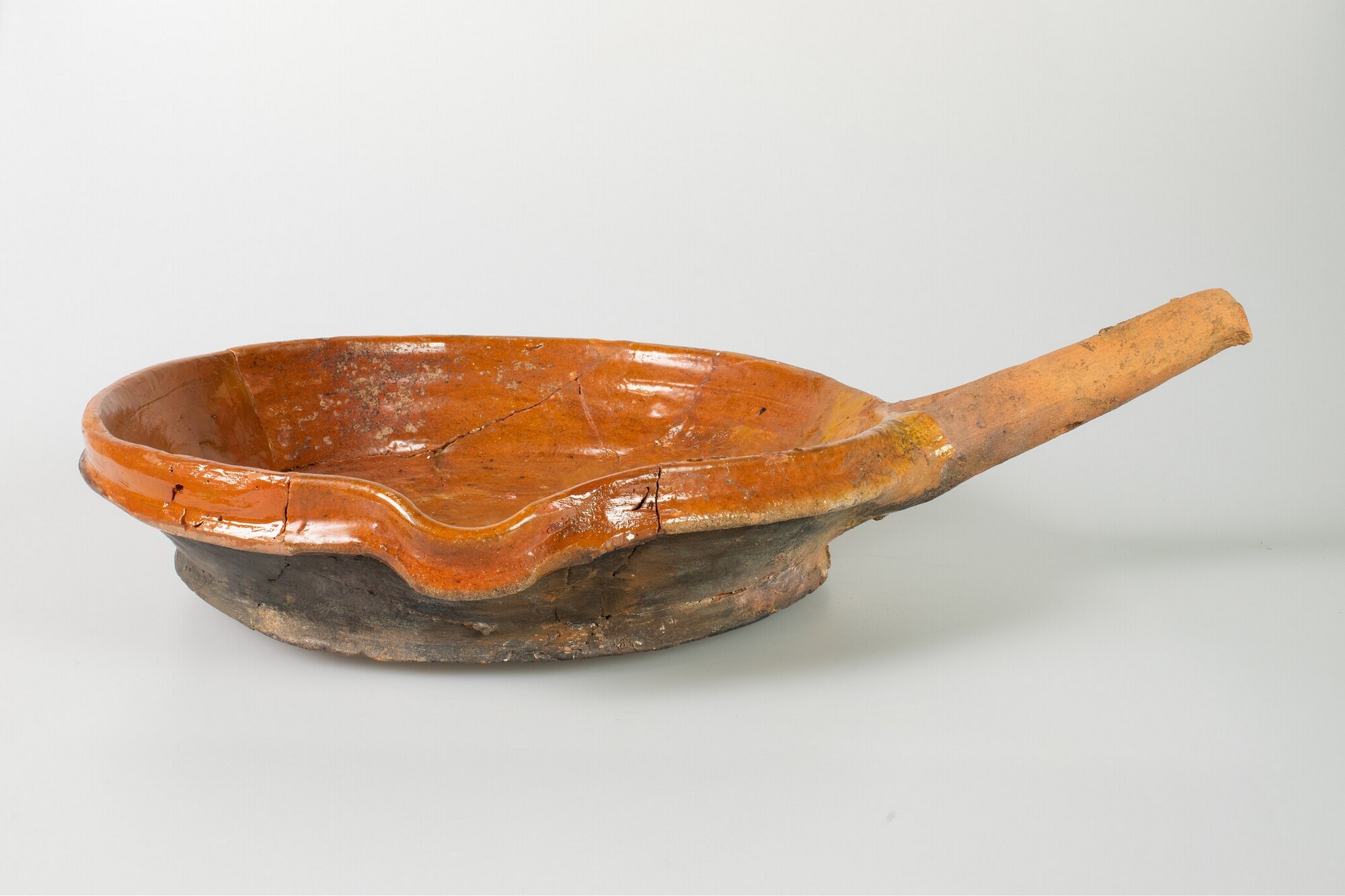 Bakpan; r-bak-4; bakpan met zijwand en kraagrand; opstaande geknepen steel, schenklip; roodbakkend aardewerk; inwendig loodglazuur; bodem beroet; herkomst: West-Nederland