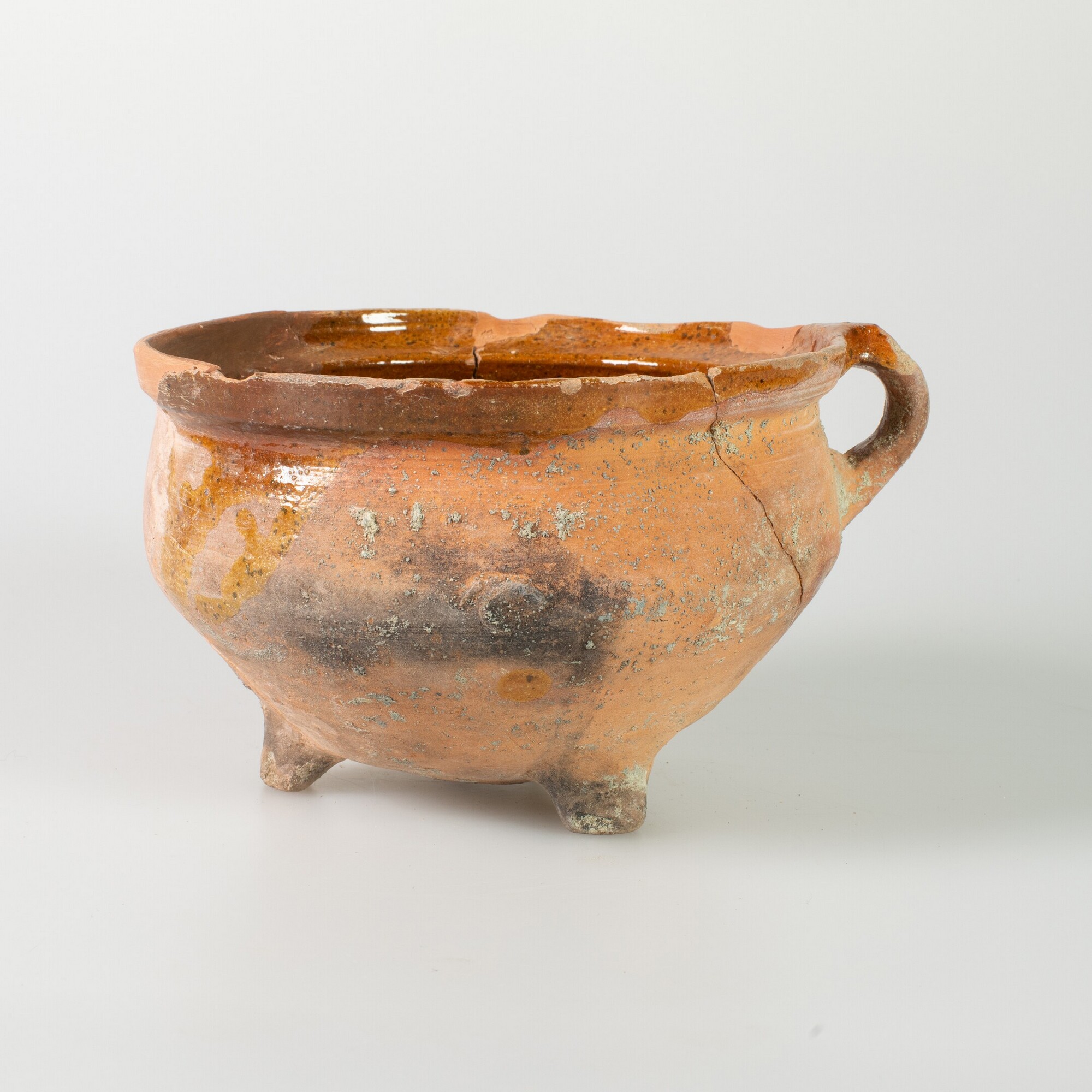 Grape; r-gra-116; wijde grape met afgeronde buikknik en kraagrand met dekselgeul, drie poten, verticaal geknepen lintoor; roodbakkend aardewerk; inwendig loodglazuur; bodem licht beroet; herkomst: Nederland of Duitsland