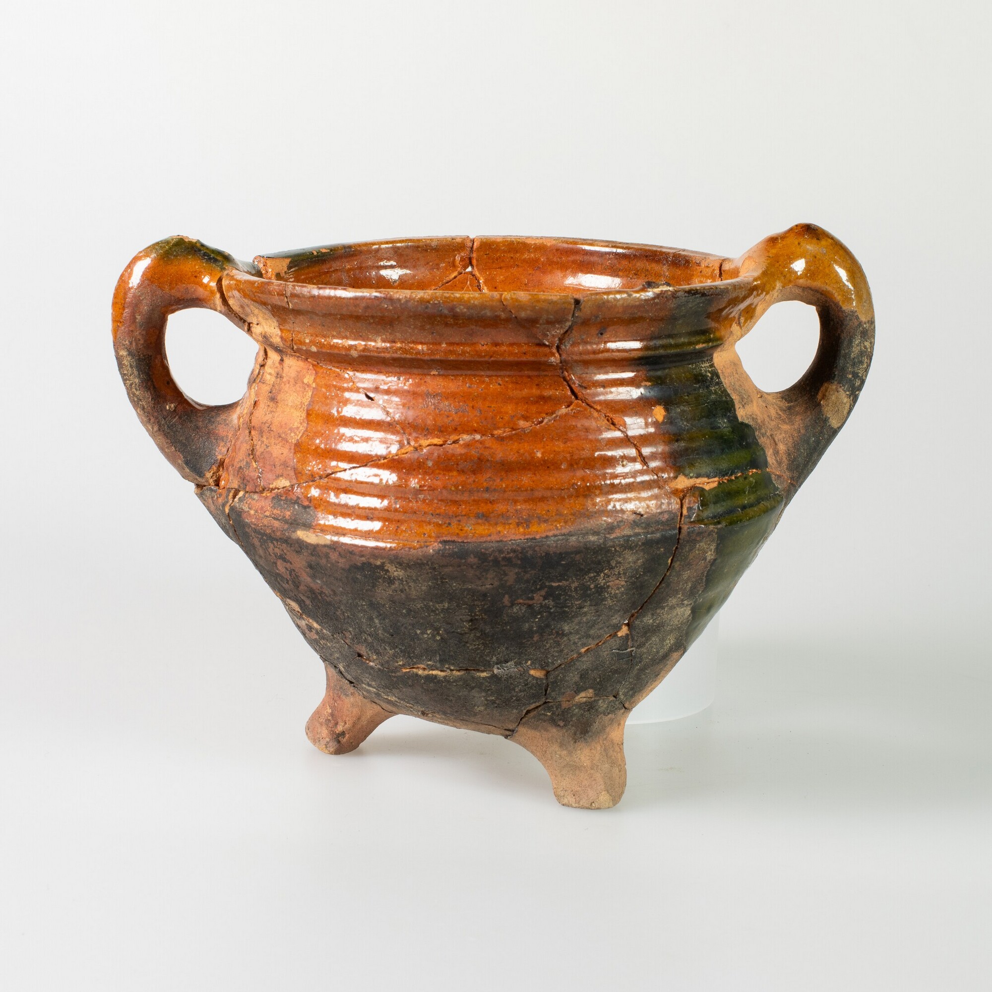 Grape; r-gra-117; biconische grape met scherpe buikknik en uitstaande manchetrand met lip aan binnenzijde, drie poten, twee verticale worstoren; roodbakkend aardewerk; loodglazuur; tweedekeus product: vlekken van loodglazuur met koperoxide op object; bodem beroet; herkomst: West-Nederland