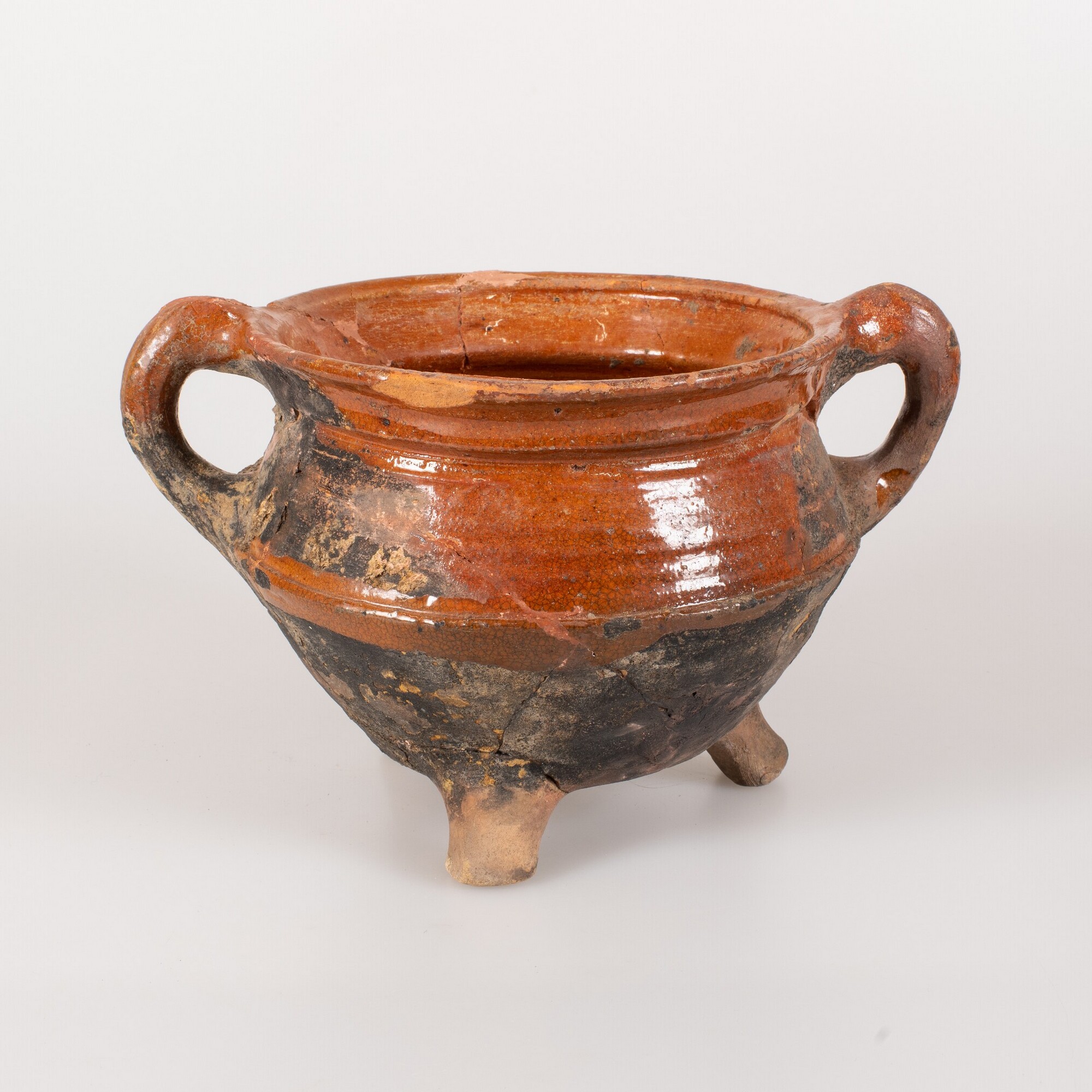 Grape; r-gra-117; biconische grape met scherpe buikknik en uitstaande manchetrand met lip aan binnenzijde, drie poten, twee verticale worstoren; roodbakkend aardewerk; loodglazuur; bodem beroet; herkomst: West-Nederland