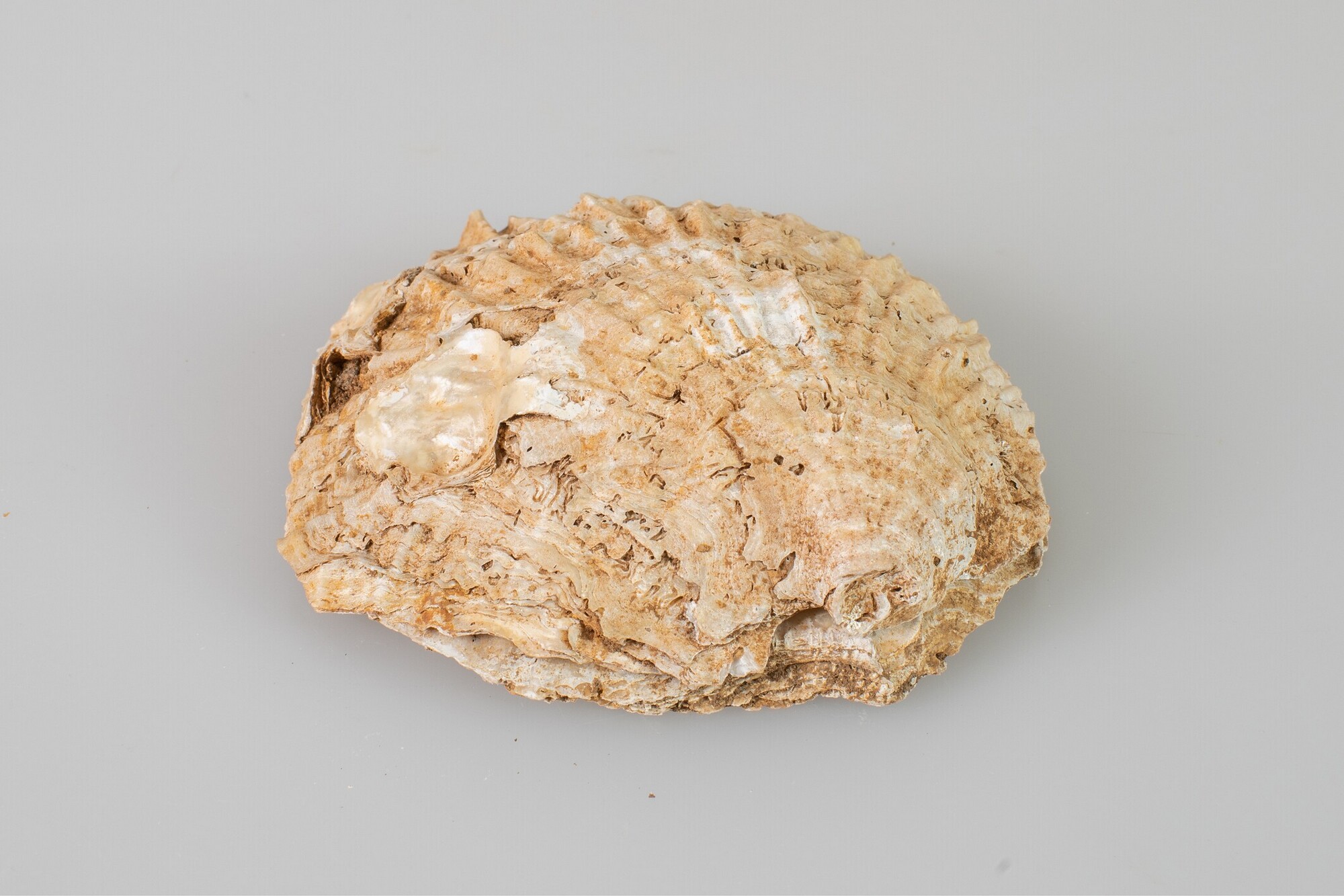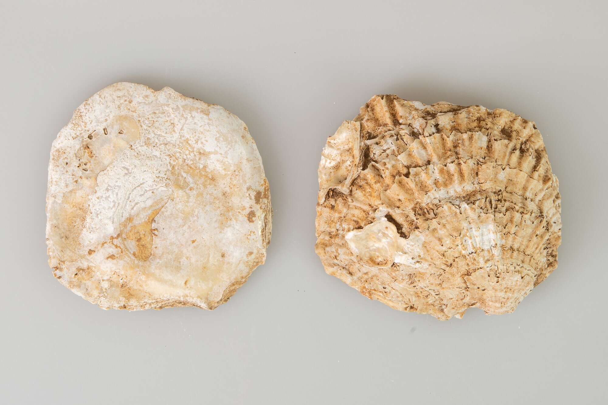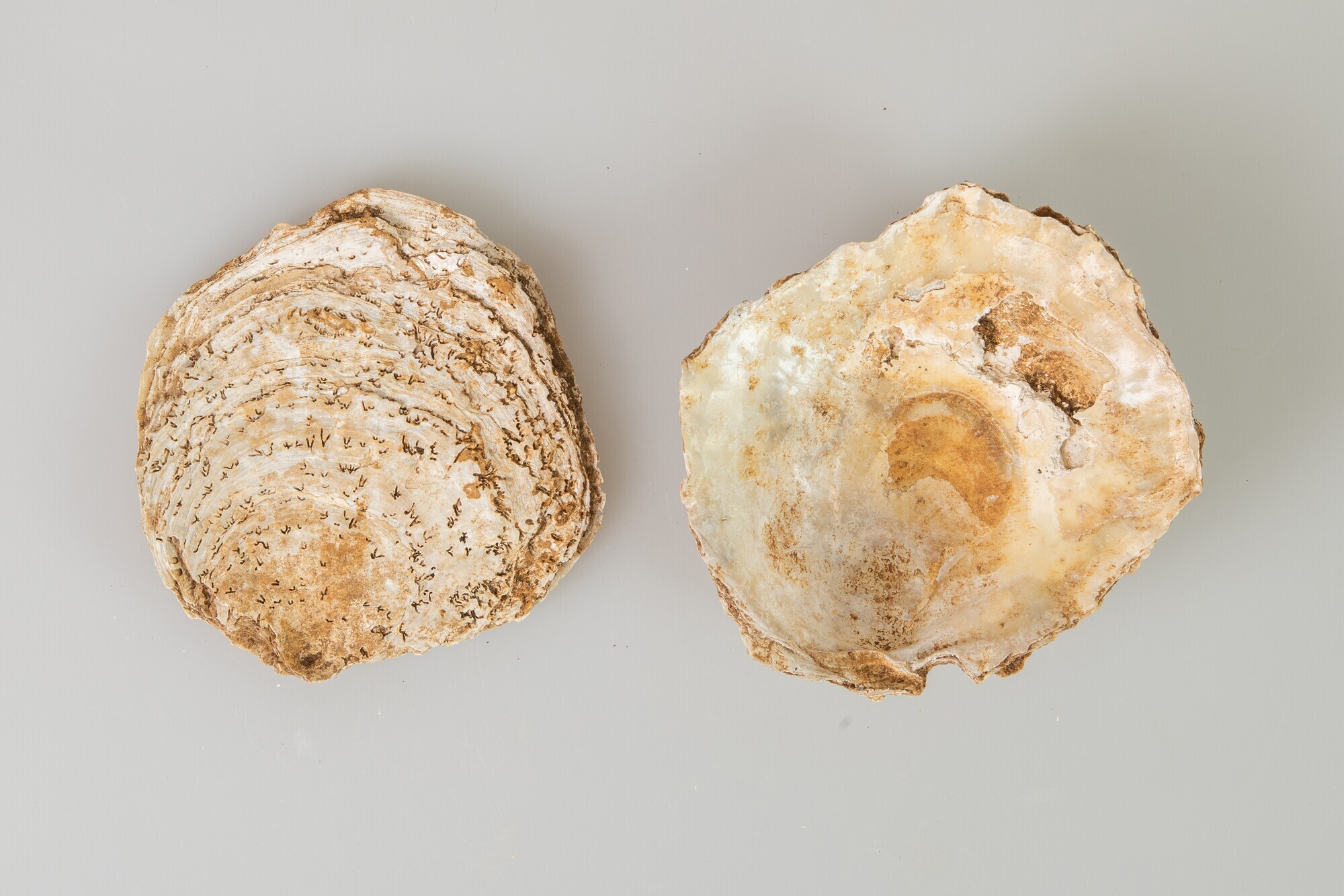 Oesterschelp (Ostrea edulis); losse passende boven en onderklep; herkomst: Noordzee