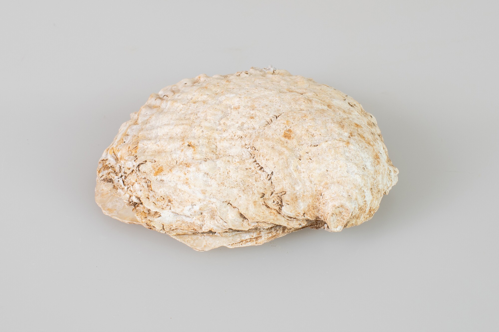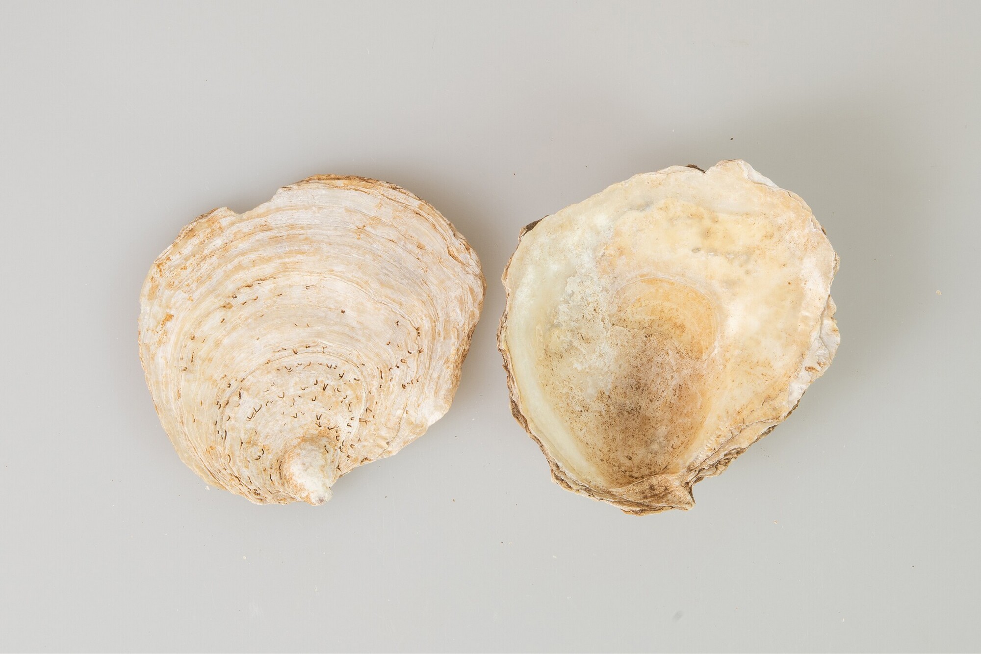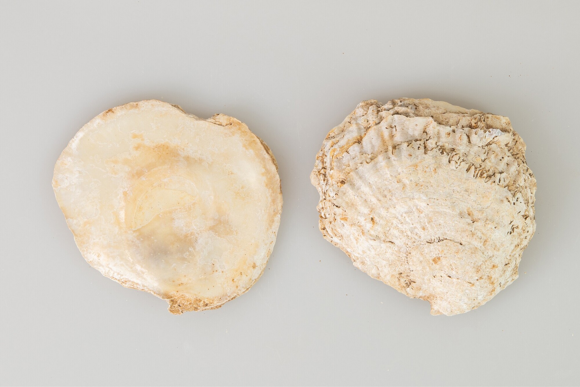 Oesterschelp (Ostrea edulis); losse passende boven en onderklep; herkomst: Noordzee