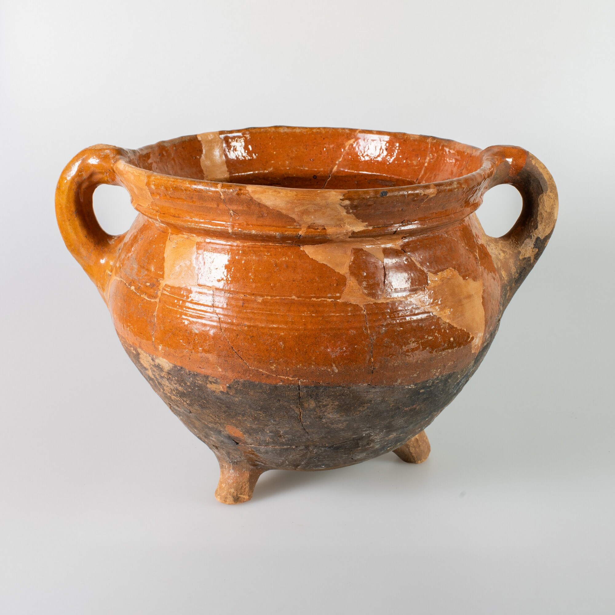Grape; r-gra-10; bolle grape met kraagrand met dekselgeul, drie poten, twee verticale worstoren; roodbakkend aardewerk; loodglazuur; bodem beroet; herkomst: West-Nederland
