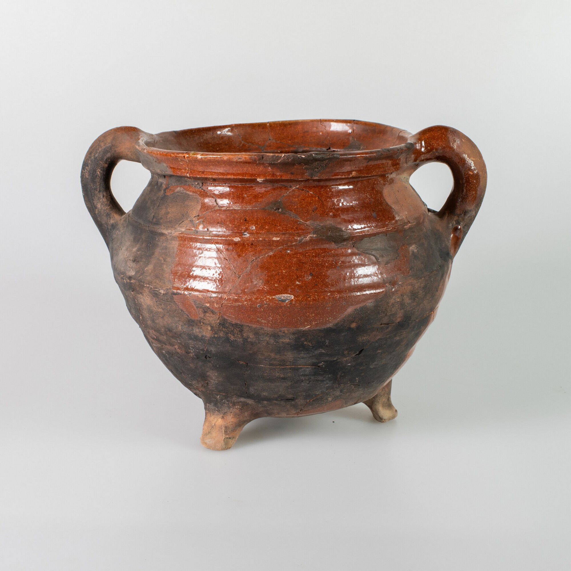Grape; r-gra-34; bolle grape met scherpe buikknik, ribbels op schouder en kraagrand met dekselgeul, drie poten, twee verticale worstoren; roodbakkend aardewerk; loodglazuur; tweedekeus product: rand misvormd; uitwendig beroet; herkomst: West-Nederland