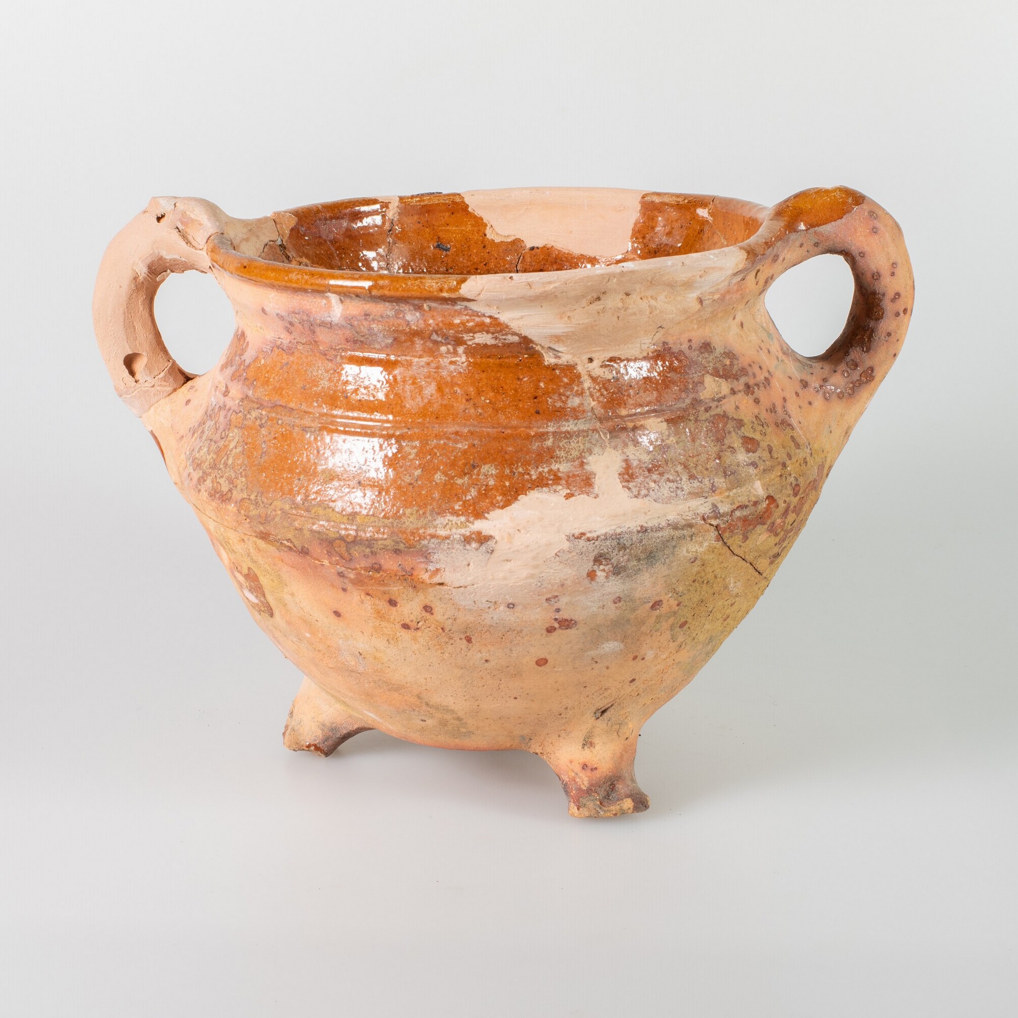 Grape; r-gra-34; bolle grape met scherpe buikknik, ribbels op schouder en kraagrand met dekselgeul, drie poten, twee verticale worstoren; roodbakkend aardewerk; loodglazuur; herkomst: West-Nederland