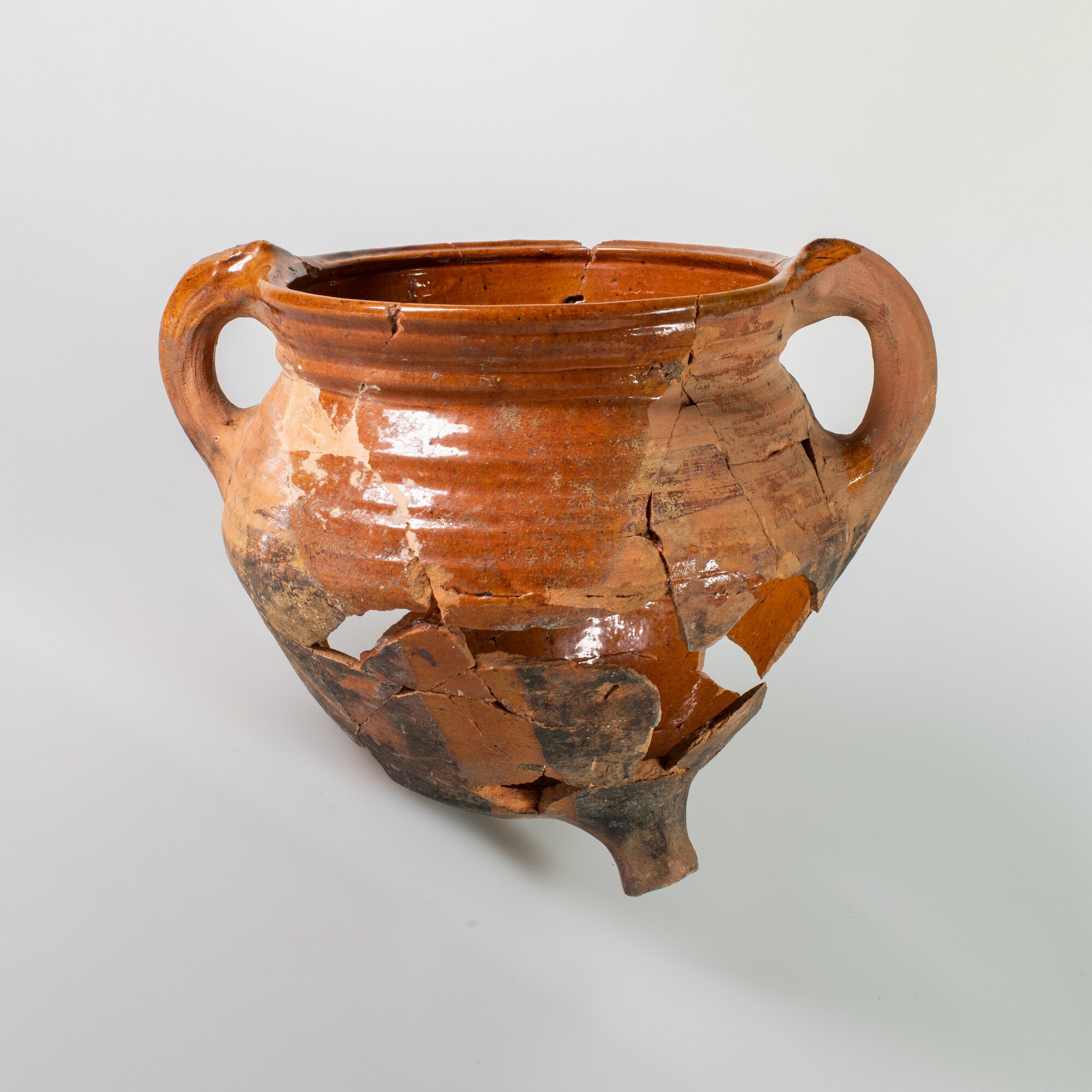 Grape; r-gra-54; grape met afgeronde buikknik, geribbelde kraagrand met dekselgeul, drie poten, twee verticale worstoren; roodbakkend aardewerk; loodglazuur; bodem beroet; herkomst: West-Nederland