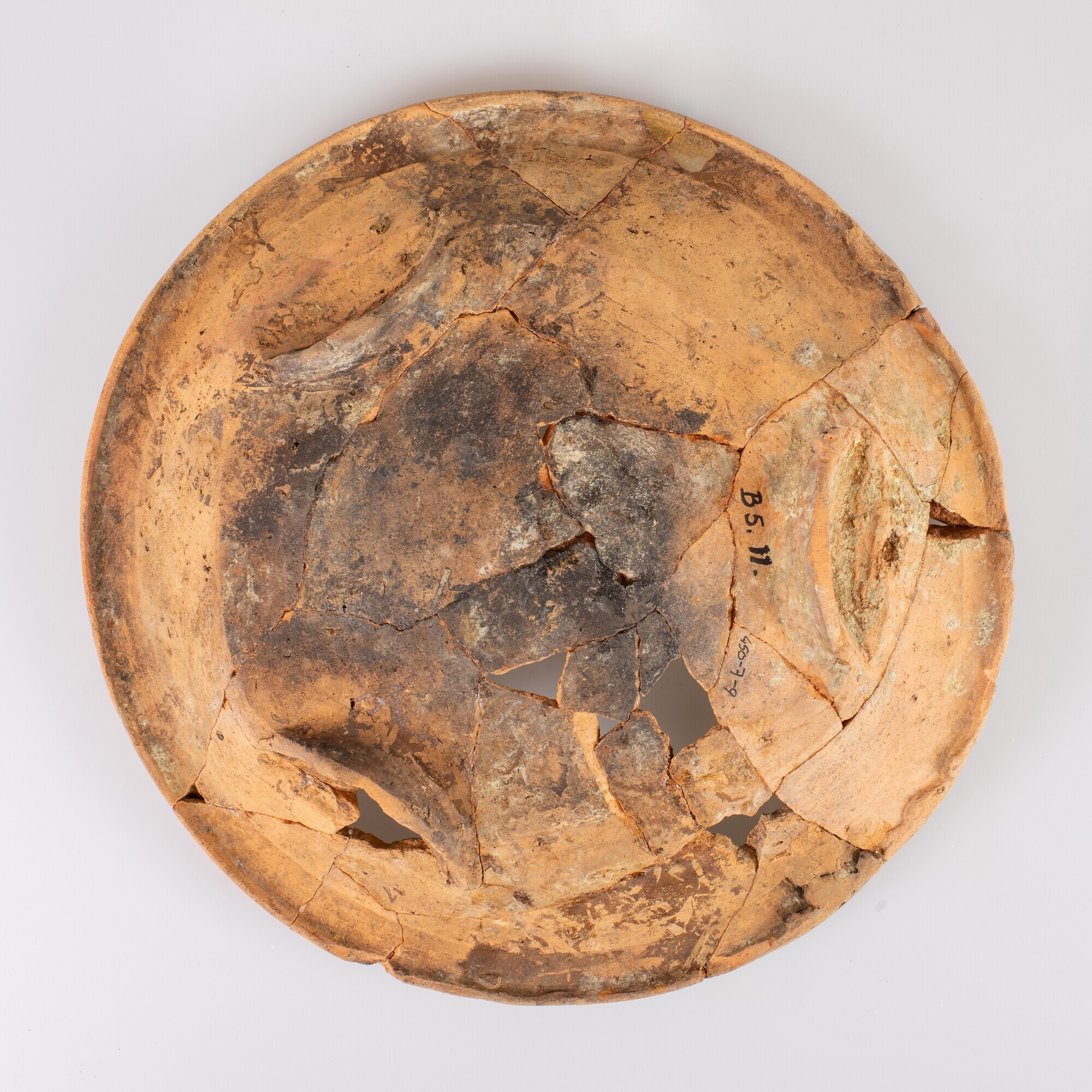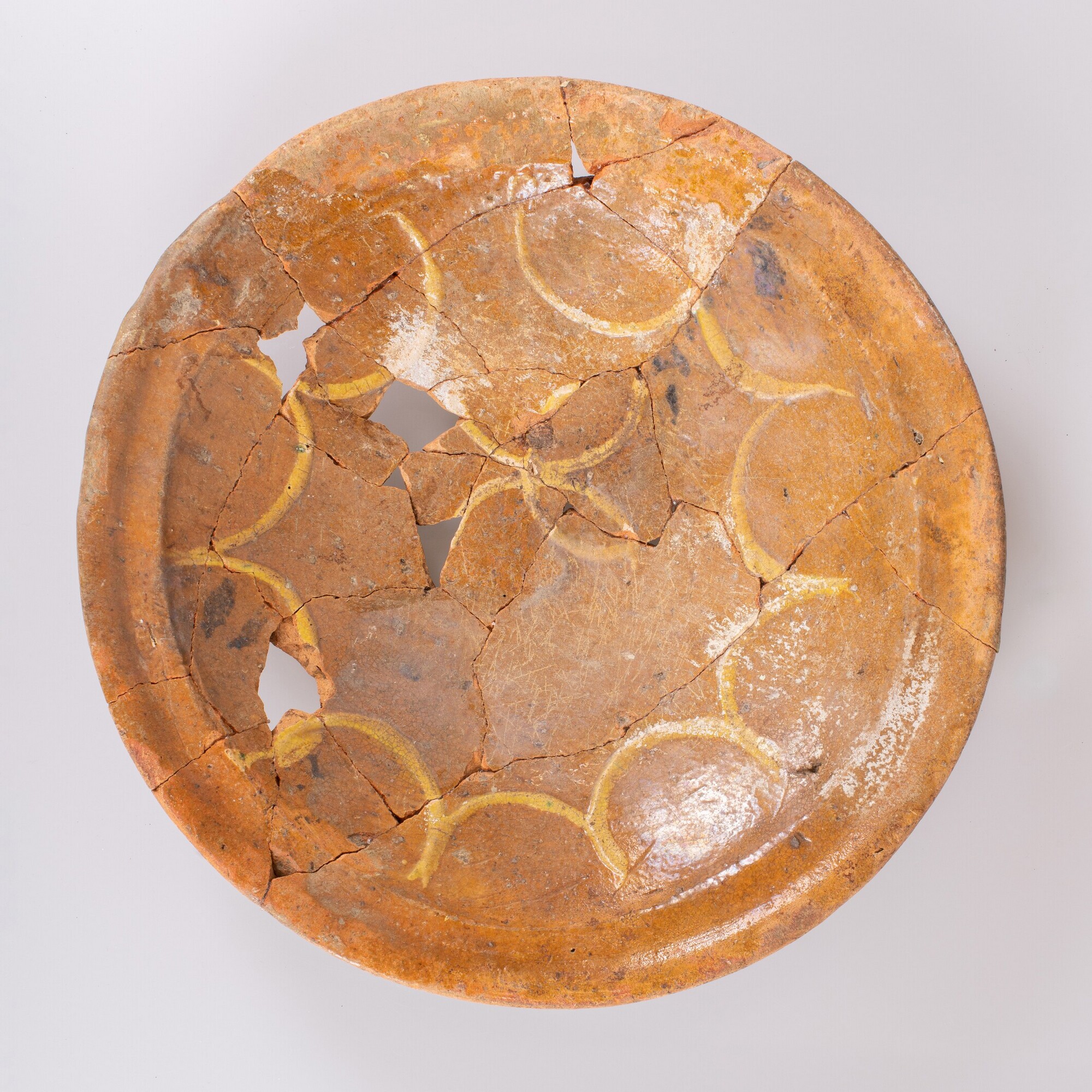 Bord; r-bor-6; bord met holle spiegel, platte vlag met van buiten aangedrukte rand, drie standlobben; roodbakkend aardewerk; inwendig loodglazuur; slibversiering: spiegel: boogjes van witte kleislib; bodem beroet, bestekkrassen op spiegel; herkomst: West-Nederland