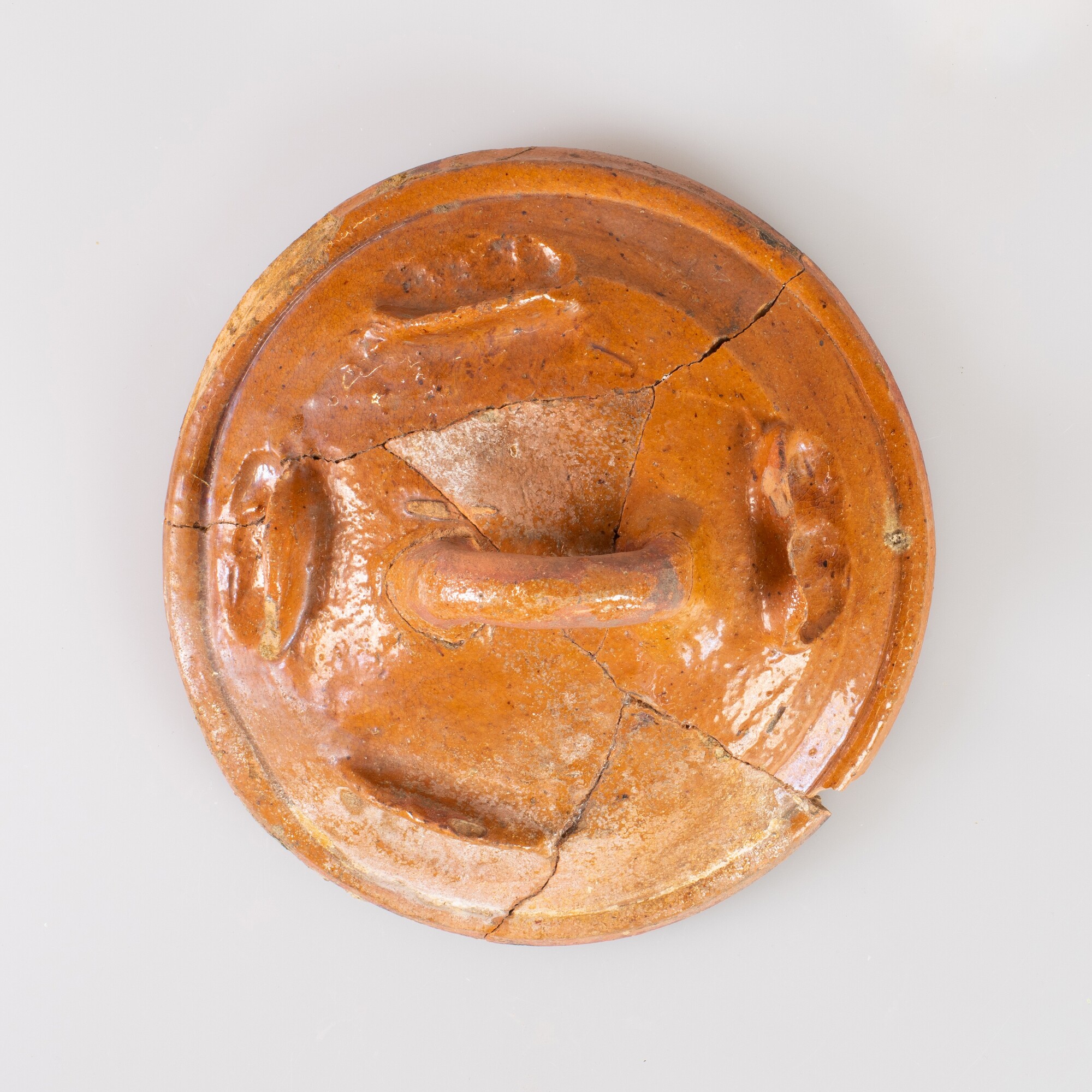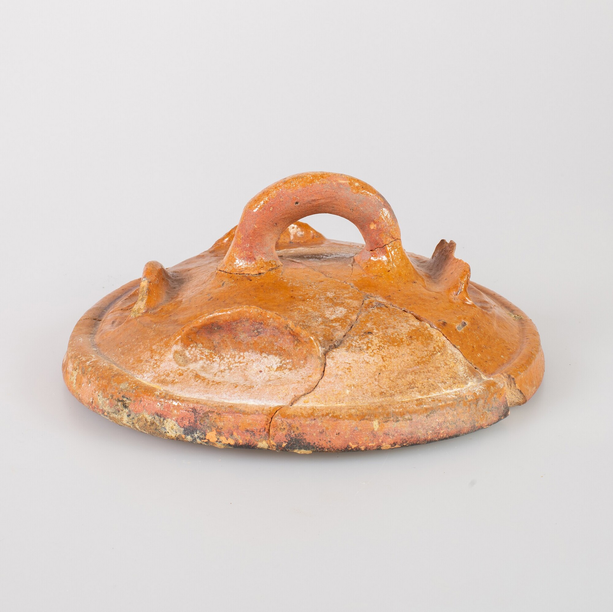Deksel; r-dek-21; deksel met afgeschuinde rand, opstaand worstoor, vier lobben bol; roodbakkend aardewerk; uitwendig loodglazuur; tweedekeus product: resten van aangebakken voorwerp aan bovenzijde; inwendig beroet; herkomst: Nederland