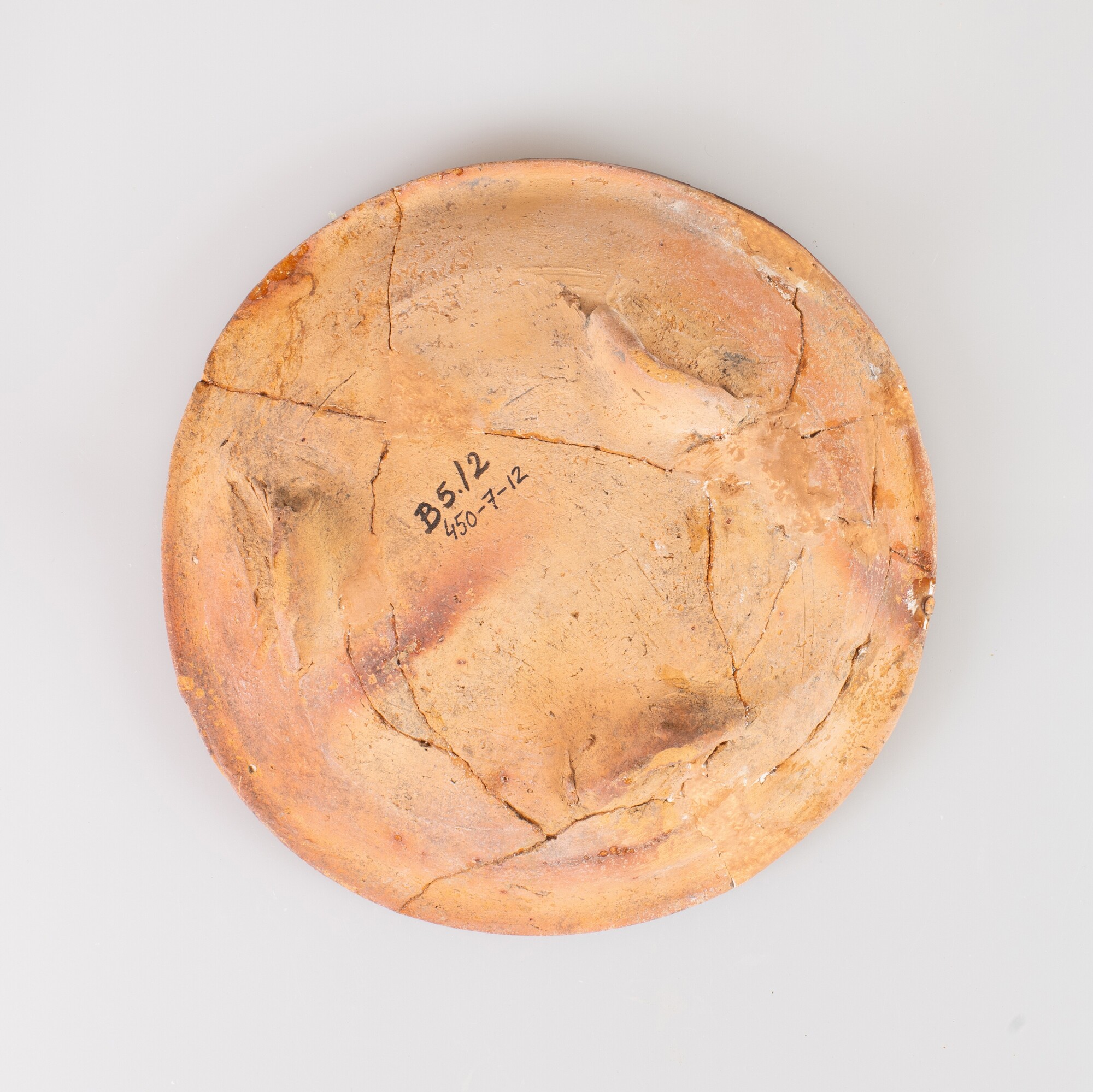 Bord; r-bor-6; bord met holle spiegel en korte platte vlag met van buiten aangedrukte rand, drie standlobben; roodbakkend aardewerk; inwendig loodglazuur; herkomst: West-Nederland