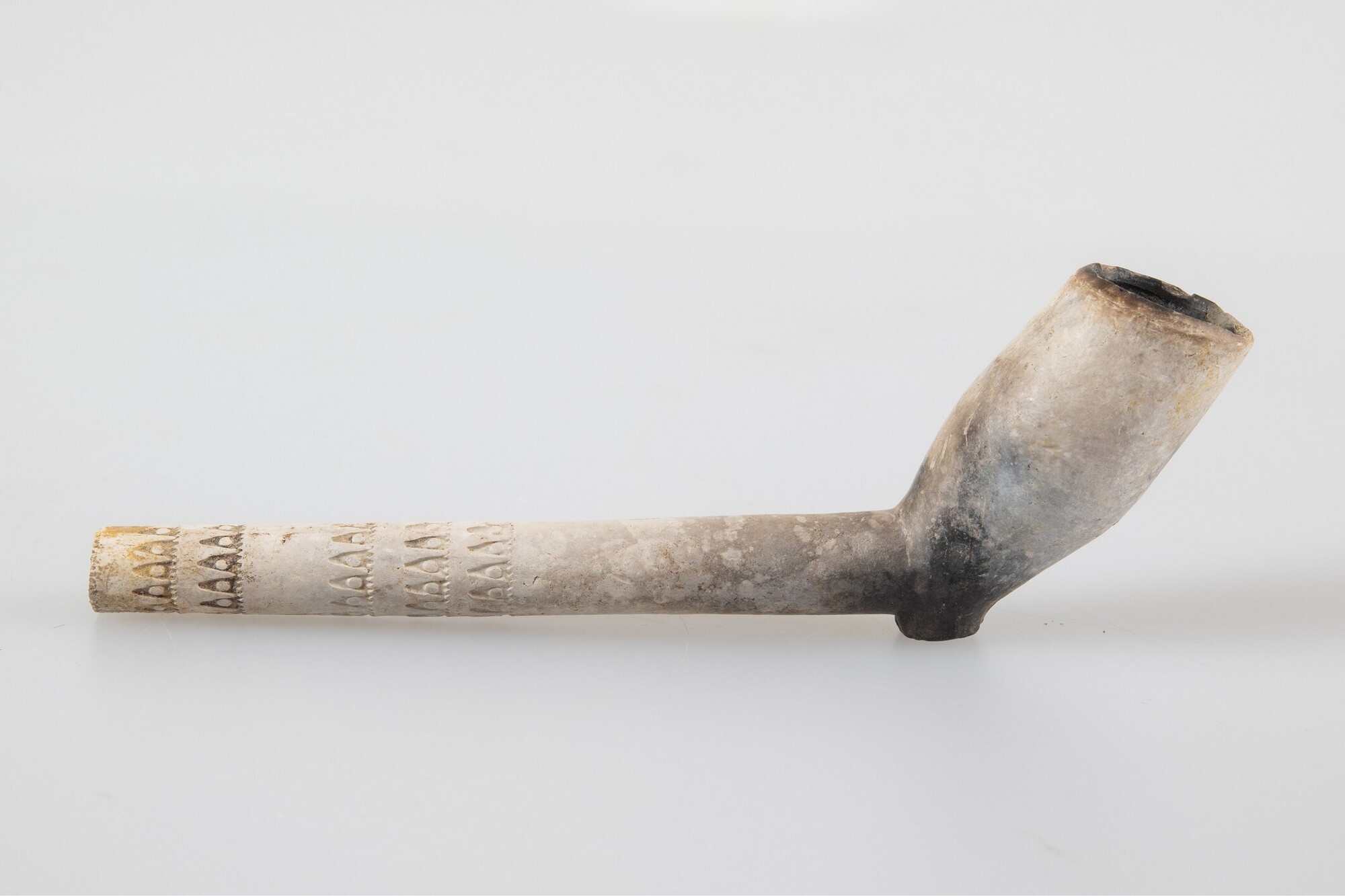 Pijp; trechtervormige ketel; ongeglaasd; ketel gebotterd; radering voorzijde ketelopening; ketel beroet; steelradering met tanden; ongemerkt; herkomst: Nederland