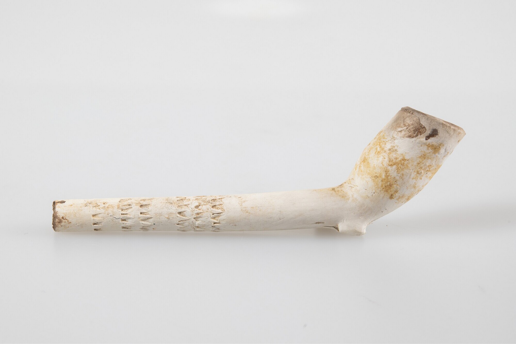 Pijp; trechtervormige ketel; ongeglaasd; ketel gebotterd; radering voorzijde ketelopening; ketel inwendig beroet; steelradering met tanden; ongemerkt; herkomst: Nederland
