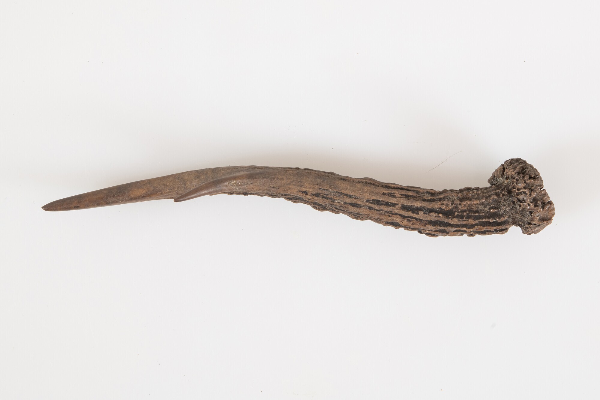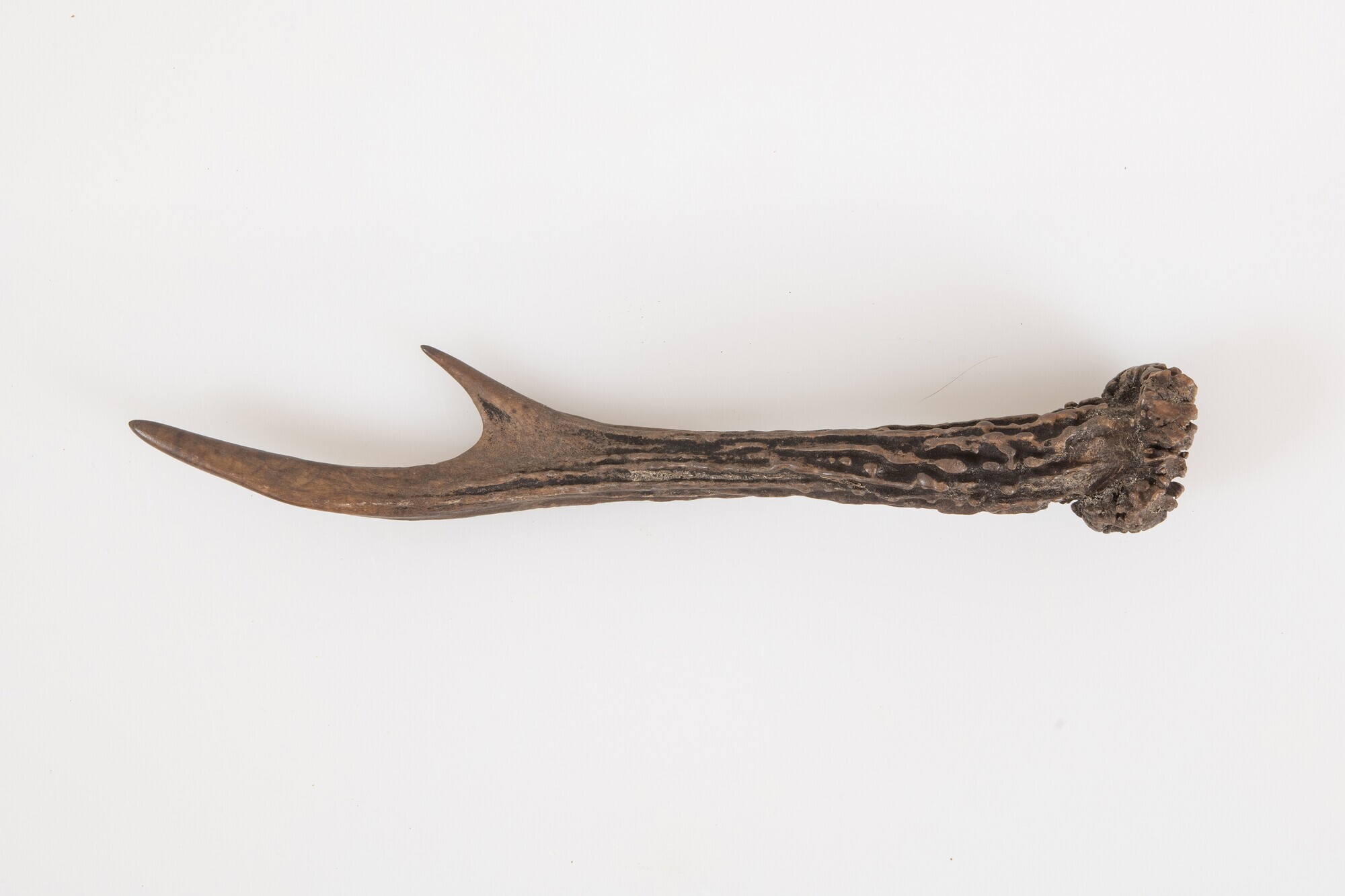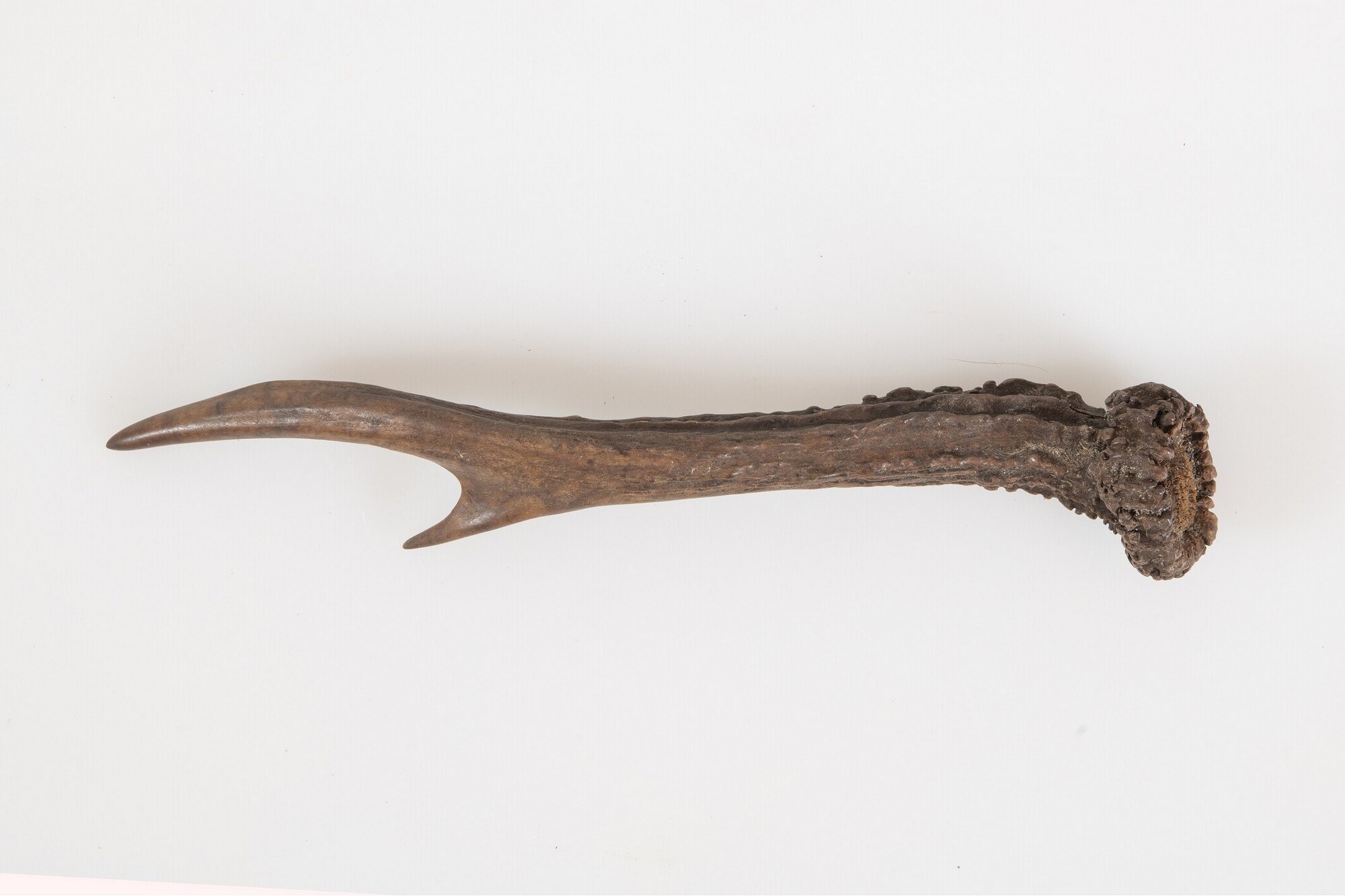 Geweistang van een ree; polijsting op het uiteinde (priem of natuurlijk?)