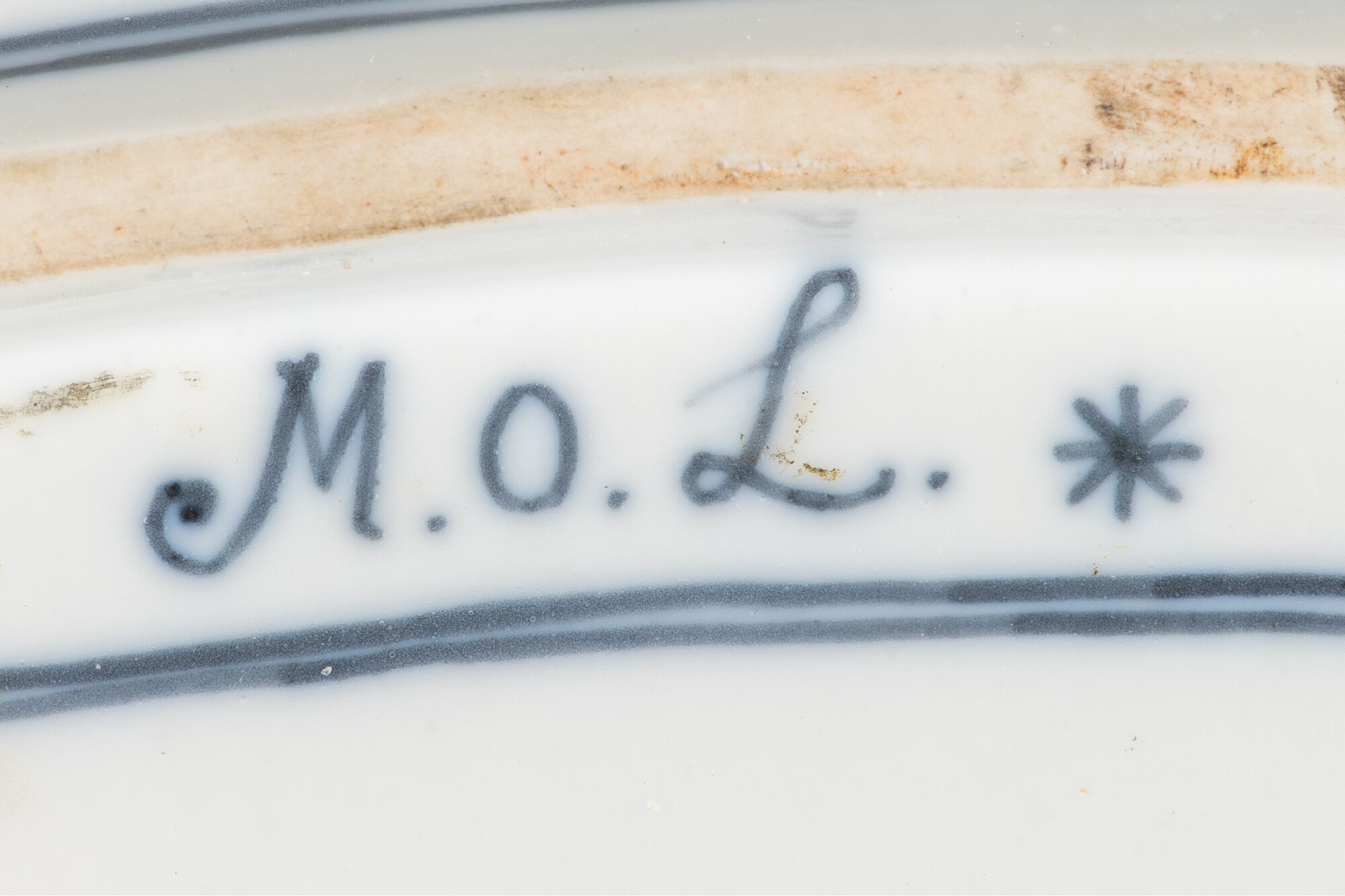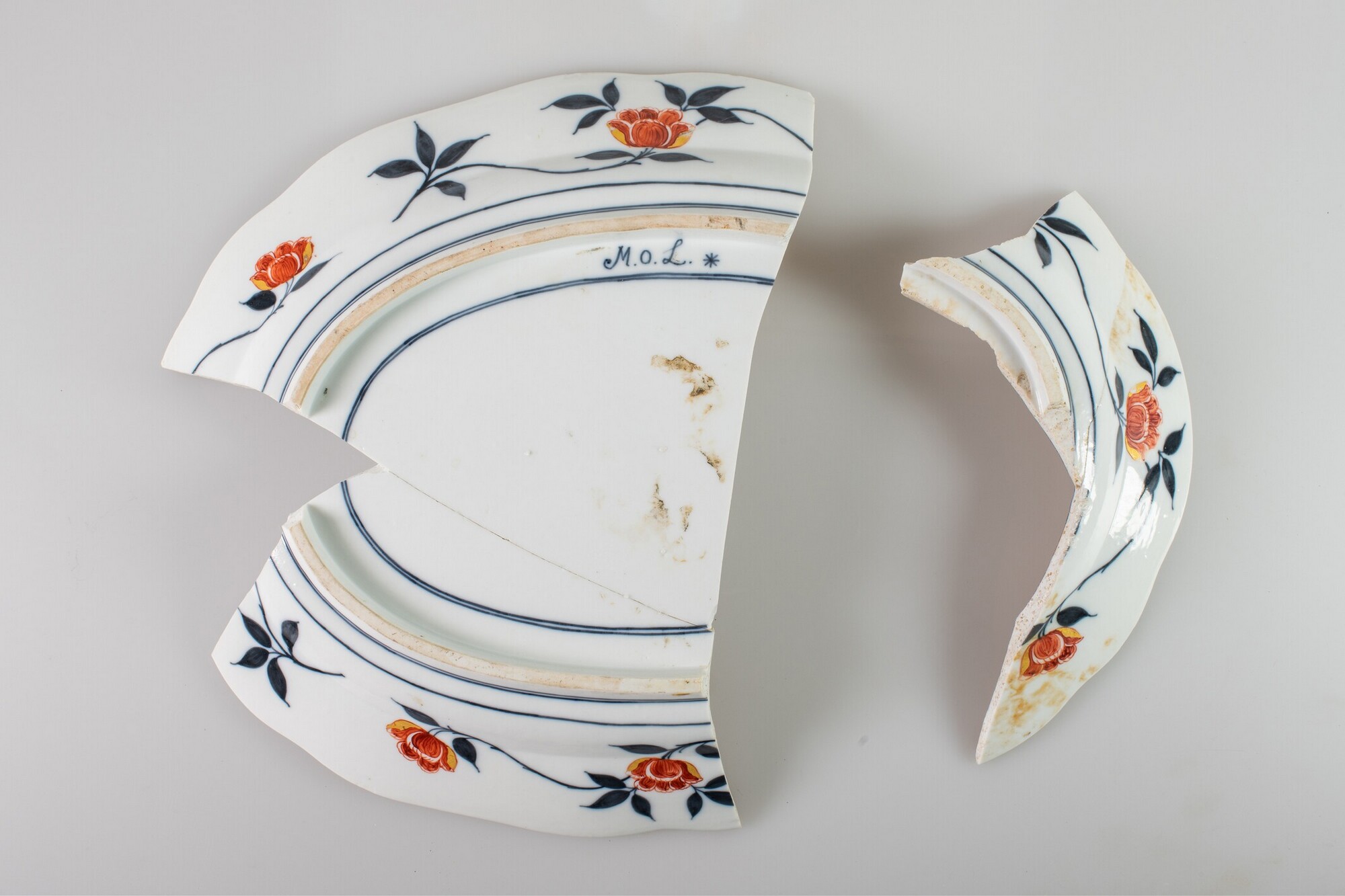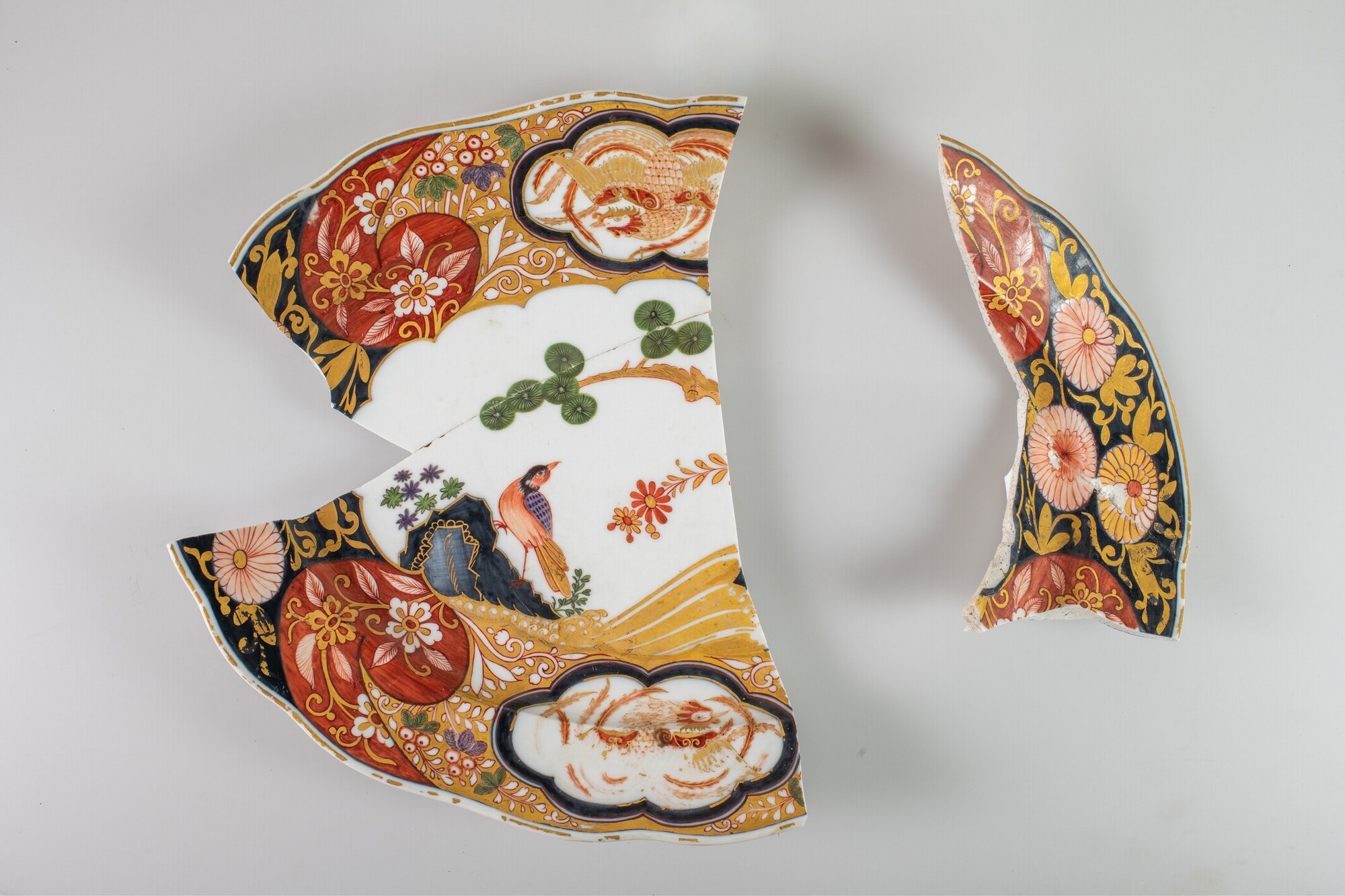 Schaal; ep-sch-1; ovale schaal met platte vlag, standring; Europees porselein; veldspaatglazuur; accoladerand; onderglazuur blauwe beschildering met overglazuur beschildering in rood, goud, groen en paars: inwendig, spiegel: vogel op rots in tuin met boom en struik, vlag: twee cartouches met haan omgeven door roccailes met florale motieven, gouden rand; uitwendig: bladertakken met pioenrozen langs rand, drie ...