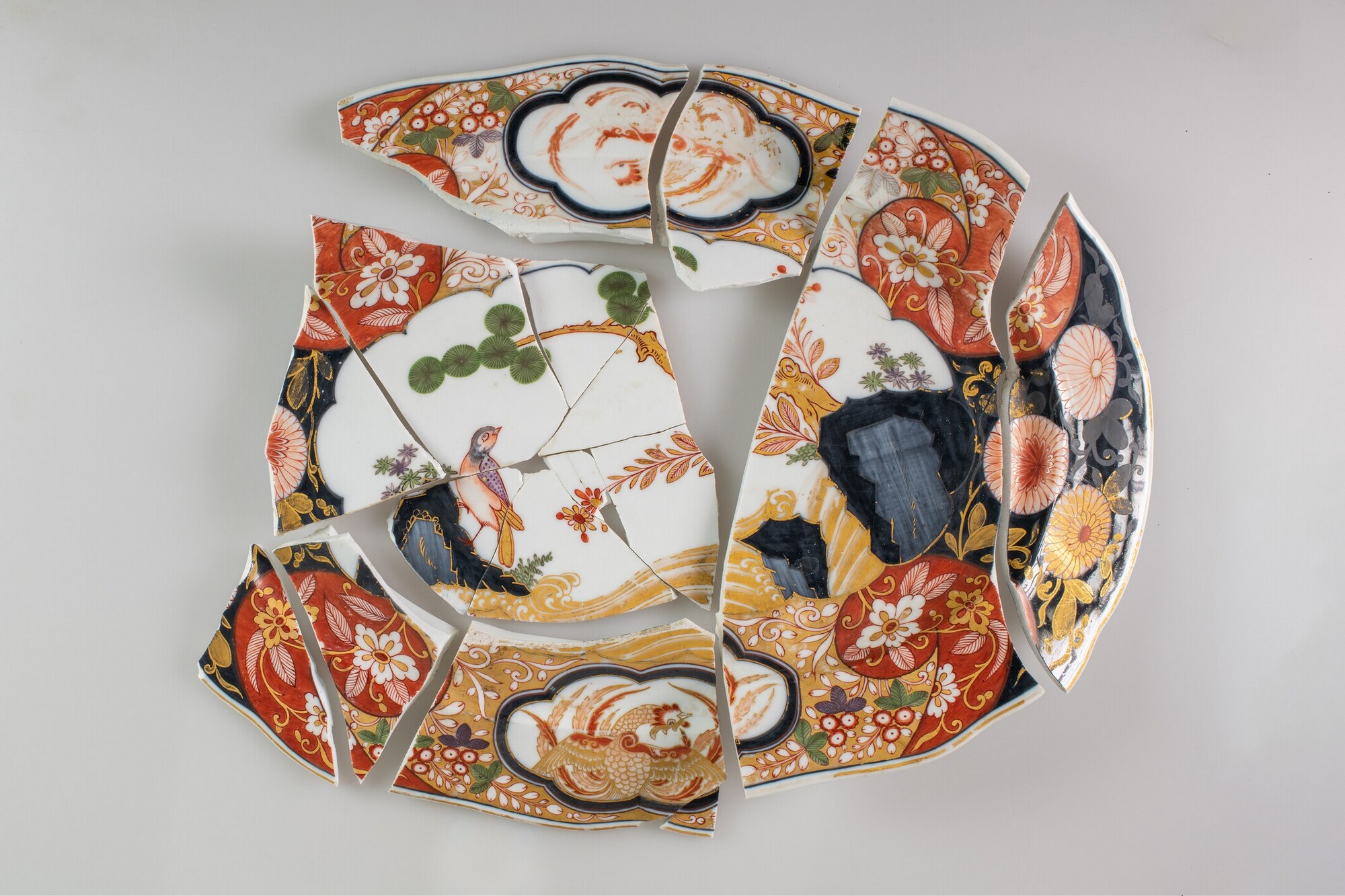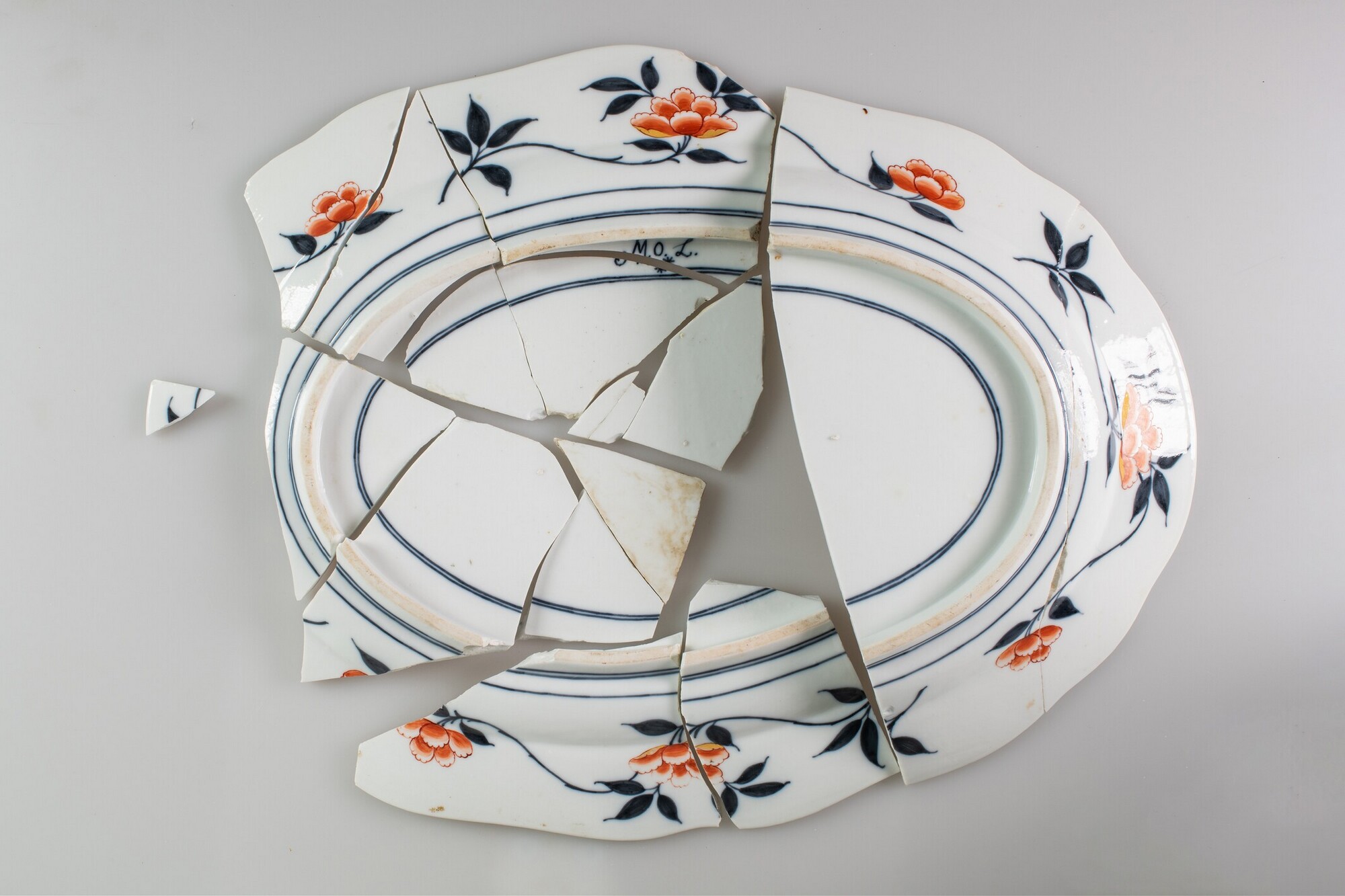 Schaal; ep-sch-1; ovale schaal met platte vlag, standring; Europees porselein; veldspaatglazuur; accoladerand; onderglazuur blauwe beschildering met overglazuur beschildering in rood, goud, groen en paars: inwendig, spiegel: vogel op rots in tuin met boom en struik, vlag: twee cartouches met haan omgeven door roccailes met florale motieven, gouden rand; uitwendig: bladertakken met pioenrozen langs rand, drie ...