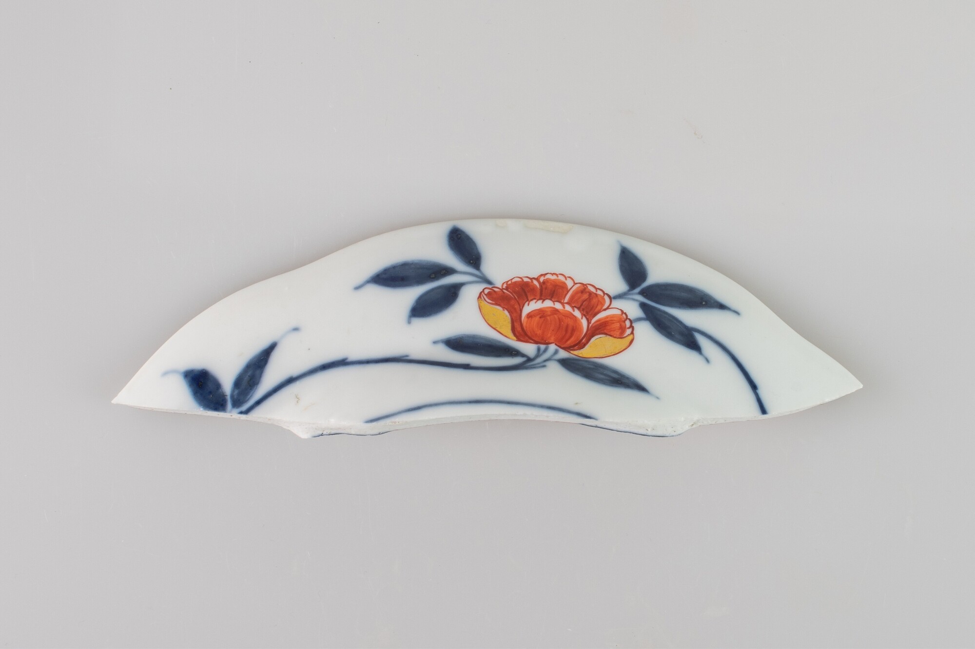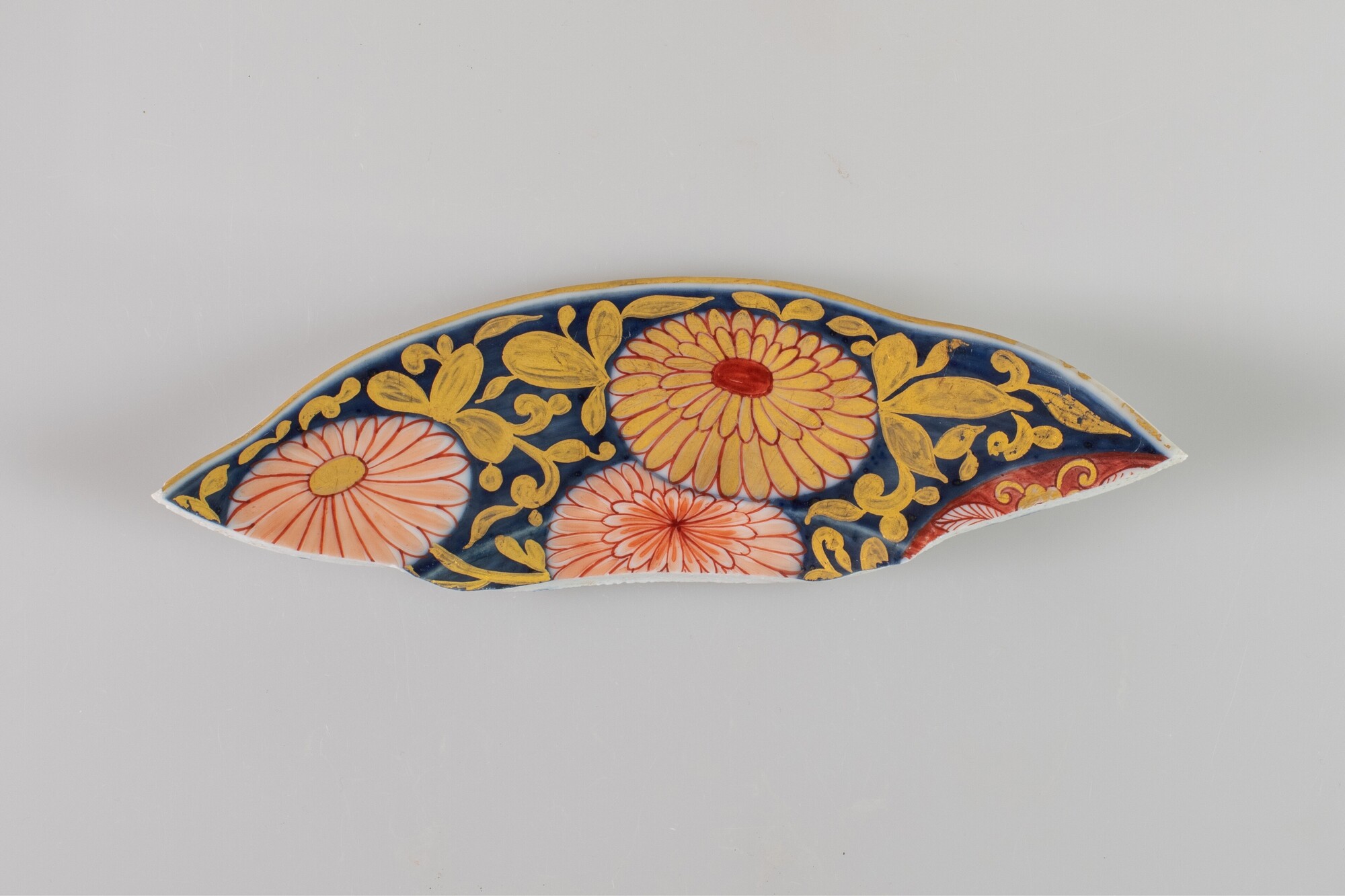 Schaal (fragment); ep-sch-1; ovale schaal met platte vlag, standring; Europees porselein; veldspaatglazuur; accoladerand; onderglazuur blauwe beschildering met overglazuur beschildering in rood en goud, vlag: florale motieven: chrystanten, gouden rand; uitwendig: bladertakken met pioenrozen langs rand; imitatie Japans porselein (Imari); herkomst: Loosdrecht, Manufactuur Oud-Loosdrecht