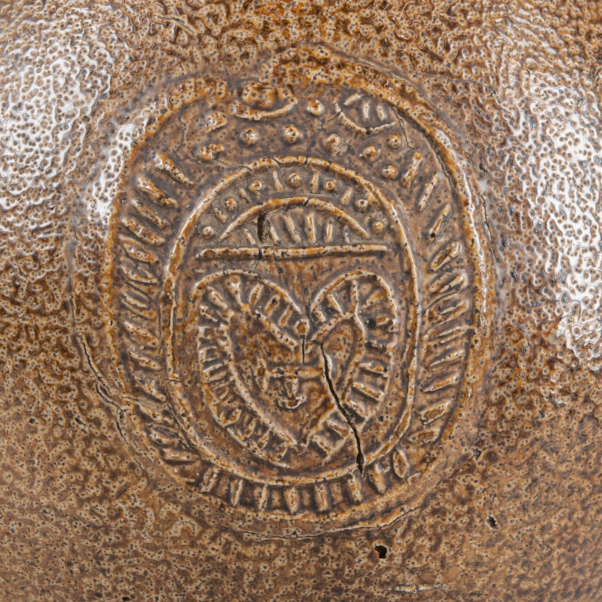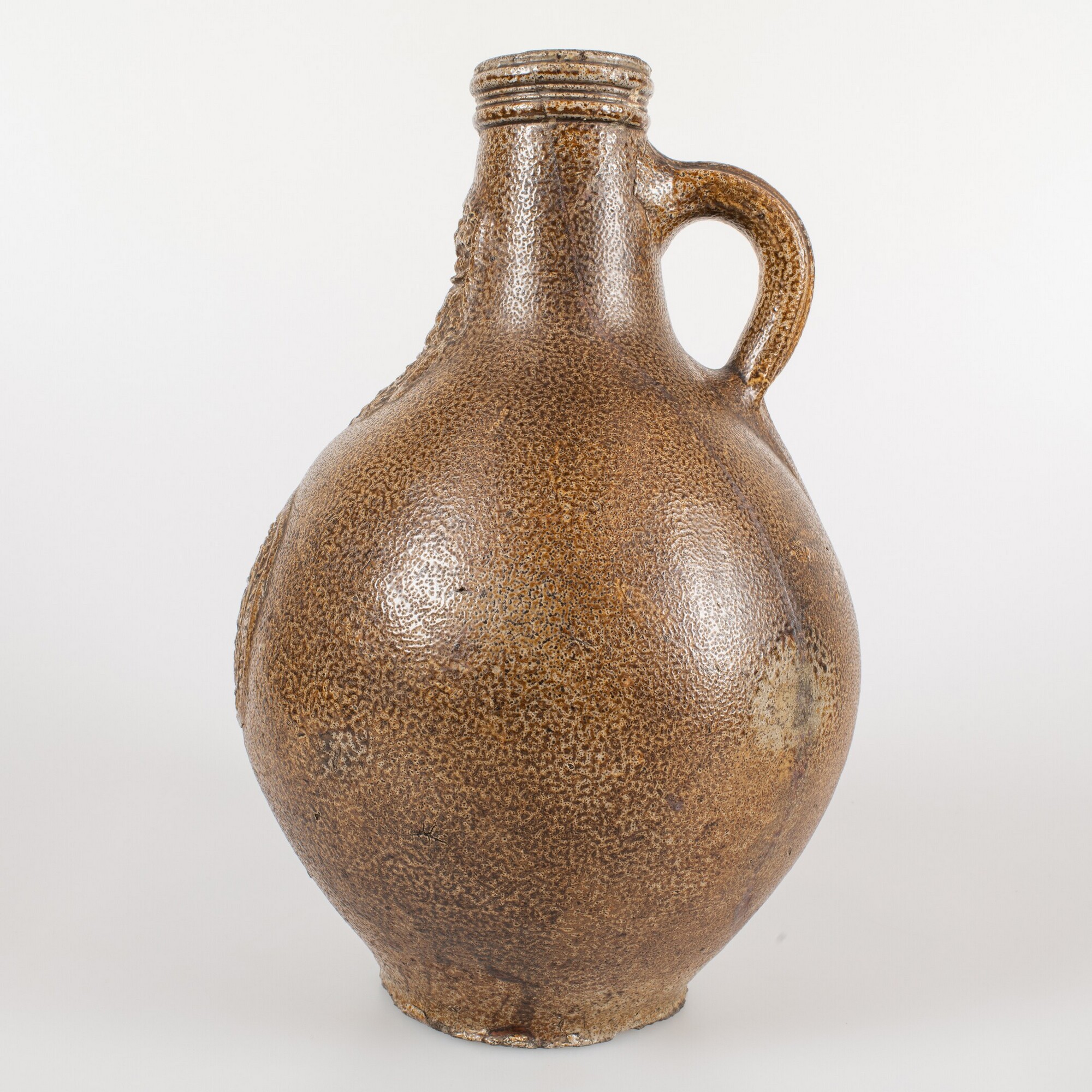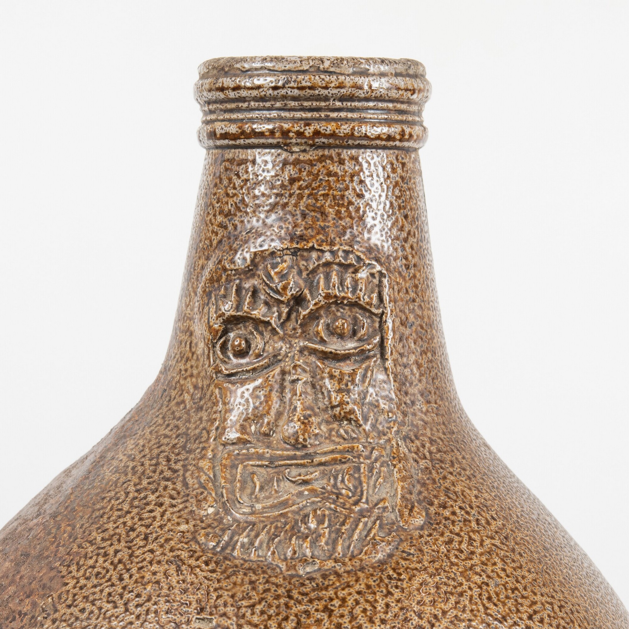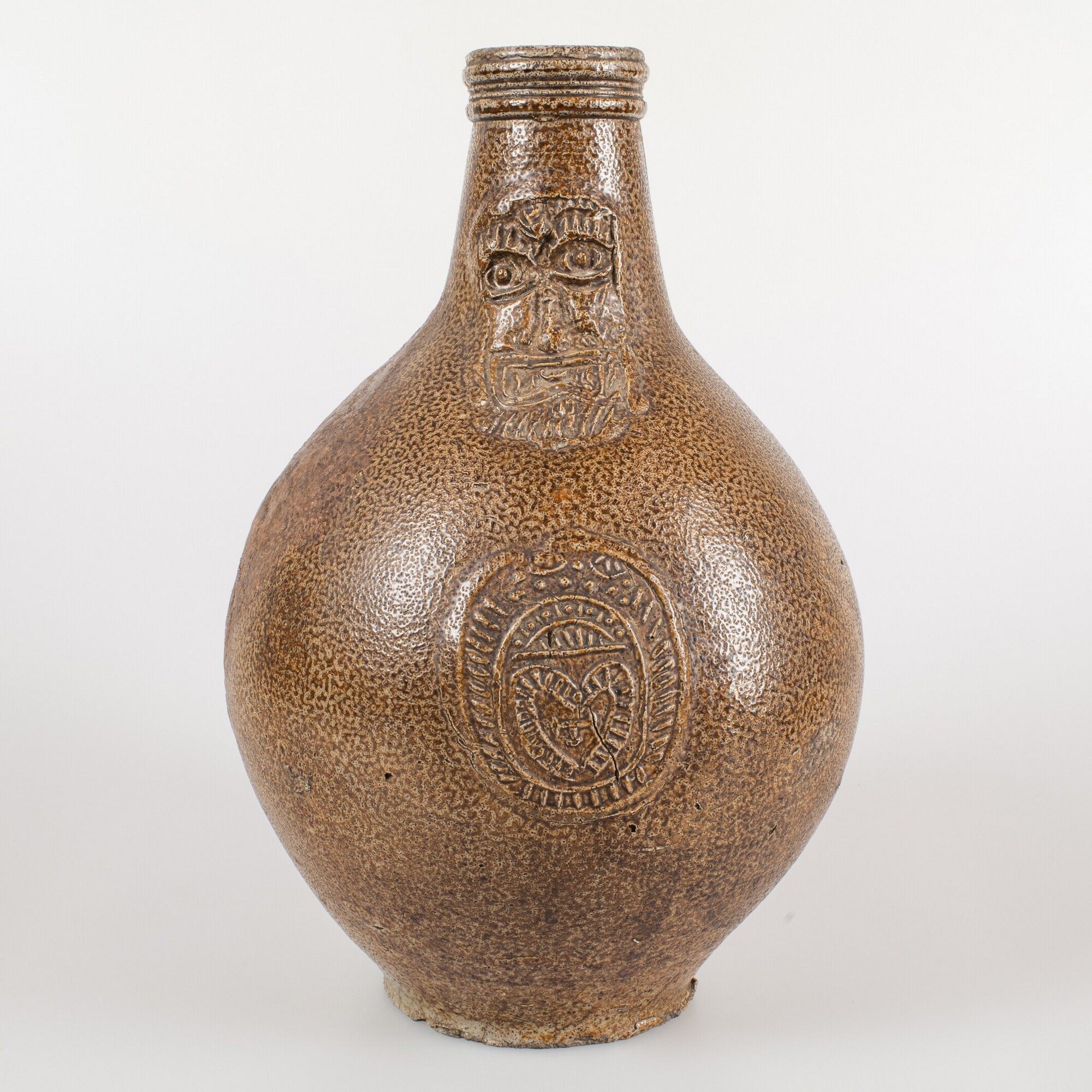 Baardmankruik; s2-kan-32; bolle kan met schouder overgaand in hoge hals met geribbelde kraagrand, standvlak, verticaal lintoor; steengoed met zoutglazuur en ijzerengobe; appliques: baardman op de hals en medaillon met hart op de buik; herkomst: Frechen, Duitsland
