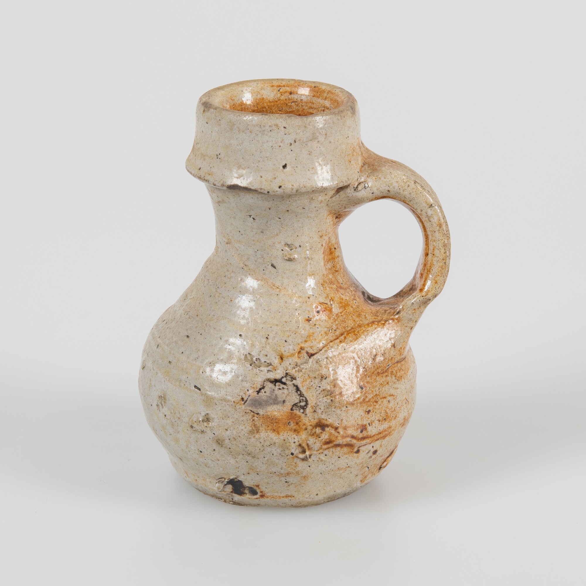 Kan; s2-kan-14; kleine bolle kan met schouder overgaand in hals, kraagrand, standvlak, verticaal lintoor; steengo++ed met oppervlaktebehandeling: ijzerengobe, zoutglazuur; herkomst: Raeren, Rijnland
