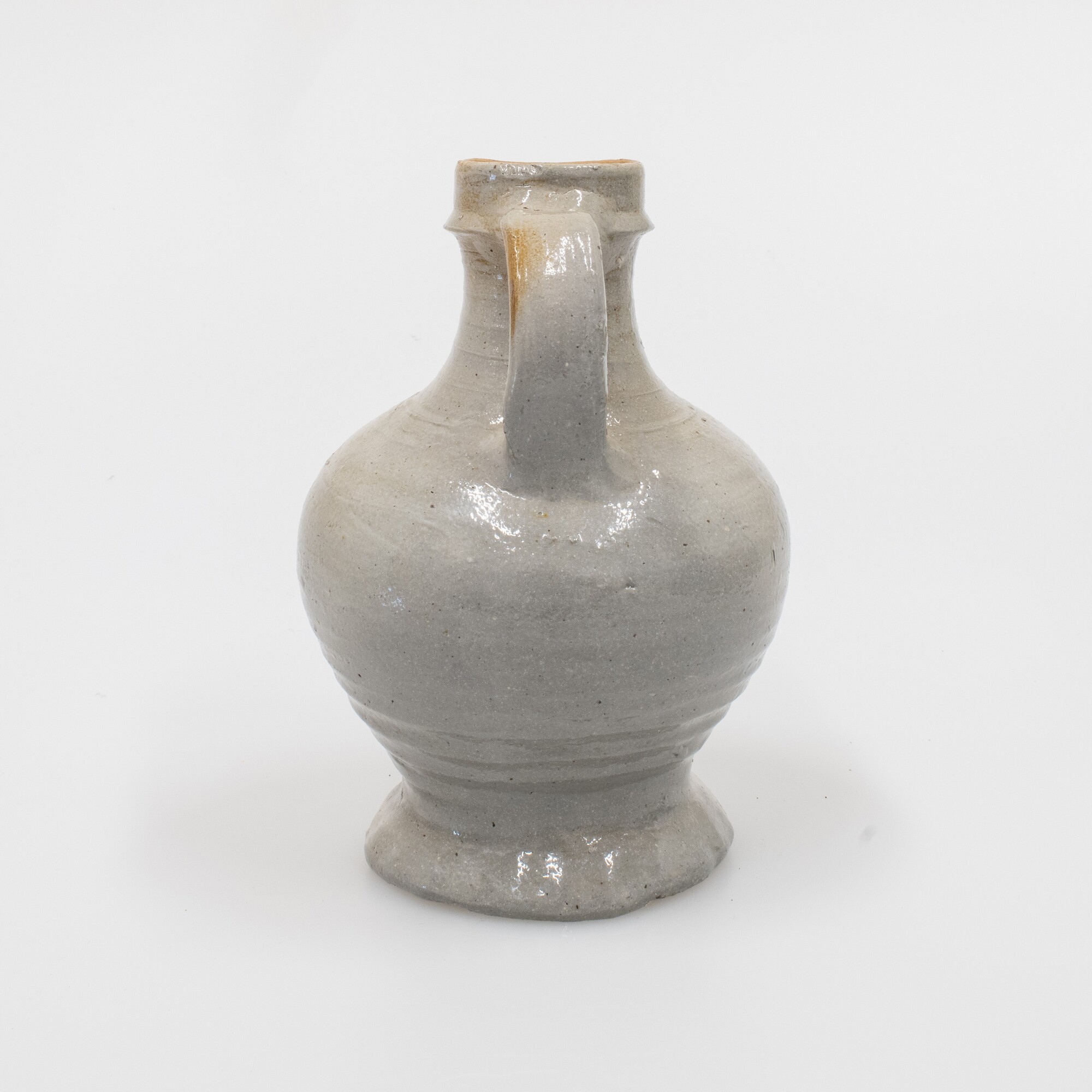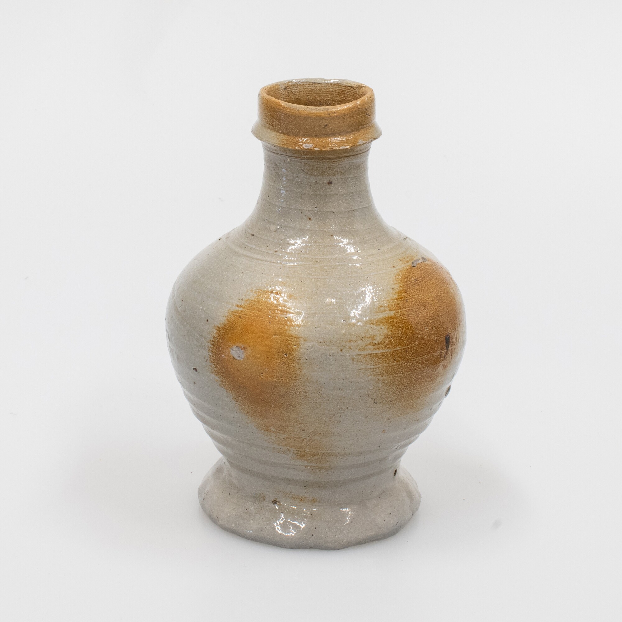 Kan; s2-kan-12; gedrongen bolle kan met kraagrand, geknepen standring, verticaal lintoor; steengoed met oppervlaktebehandeling: vlekken ijzerengobe en zoutglazuur; herkomst: Raeren, Rijnland