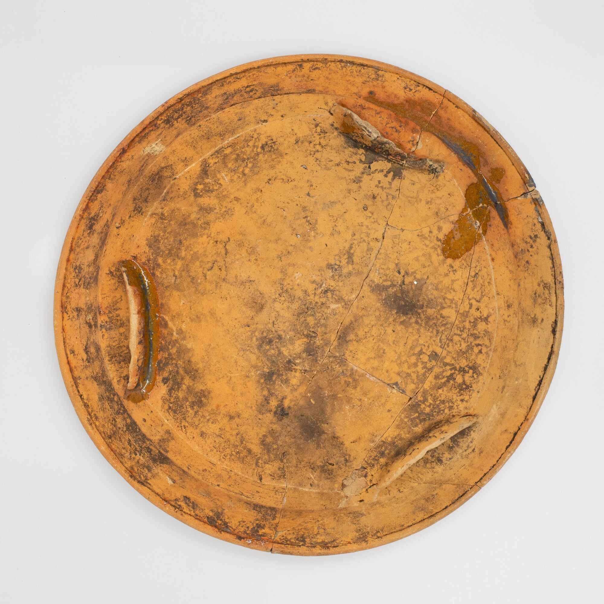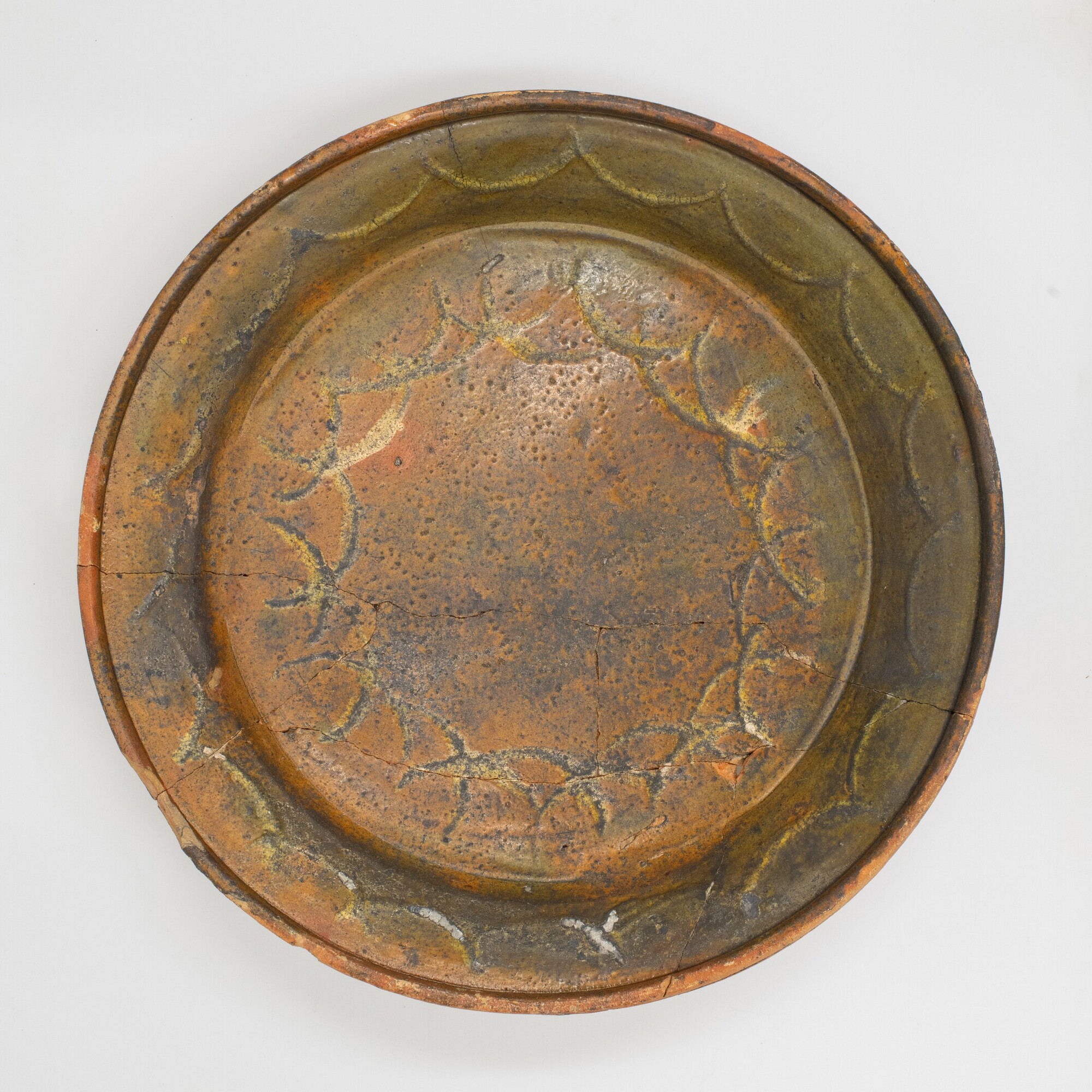 Bord; r-bor-1; bord met uitgebogen vlag en van buiten aangedrukte rand,drie geknepen standlobben; roodbakkend aardewerk; inwendig loodglazuur; slibversiering: boogjes van witte kleislib op vlag en spiegel; bodem licht beroet, inwendig bestekkrassen; herkomst: Nederland