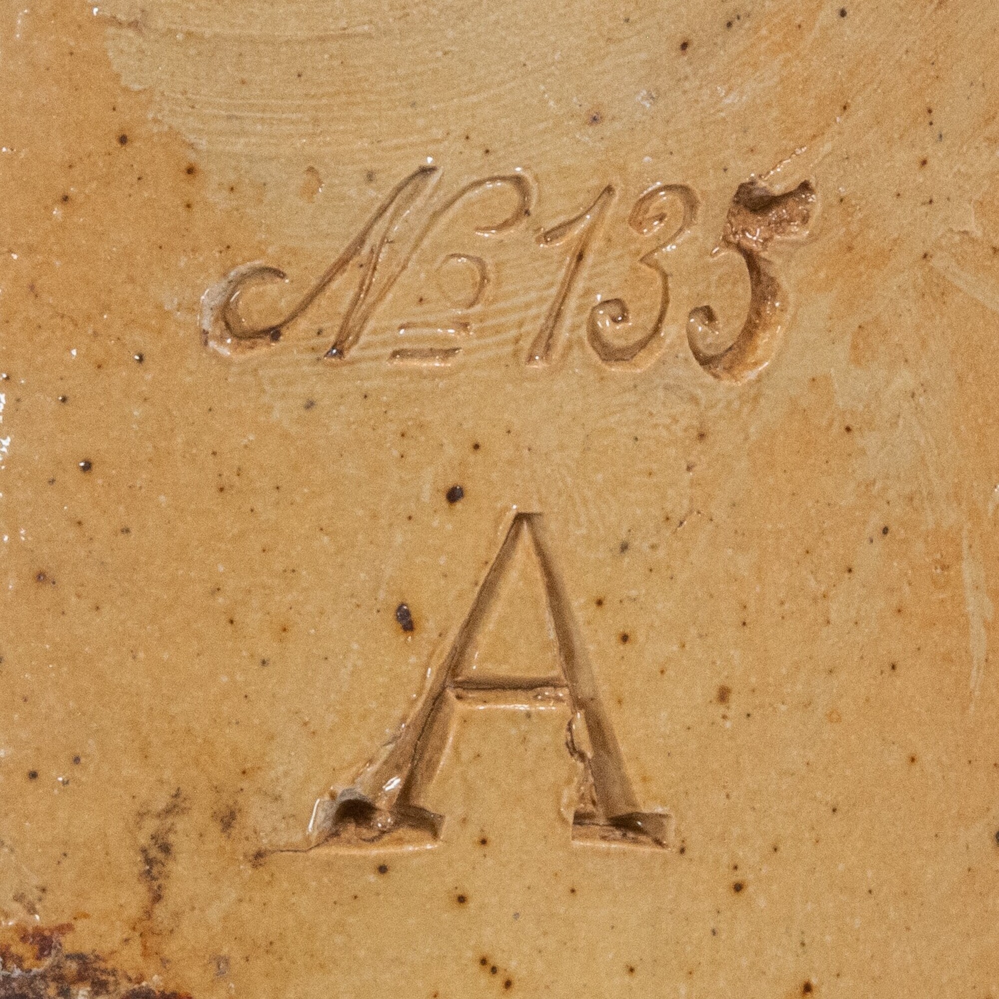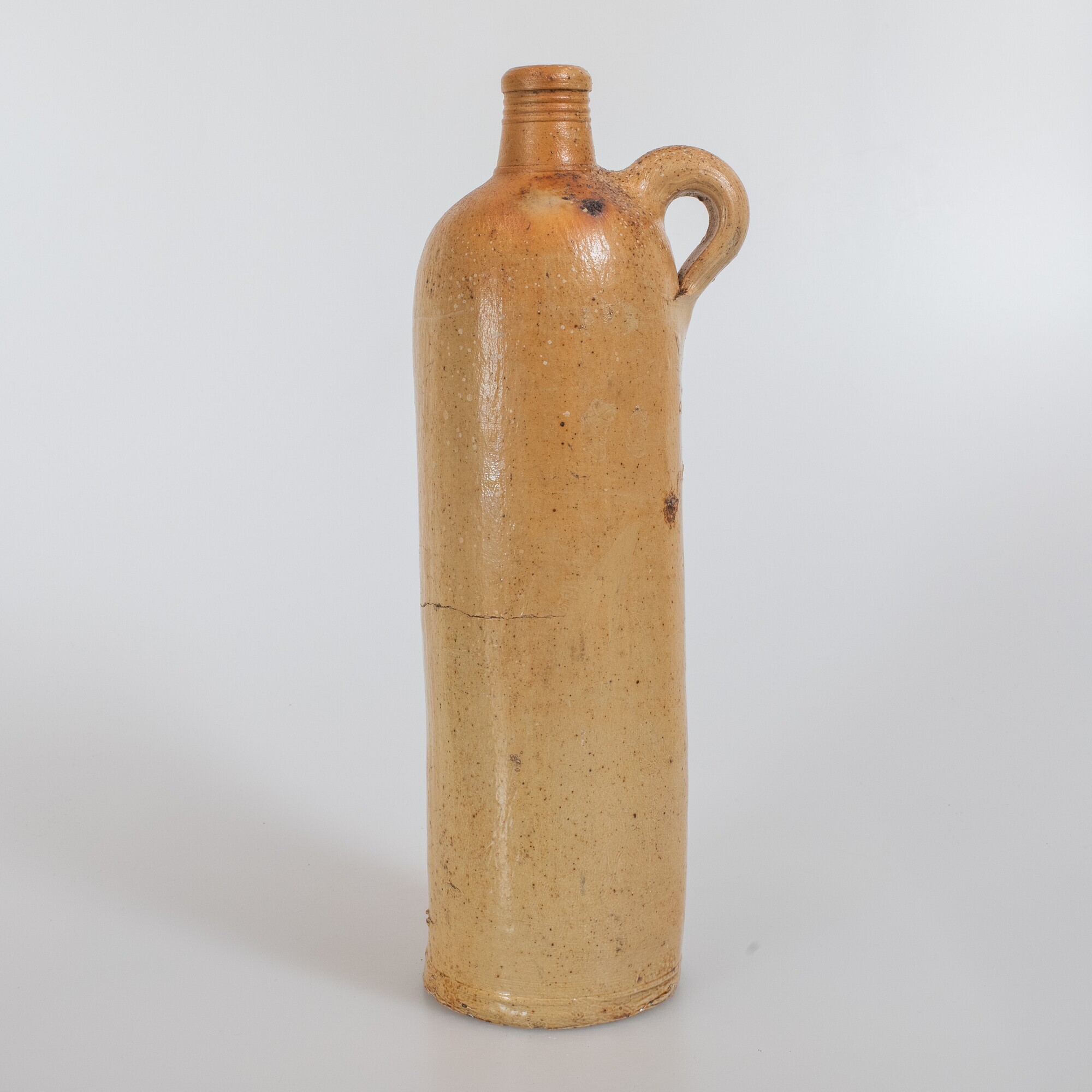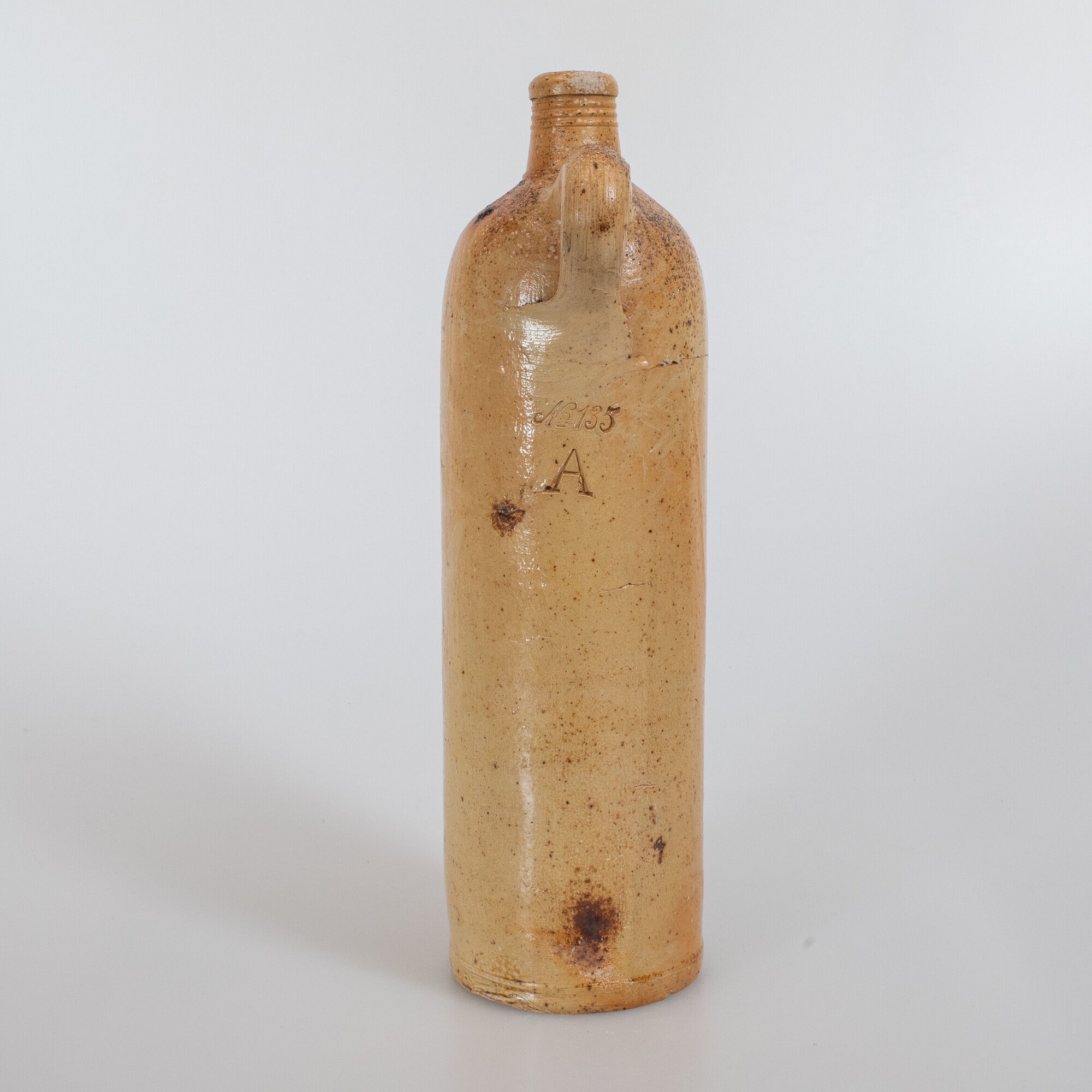 Mineraalwaterfles; s2-fle-4; steengoed geglazuurd; cilindrische fles met afgeronde schouder, korte cilindrische nek met verdikte lip, platte/holle bodem; stempels onder het oor "No 135" en "A"