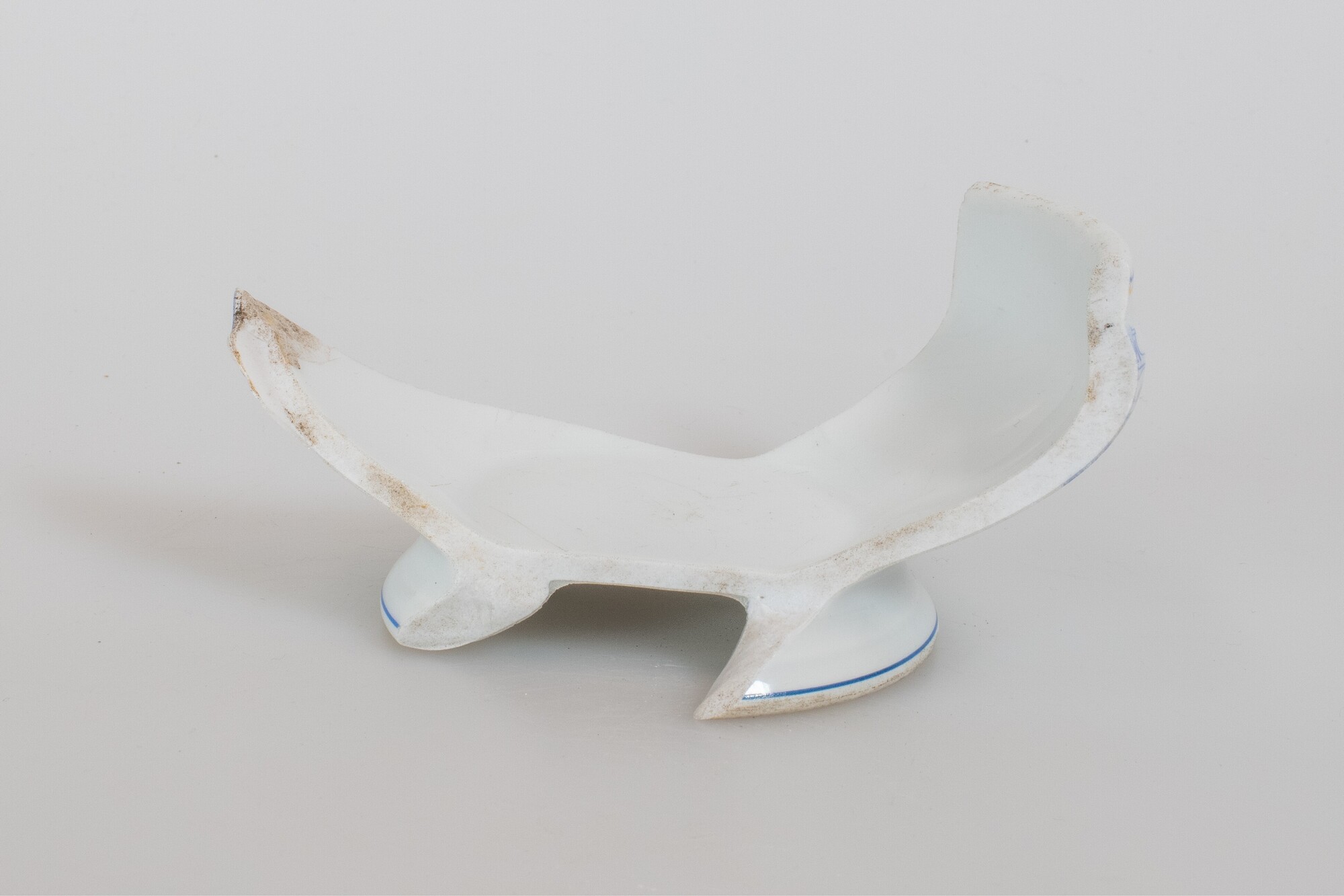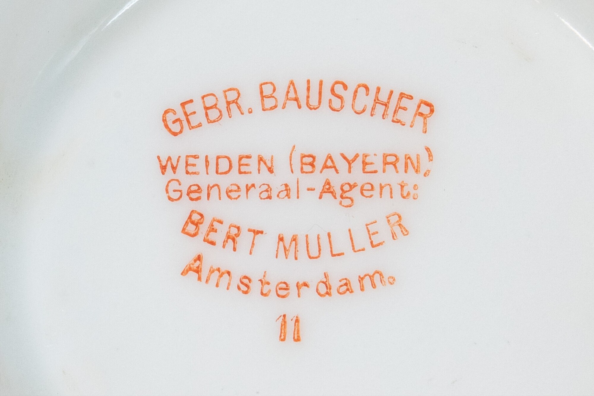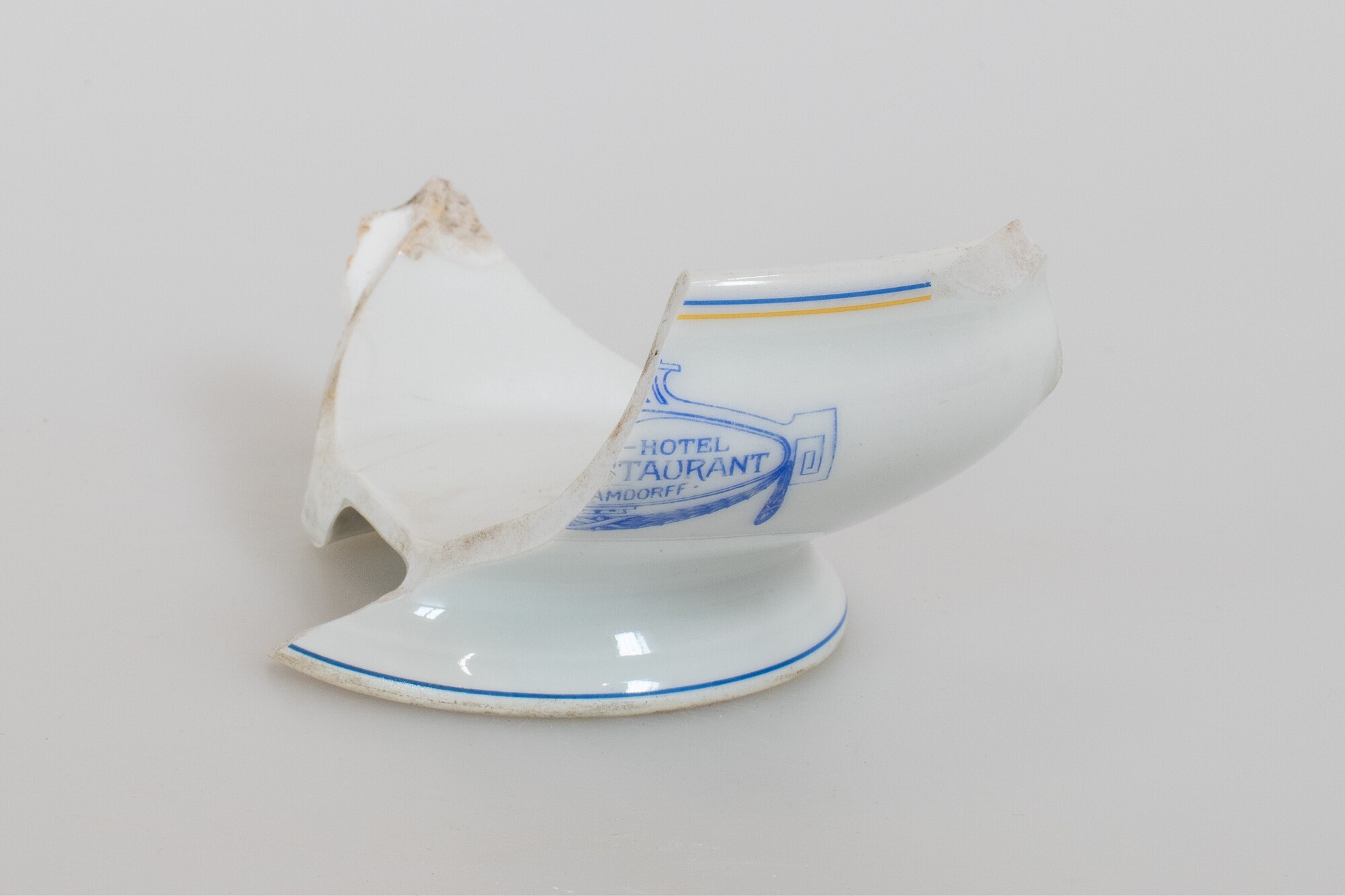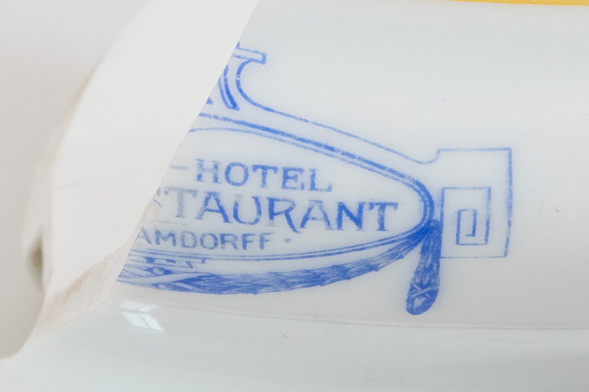 Soepkom; ep-kom-5; Europees porselein; bolle kom met teruggebogen wand en licht uitgebogen rand, standring; blauwe en gele strepen onder de rand; blauwe rand op de standring; stempel van hotel/restaurant Hamdorff op de wand; stempel op de bodem: "GEBR. BAUSCHER, WEIDEN (BAYERN), Generaal-Agent: BERT MULLER, Amsterdam, 11"