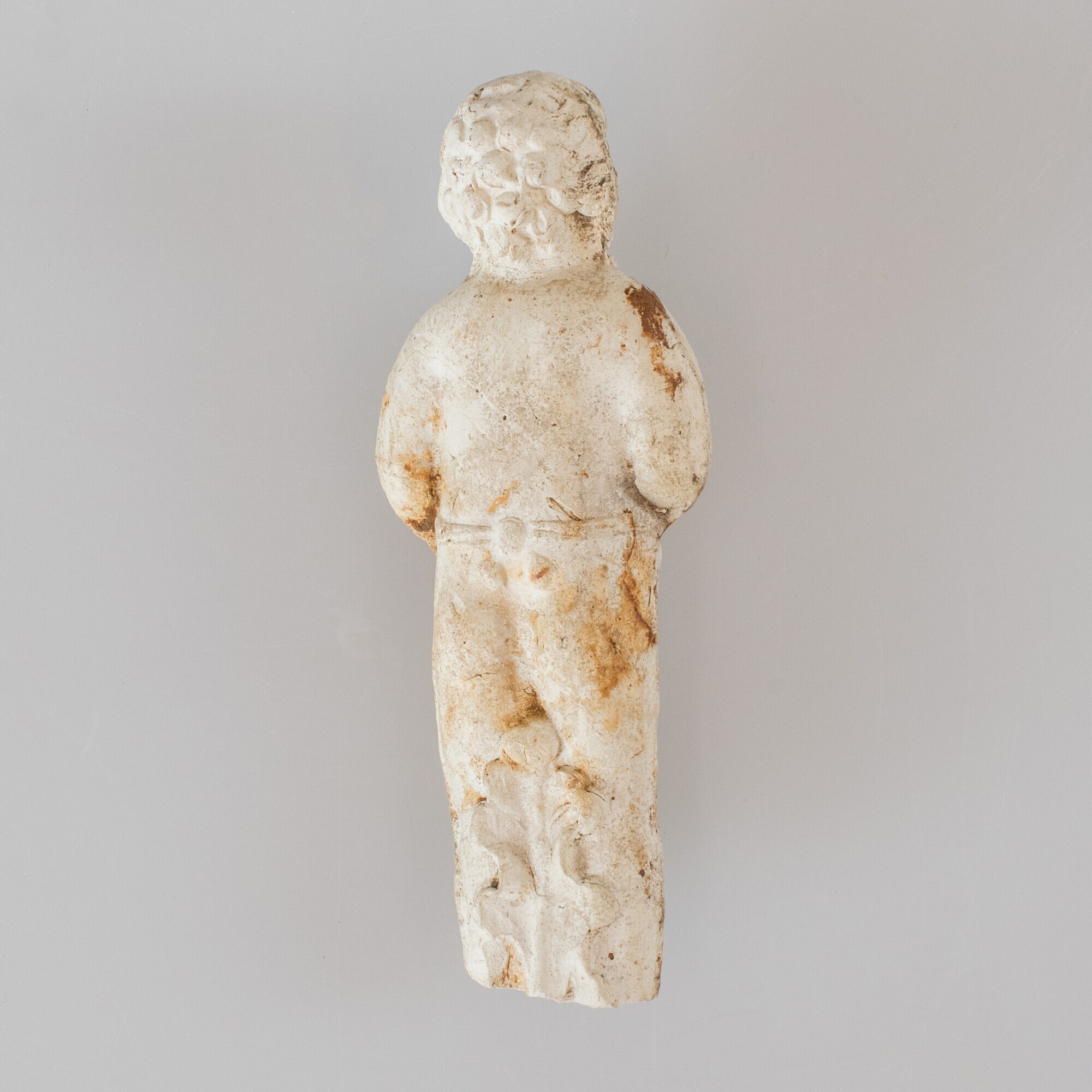 Beeldje; py-beeldje-; pijpaarde; mannelijk figuur gekleed in lendendoek met de handen vol vruchten en bloemen; herkomst: Nederland