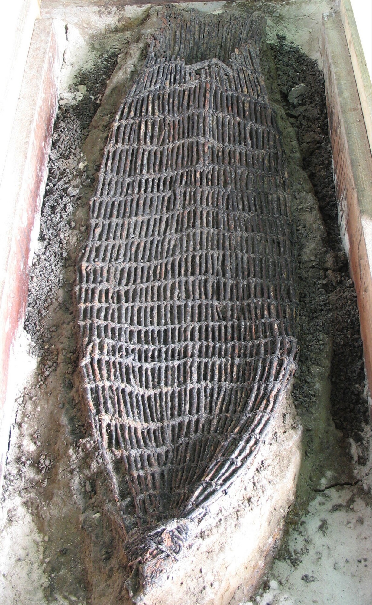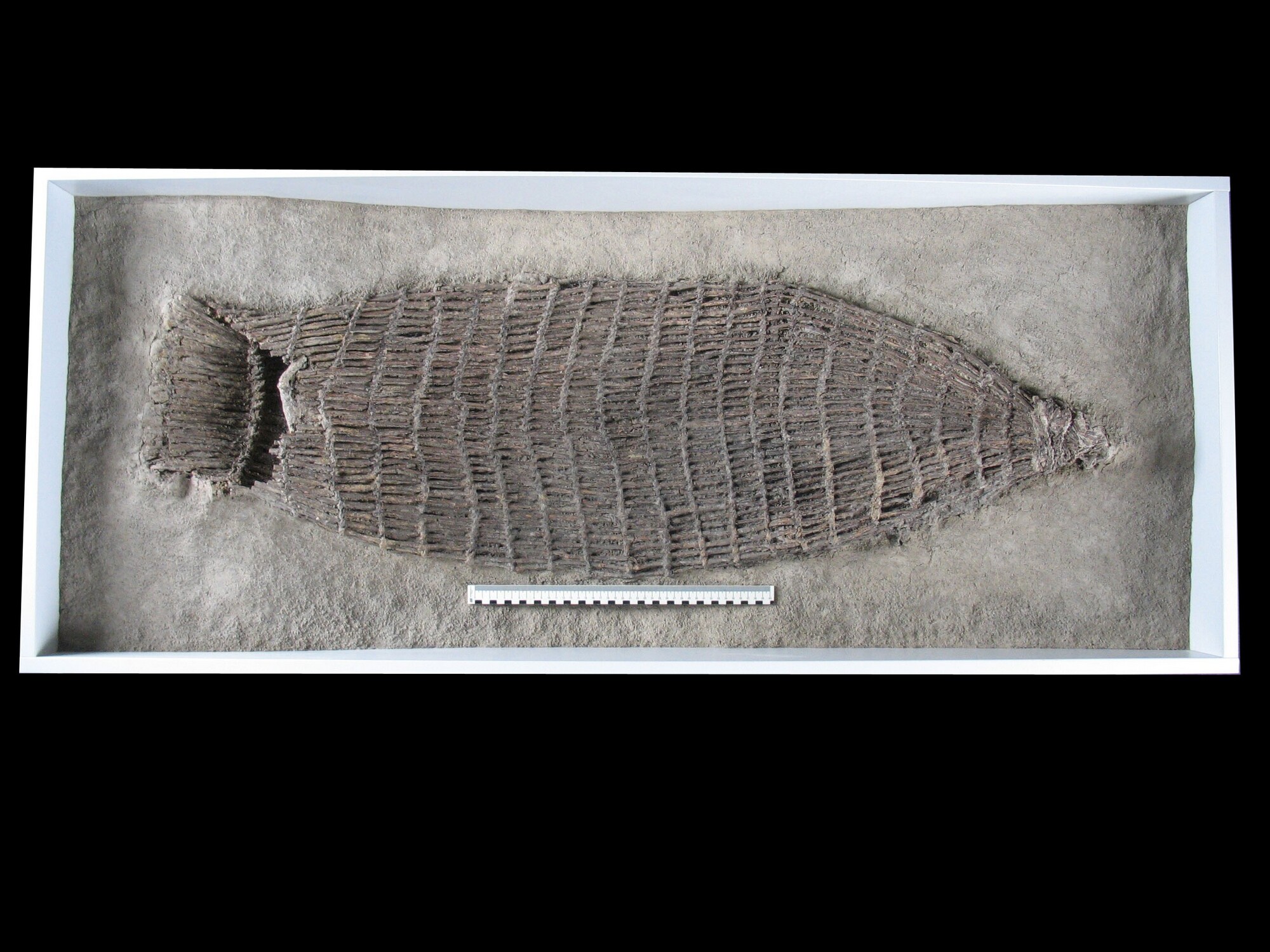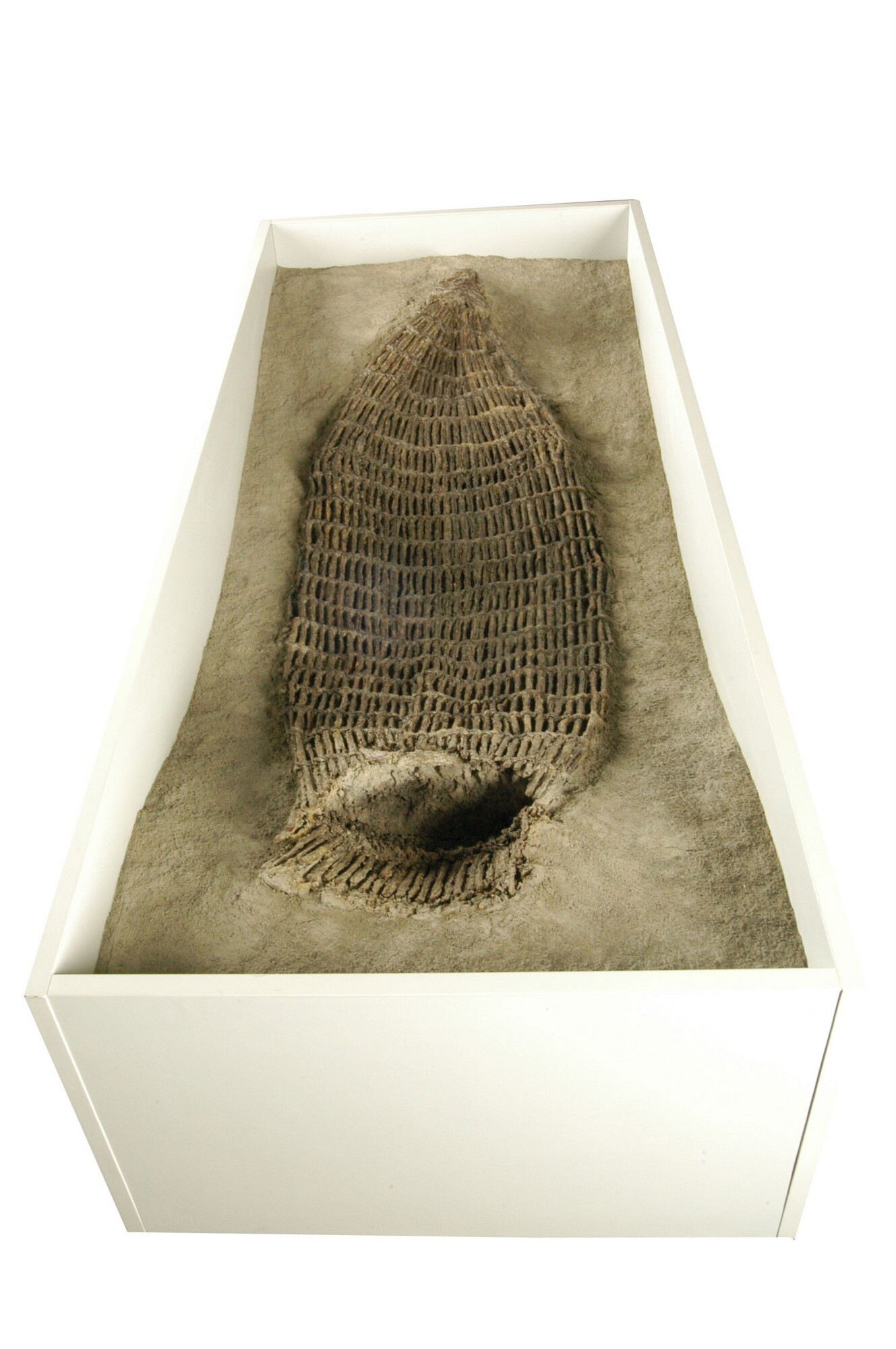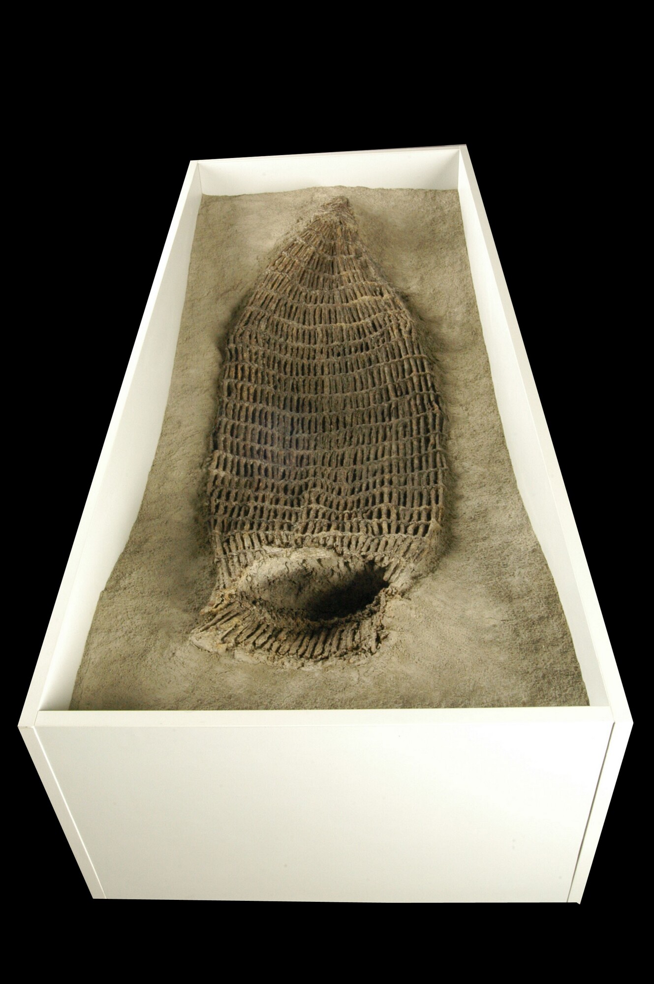 Fuik; zonder inkeling met windsel van touw. De fuik is gevlochten volgens de open-vlechtwerktechniek (Zwirnbindung), bestaande uit staken waar omheen het touw is gevlochten. Voor de staken zijn tweejarige, ongeschilde wilgentenen gebrukt met een diameter tussen 0,2 tot 1,1 cm. Het touw is van getwijnd boombast.