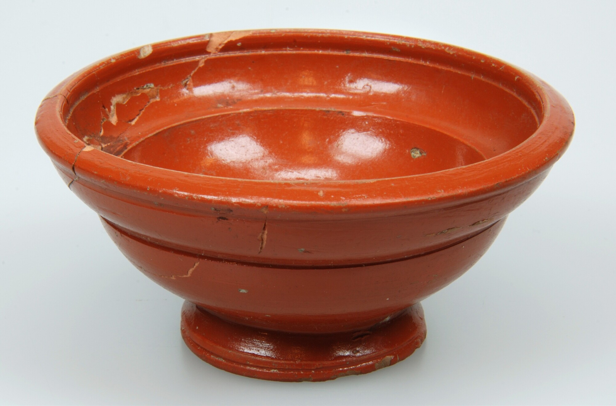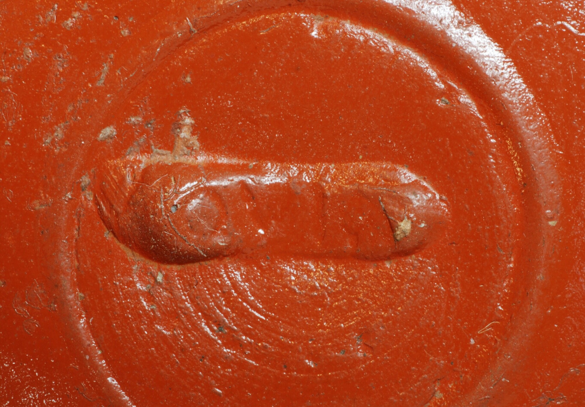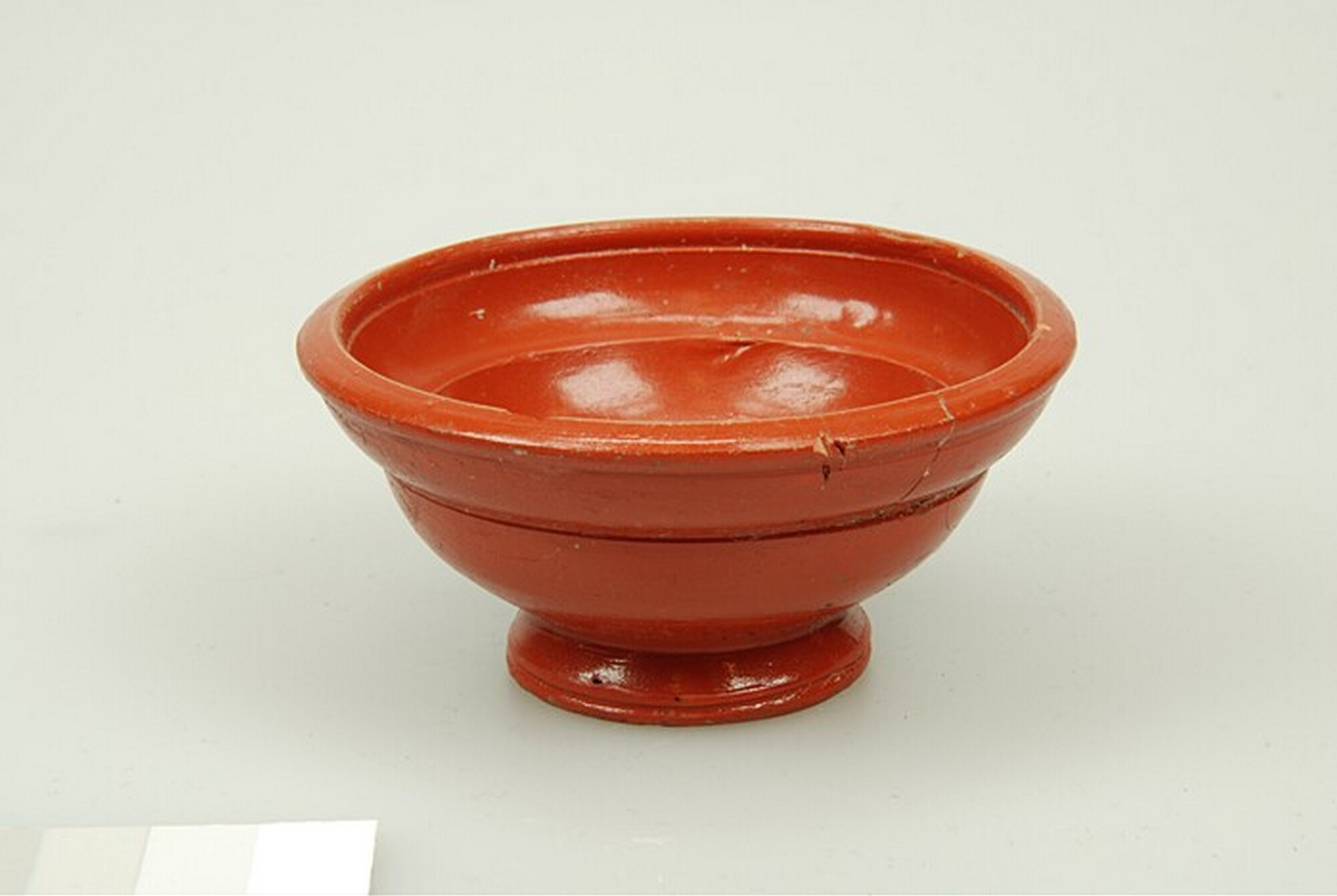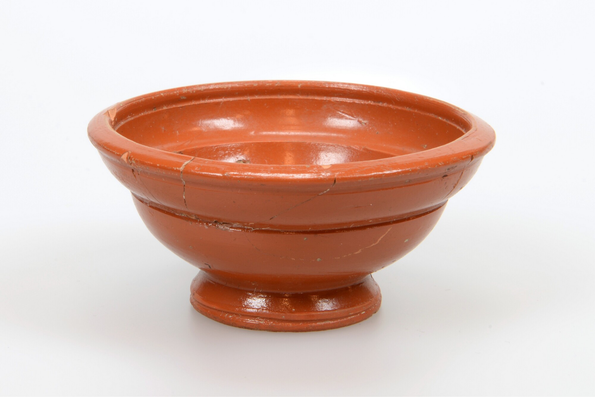 Kom; type Dragendorff 27k; terra sigillata; bolvormige kom met ingesnoerde rand. De randlip is afgerond met platte bovenzijde. De standvoet is aan de buitenkant bol met een horizontale groef; reliefstempel in bodem met de tekst OF.ING; standring; herkomst: Zuid-Gallië