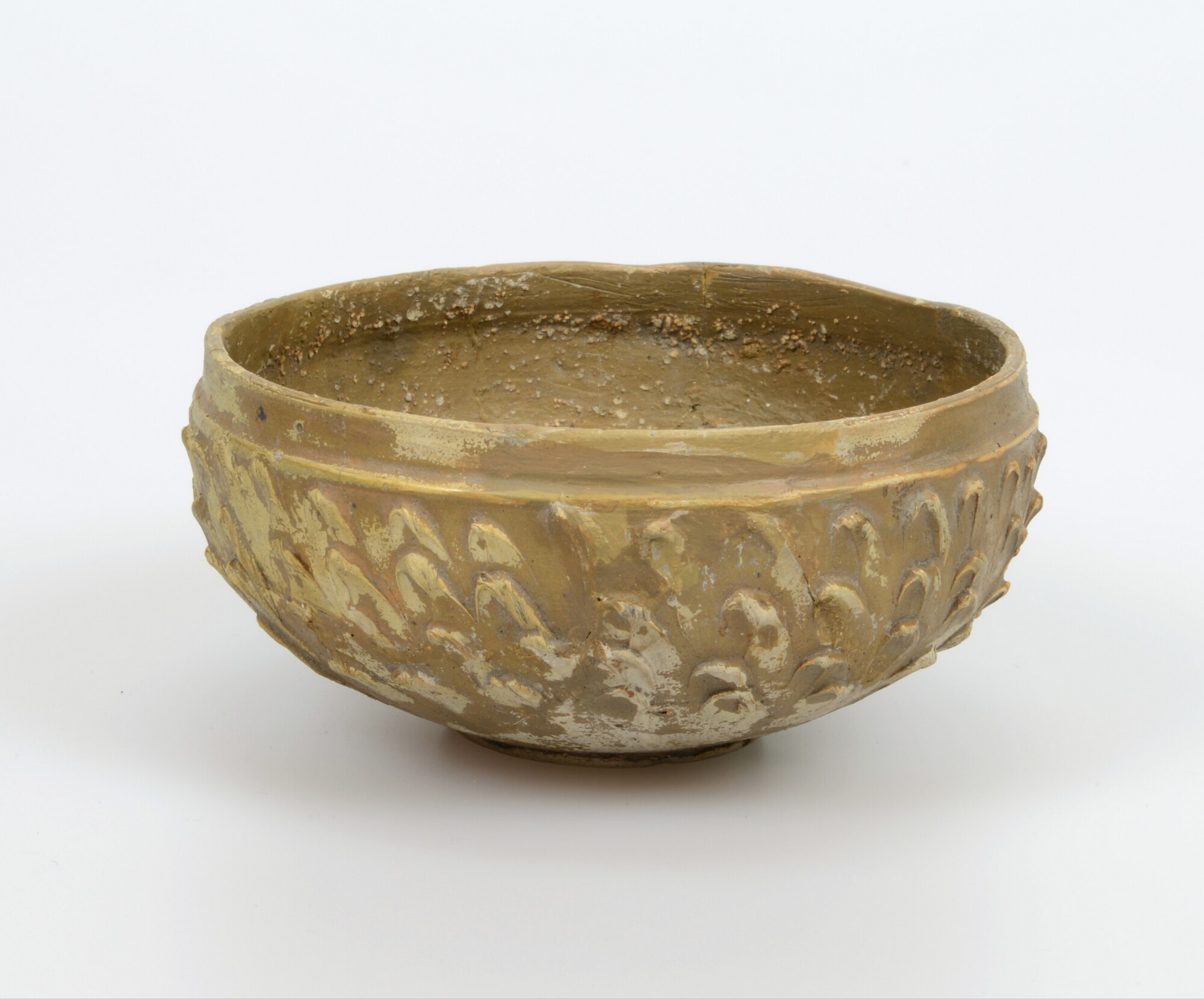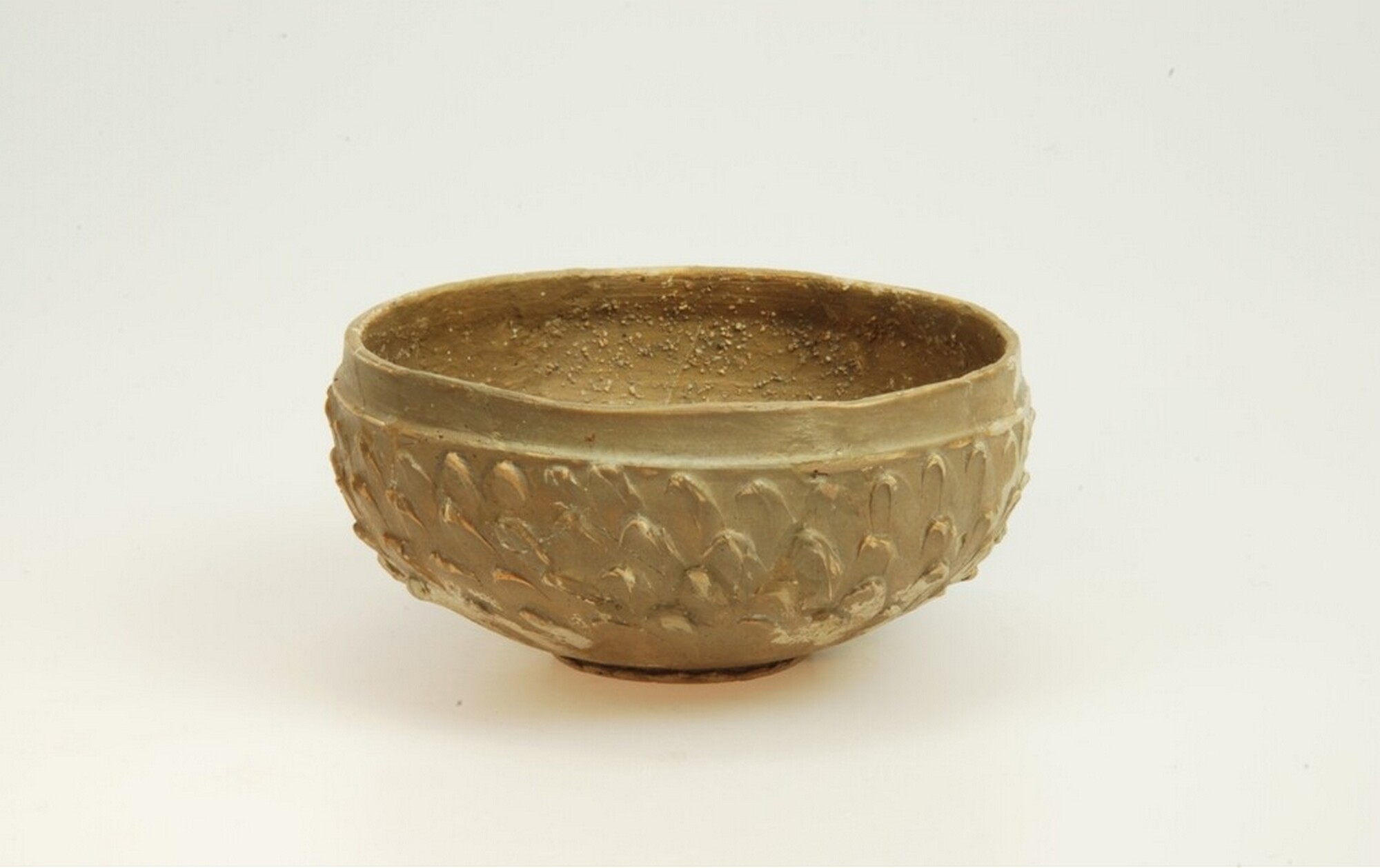 Kom; geverfd aardewerk; type Hofheim 22; halfbolle kom op een lage standvoet; bruin geverfd en groengrijze klei; geschubde wand; herkomst: Lyon.