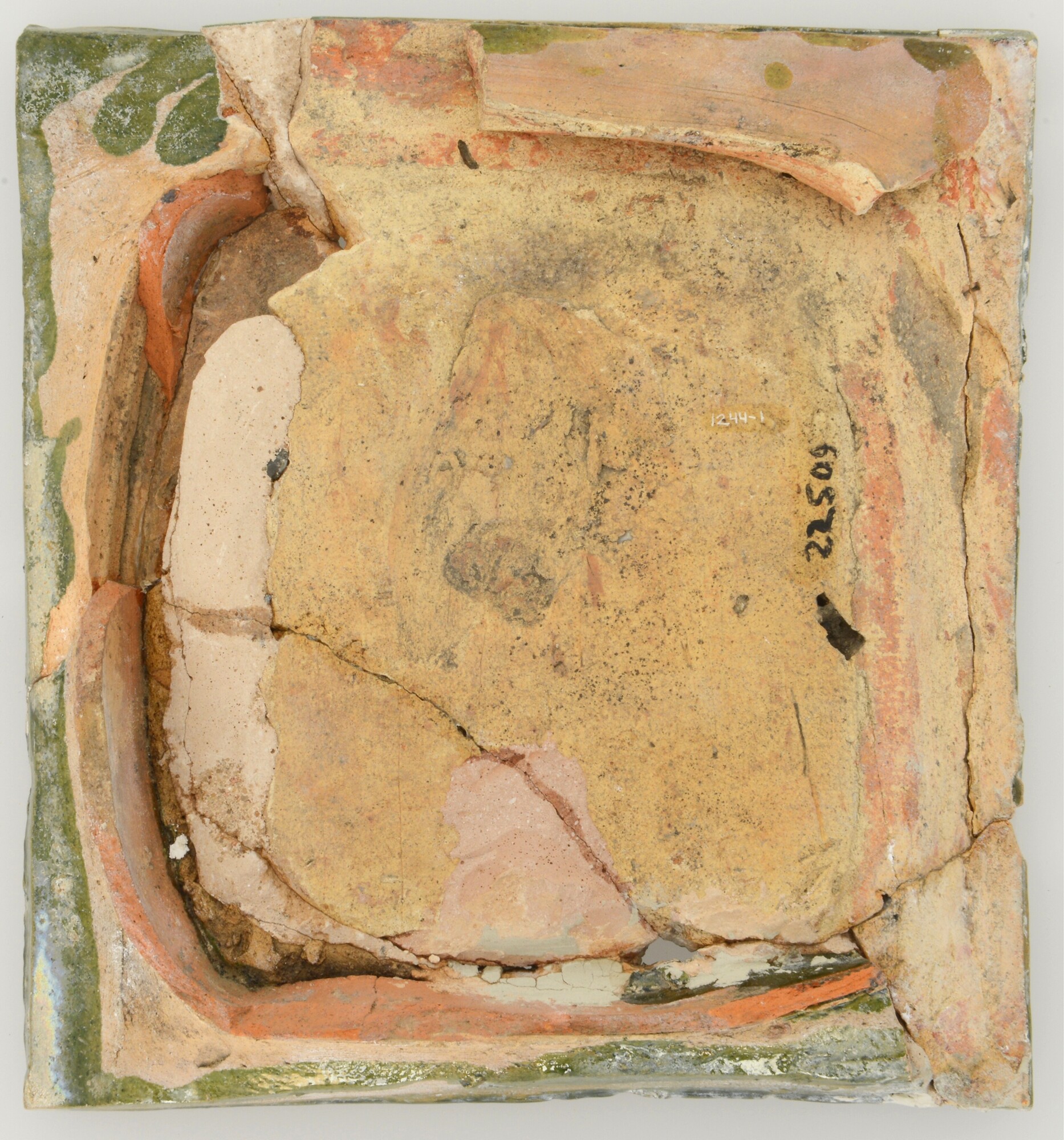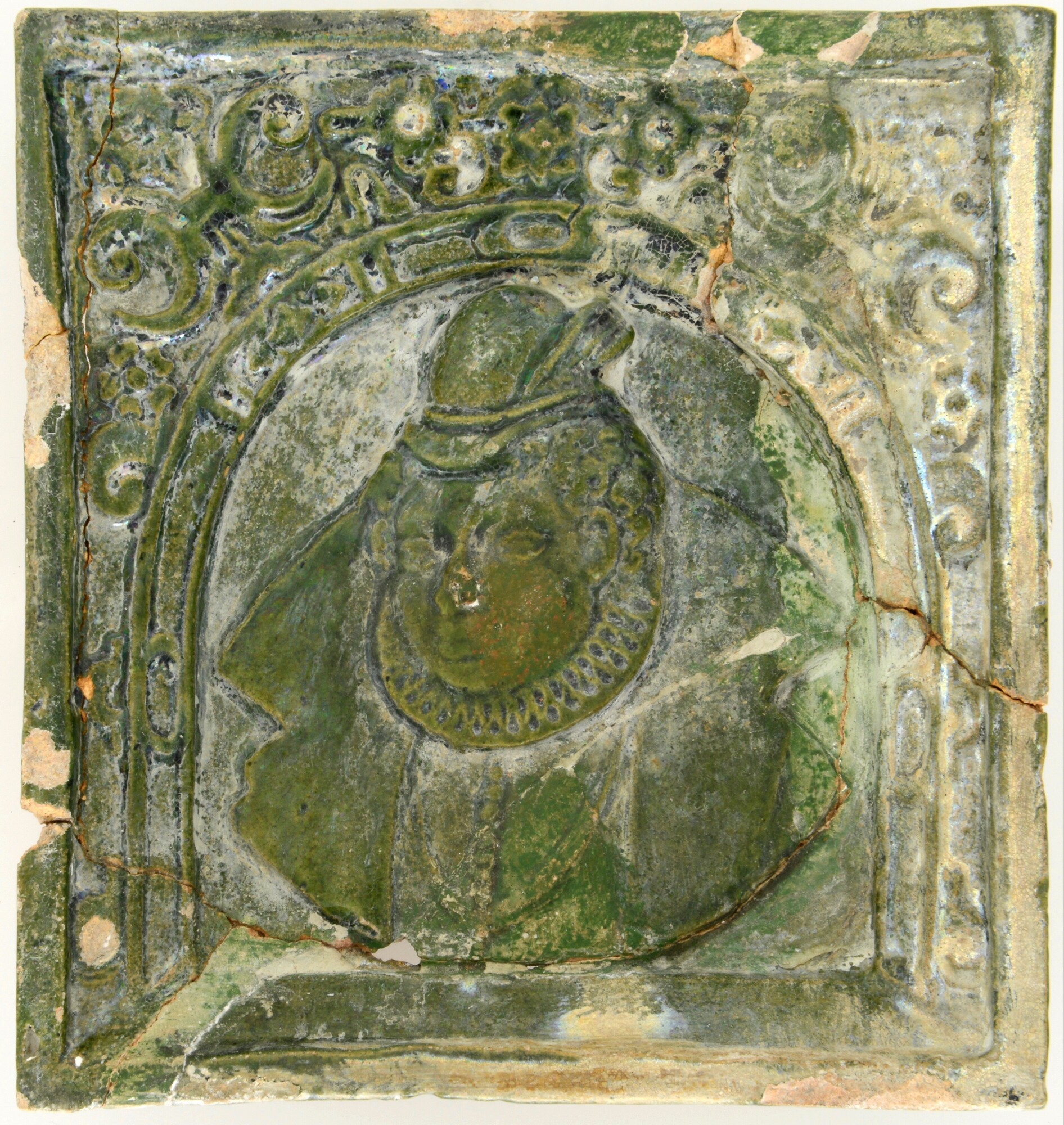 Kacheltegel; reliëftegel type B; vierkante tegel; loodglazuur met koperoxide; frontplaat van geelbakkende klei is aan de achterzijde voorzien van een opbouw in de vorm van een afgerond rechthoekige band; in reliëf mansportret met hoedje en pluim, Spaanse plooikraag en brede omgeslagen kraag, omringd door boog en florale motieven; productieplaats: Enkhuizen