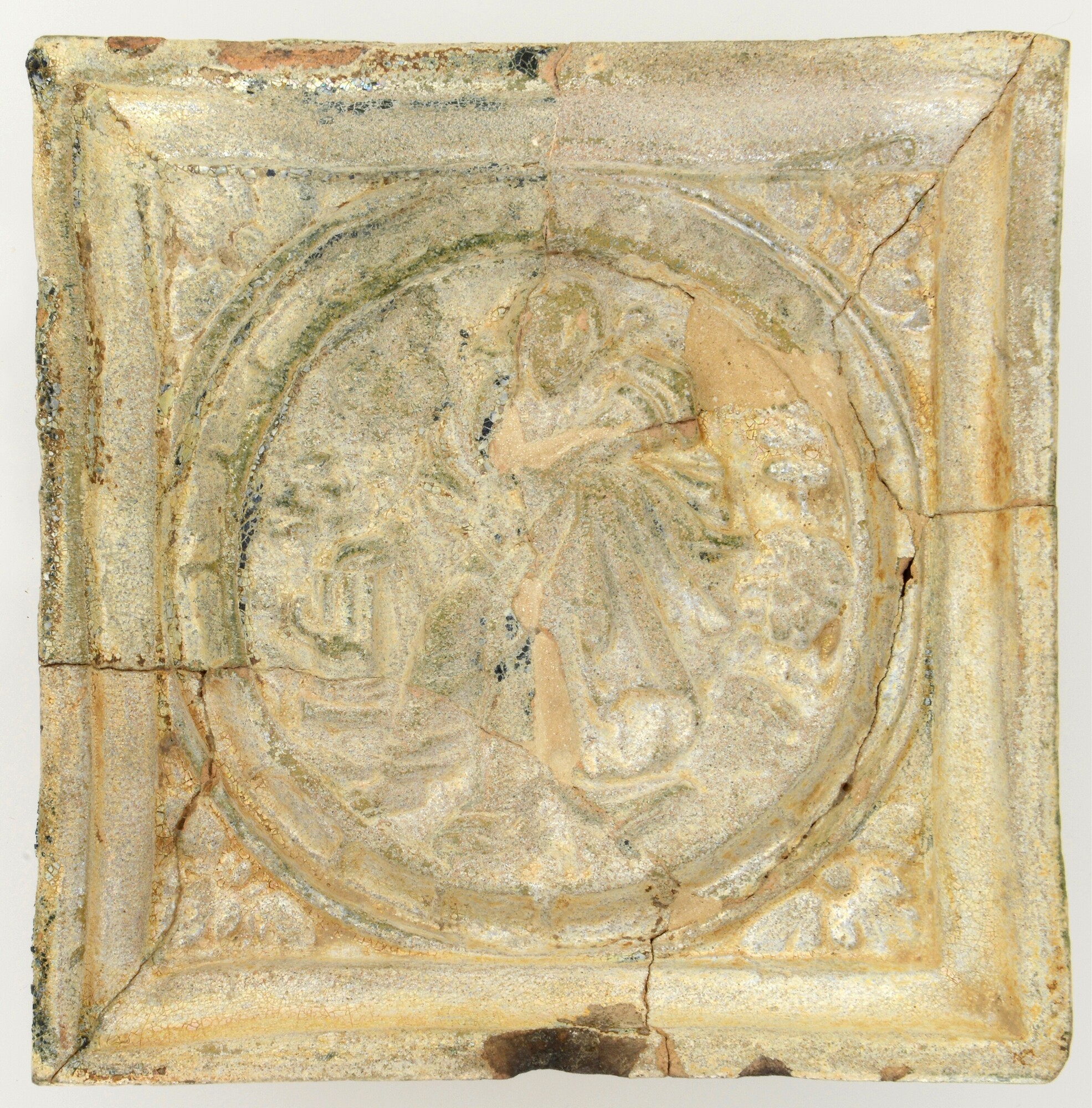 Kacheltegel; reliëftegel type A; loodglazuur. vierkante tegel, aan de achterzijde is hij voorzien van een kleine, op schijf gedraaide van roodbakkende klei vervaardige schaalvorm van ongeveer 10.5 cm doorsnede bij een hoogte van 4 cm. Het reliëf toont Delila, de vrouw van Samson zittend op een leeuw en met een afgebroken zuil in haar arm. ...