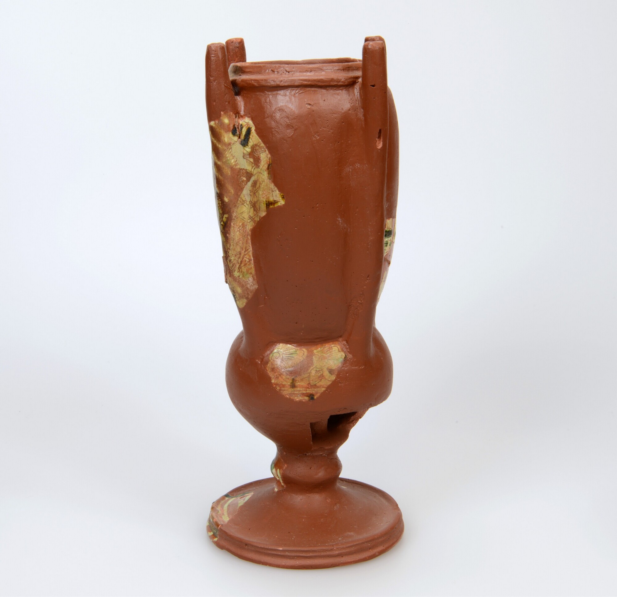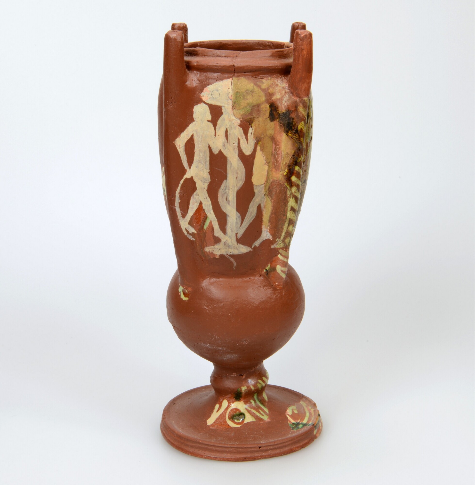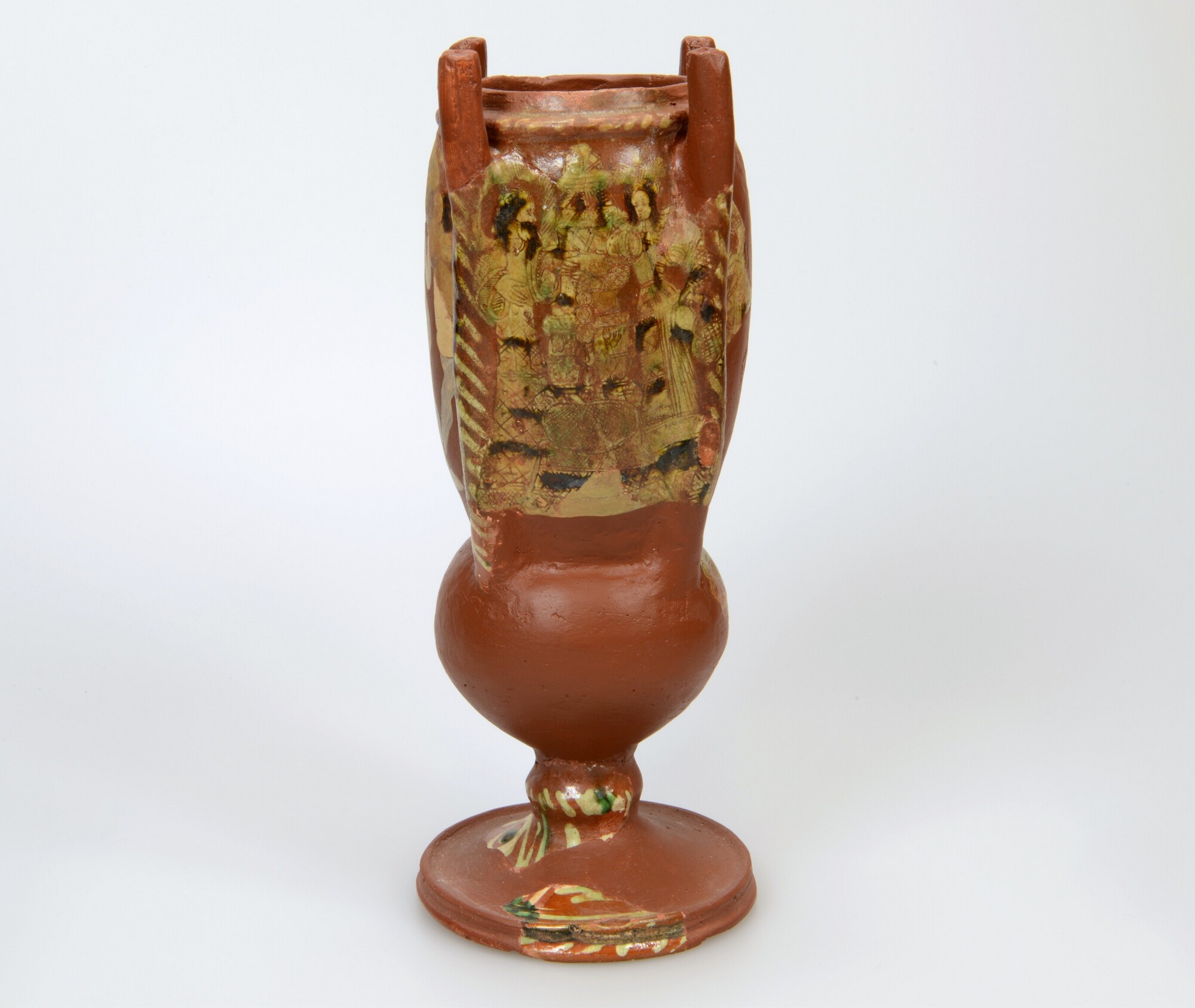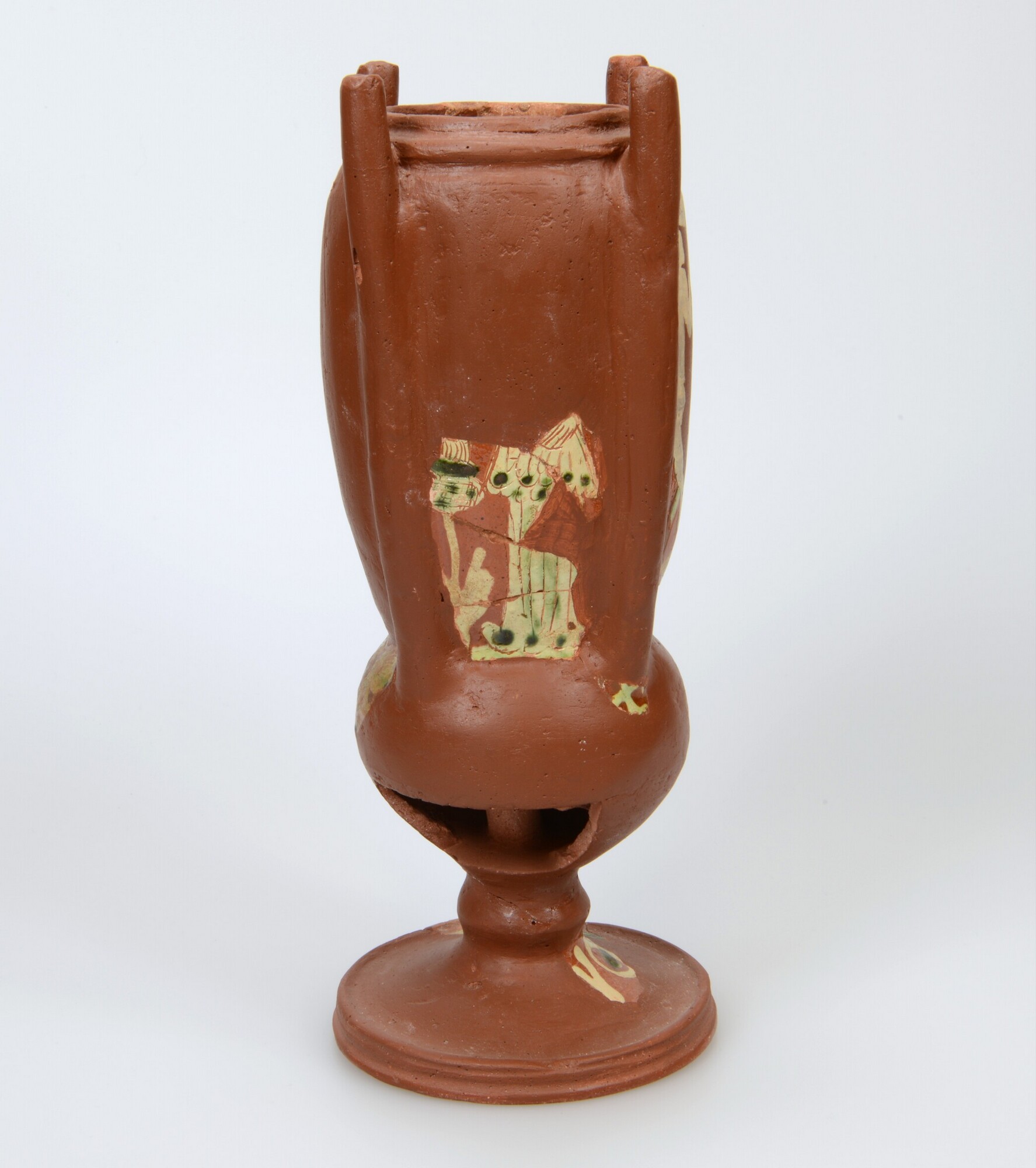 Fopkan; wa-fop-; balustervormige kan met kraagrand en vier uitstekende punten aan bovenzijde, standvoet; roodbakkend Werra-aardewerk; slibversiering; slib-krastechniek; Adam en Eva bij de boom met de slang; Jezus met de Samaritaanse vrouw bij de waterput; productieplaats: Enkhuizen