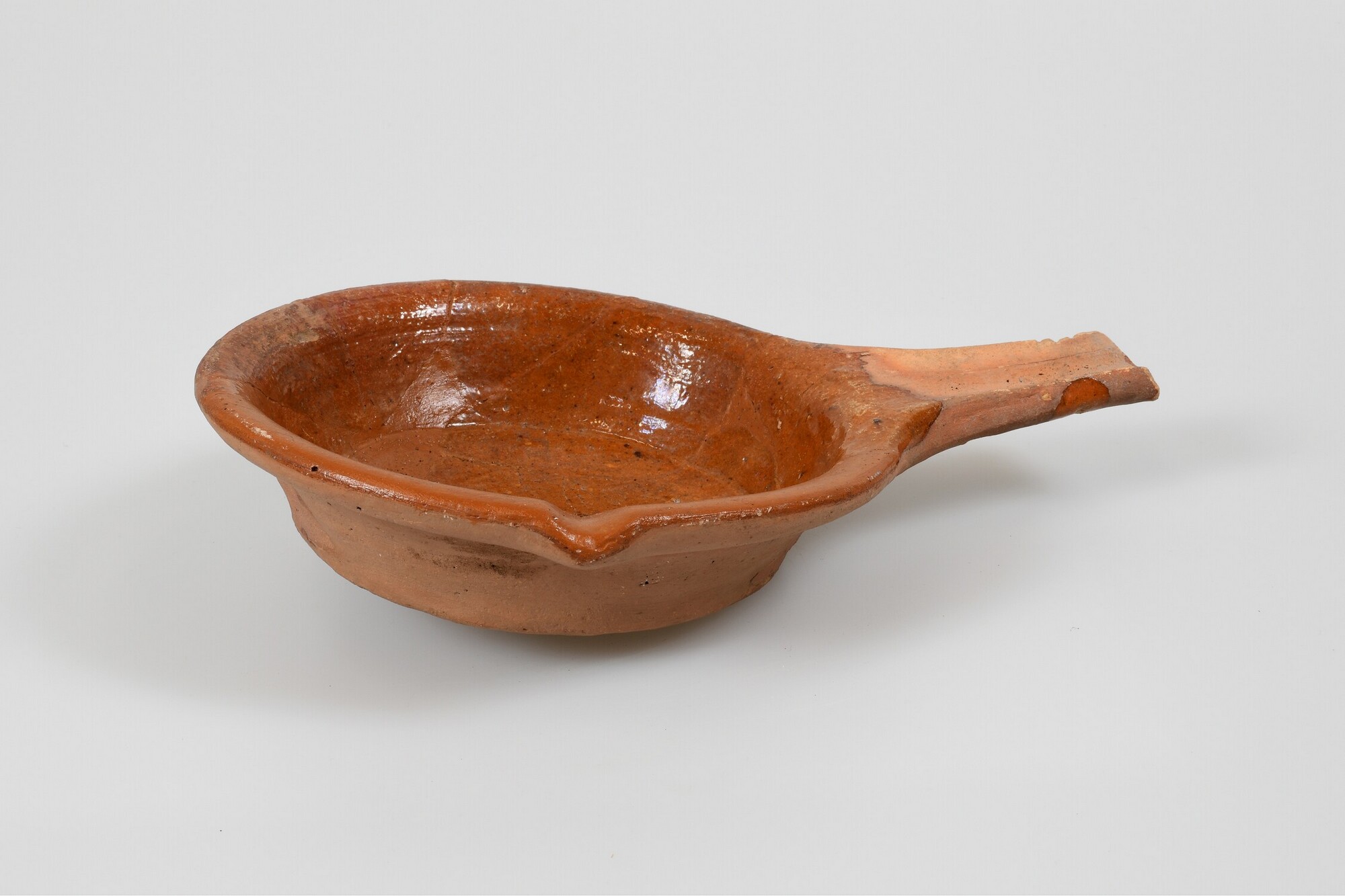 Bakpan; r-bak-2; bakpan met zijwand en verdikte afgeronde rand, standvlak, platte steel, schenklip op 90 graden t.o.v. steel; roodbakkend aardewerk; inwendig loodglazuur; onderzijde beroet; herkomst: West-Nederland