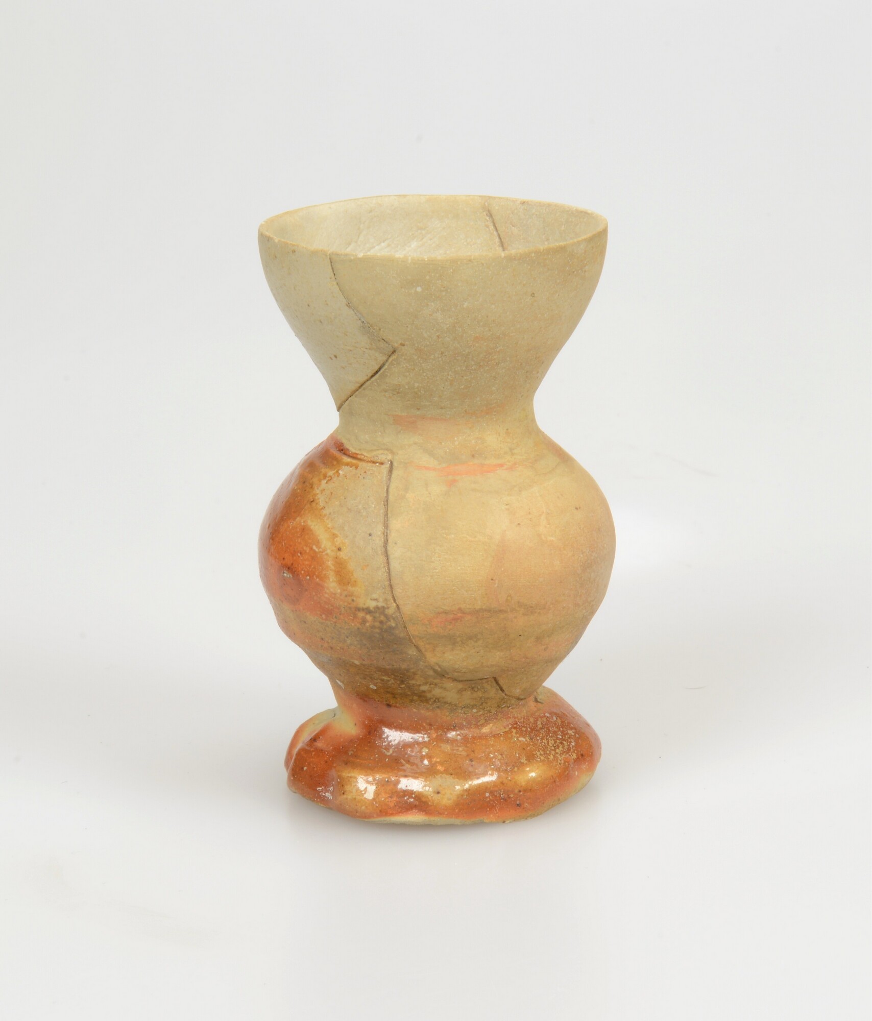 Trechterbeker; s2-tre-7; steengoed; trechterbeker met klein potlichaam en conische trechter, geknepen standring; oranje blos; herkomst: Siegburg