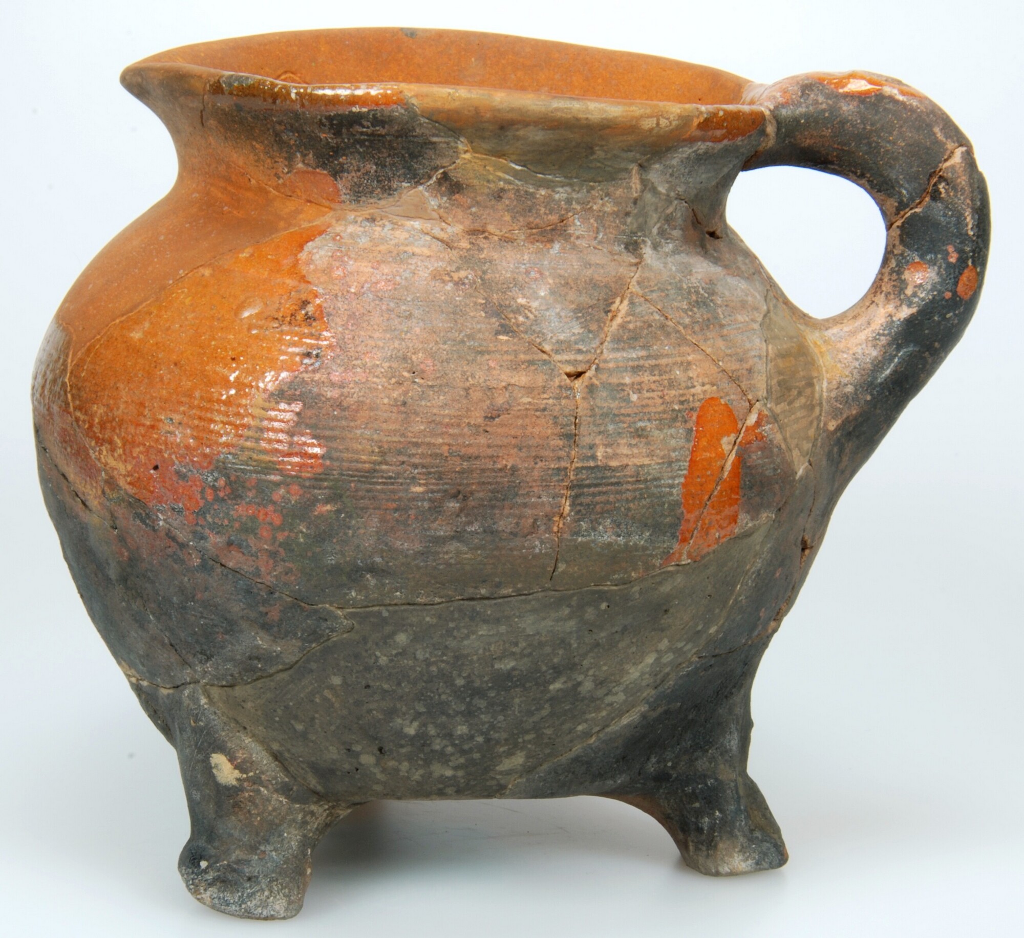 Grape; r-gra-6 ; grape met afgeronde buikknink en uitstaande rand; schenklip 180 graden t.o.v. oor; driepoot; één verticaal worstoor; kamversiering