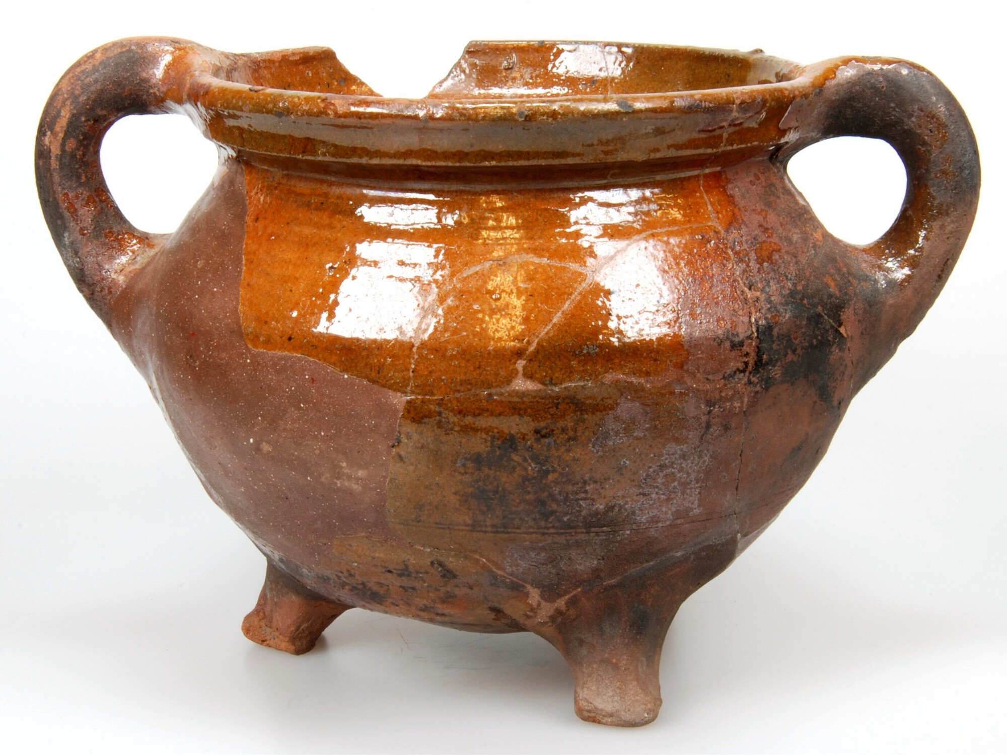 Grape; r-gra-98; roodbakkend; loodglazuur; twee worstoren; drie poten; buitenzijde beroet; vondstomstandigheden: afvallaag beerkuil