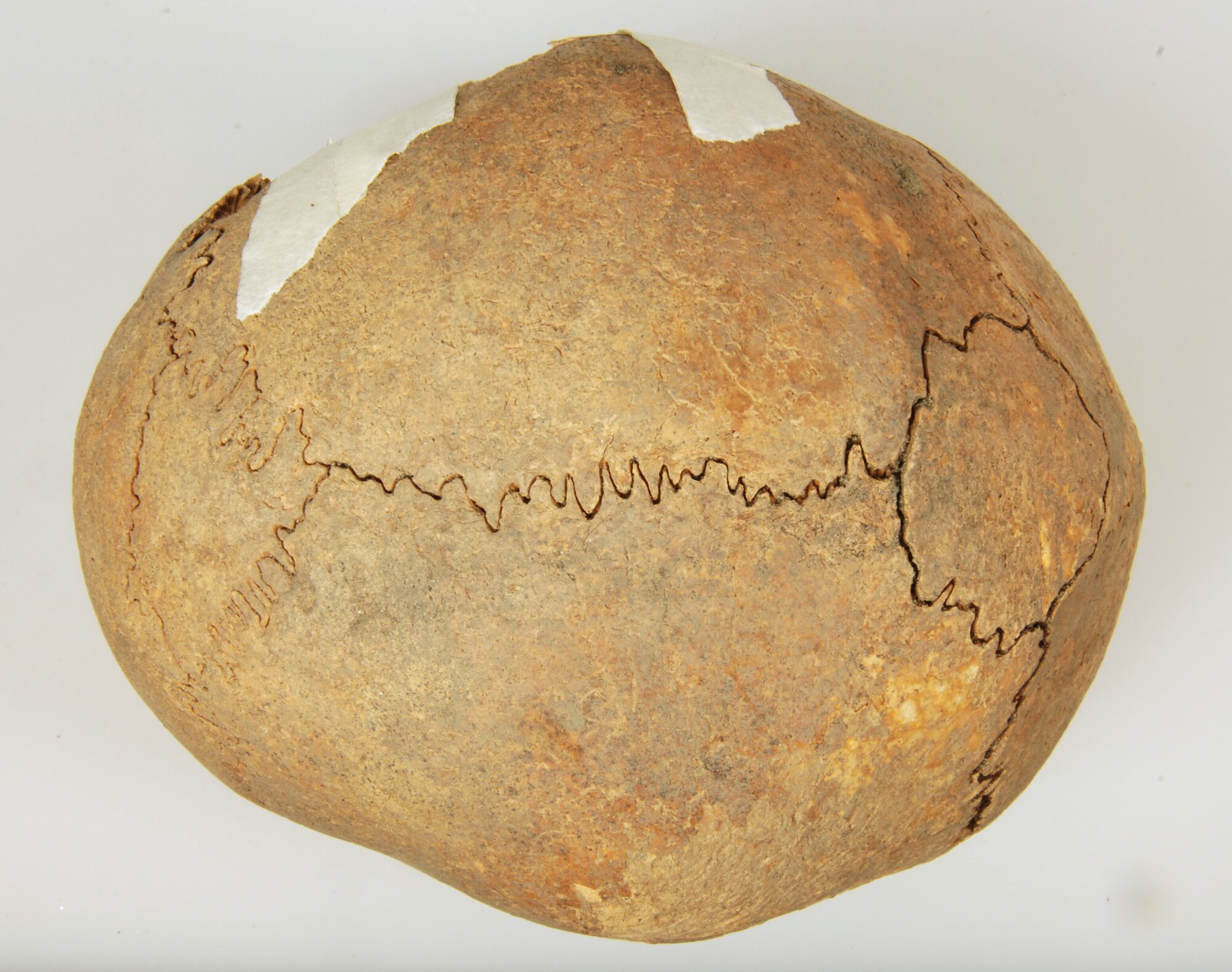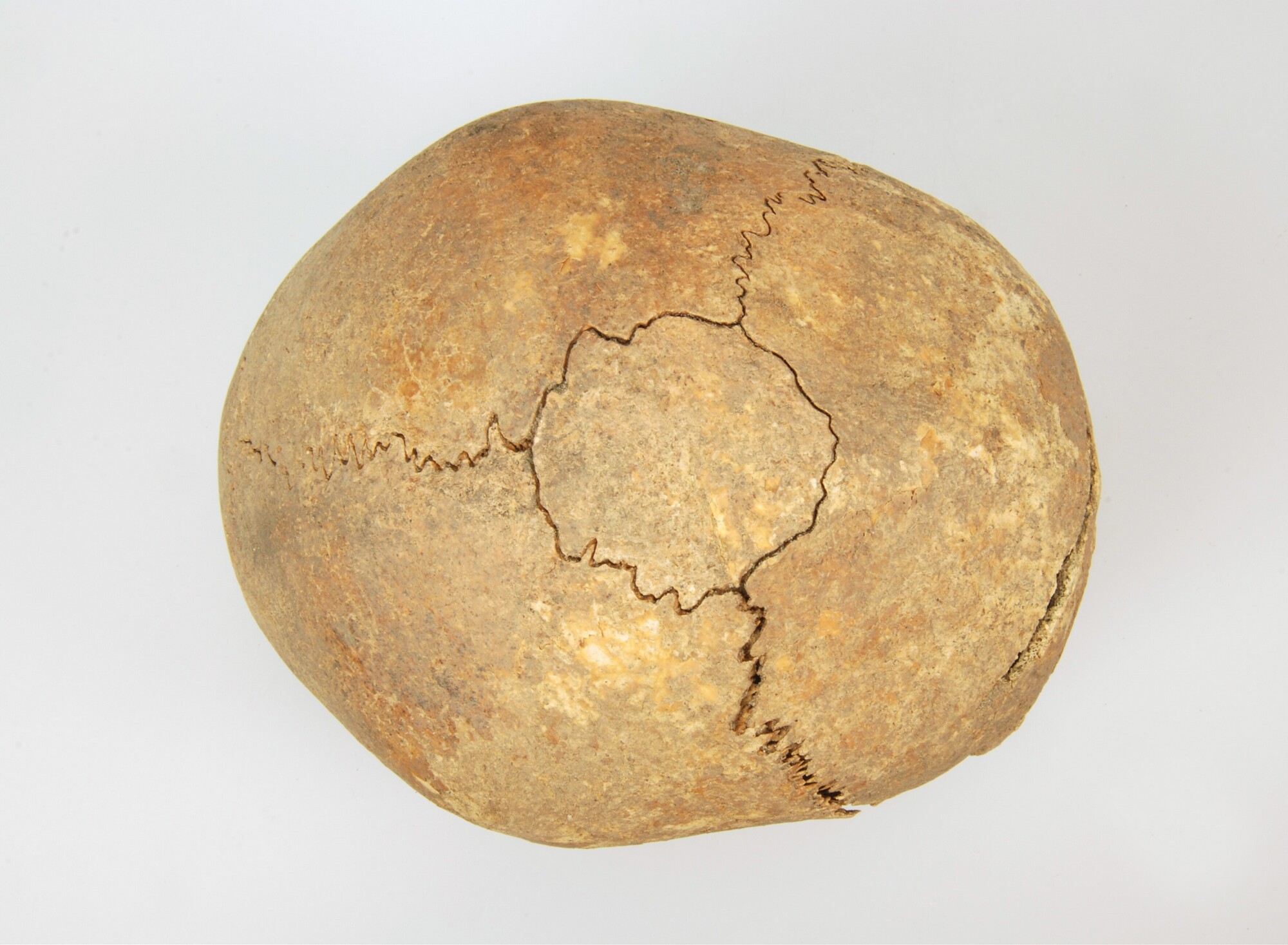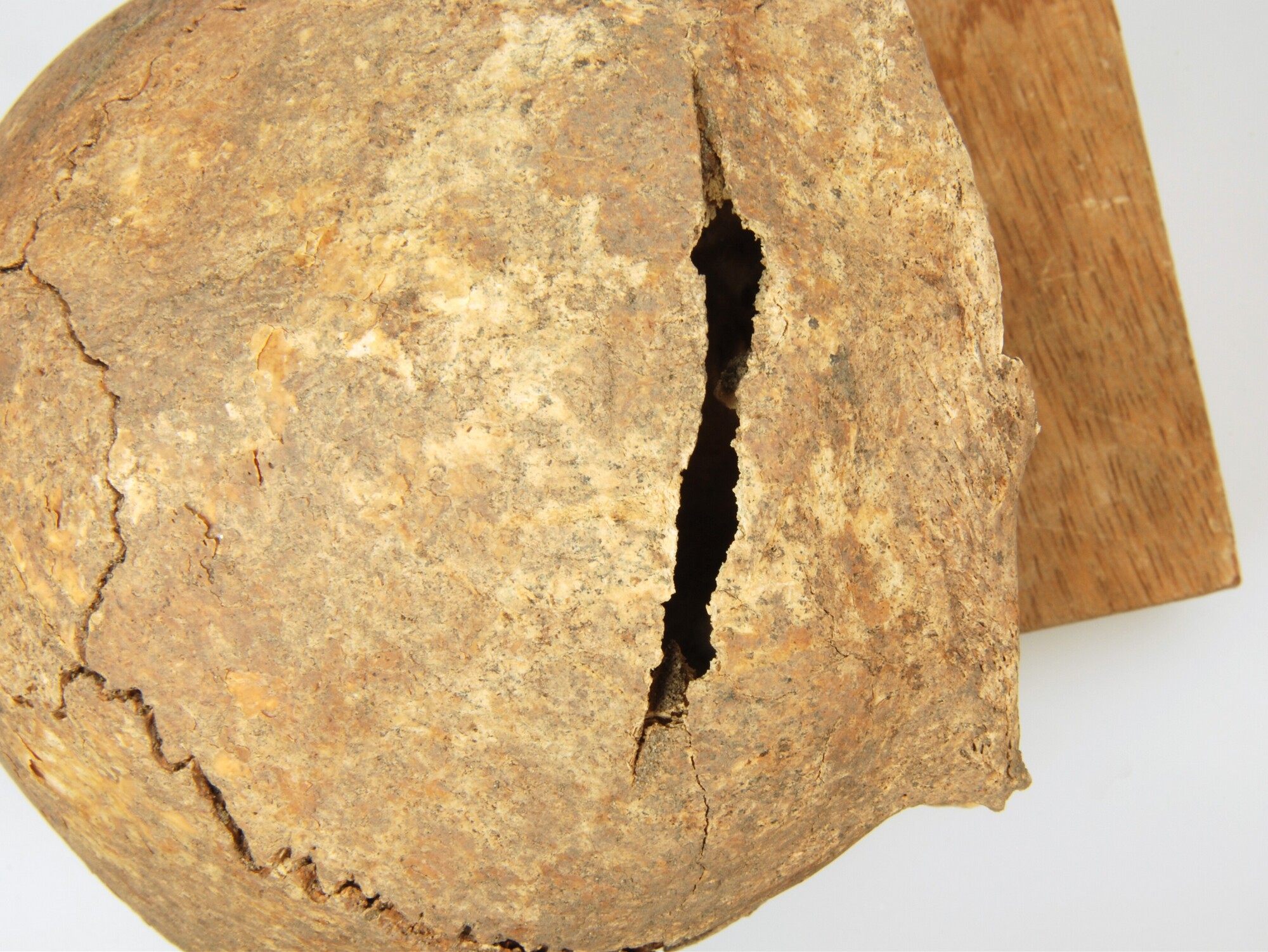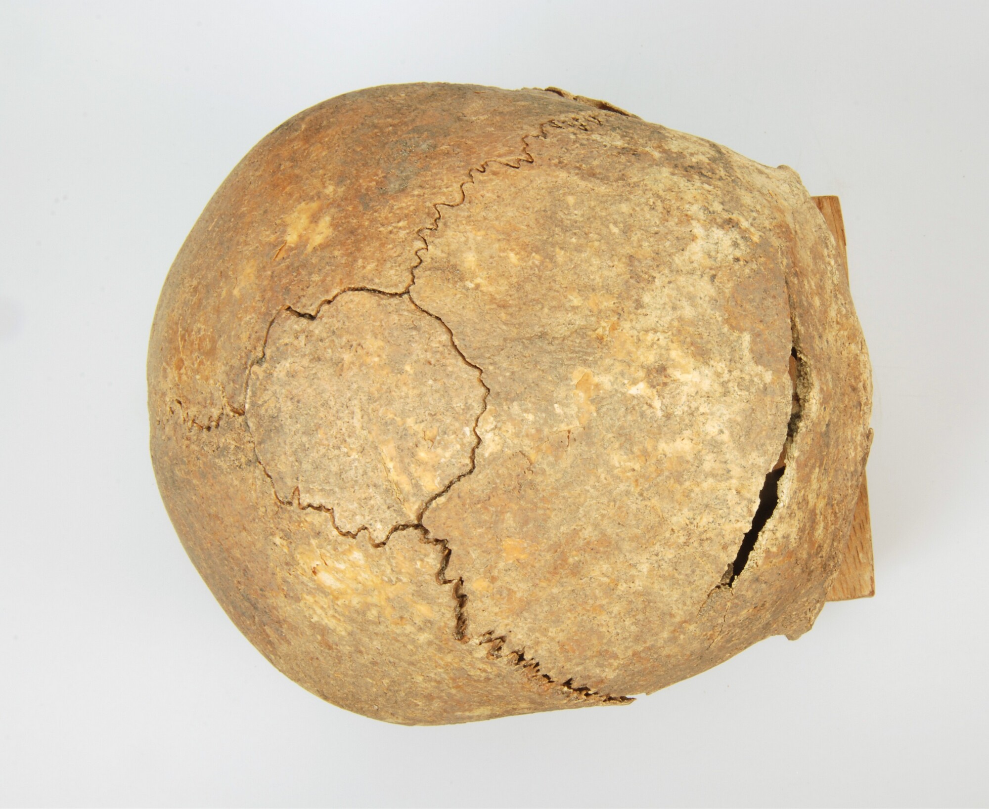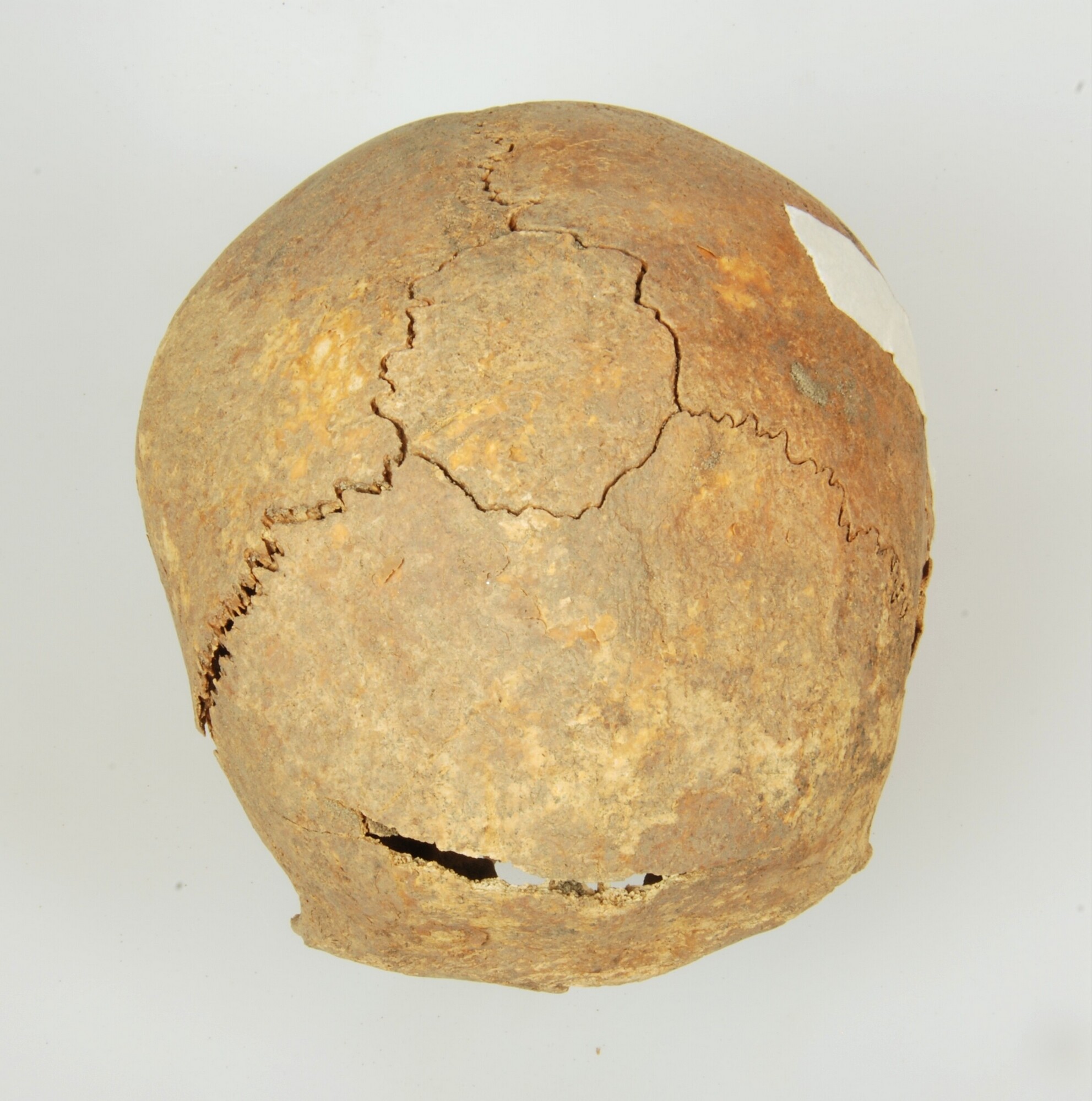 In het voorhoofd van de schedel van een vrouwelijk individu is een grote, horizontale perimortale steekwond toegebracht. De afmeting van de wond is 6,5 cm lang en veroorzaakt door een zwaard. De schedel heeft ook twee anatomische aangeboren afwijkingen. Op het voorhoofd is een extra zelfstandig schedelbeen gevormd tussen de kransnaad en de pijlnaad, het ...