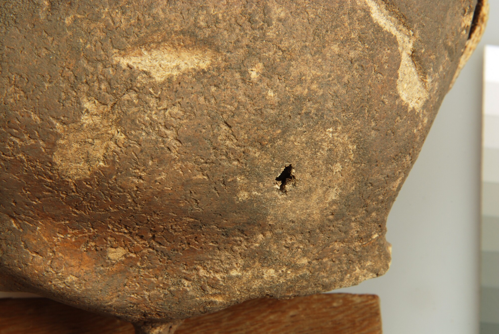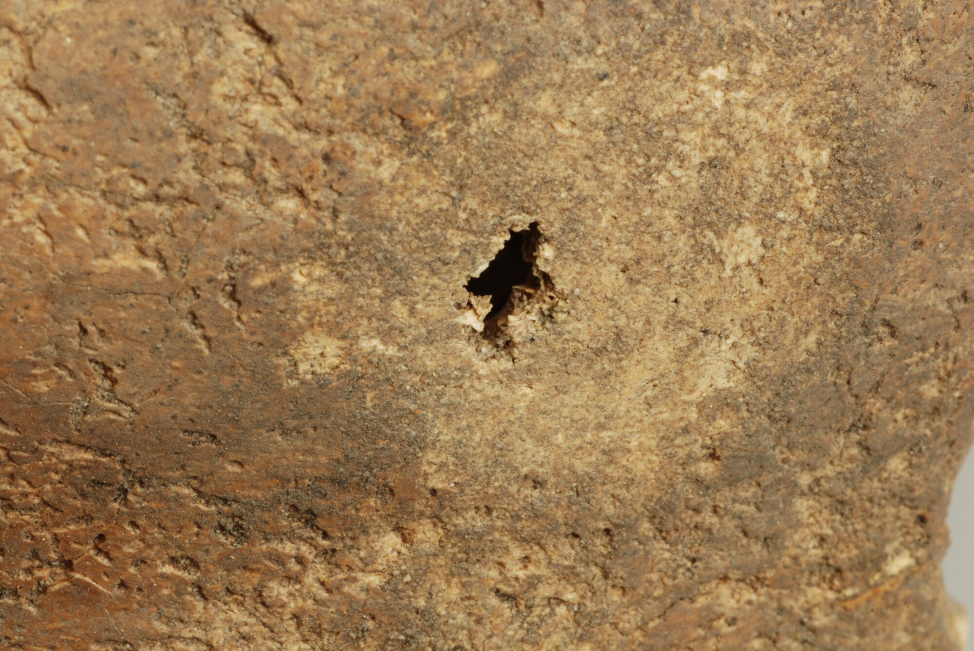 De linkerzijde van het voorhoofd van een mannelijk individu heeft een klein gaatje (foramen) in de vorm van een klavervier. De afmetingen van het foramen zijn: 7 mm x 4 mm. Hier rondom is de schedel afgevlakt in een cirkelvorm. De afmetingen van het afgevlakte deel zijn ± 2 x 2 cm. Deze mechanische verwonding ...