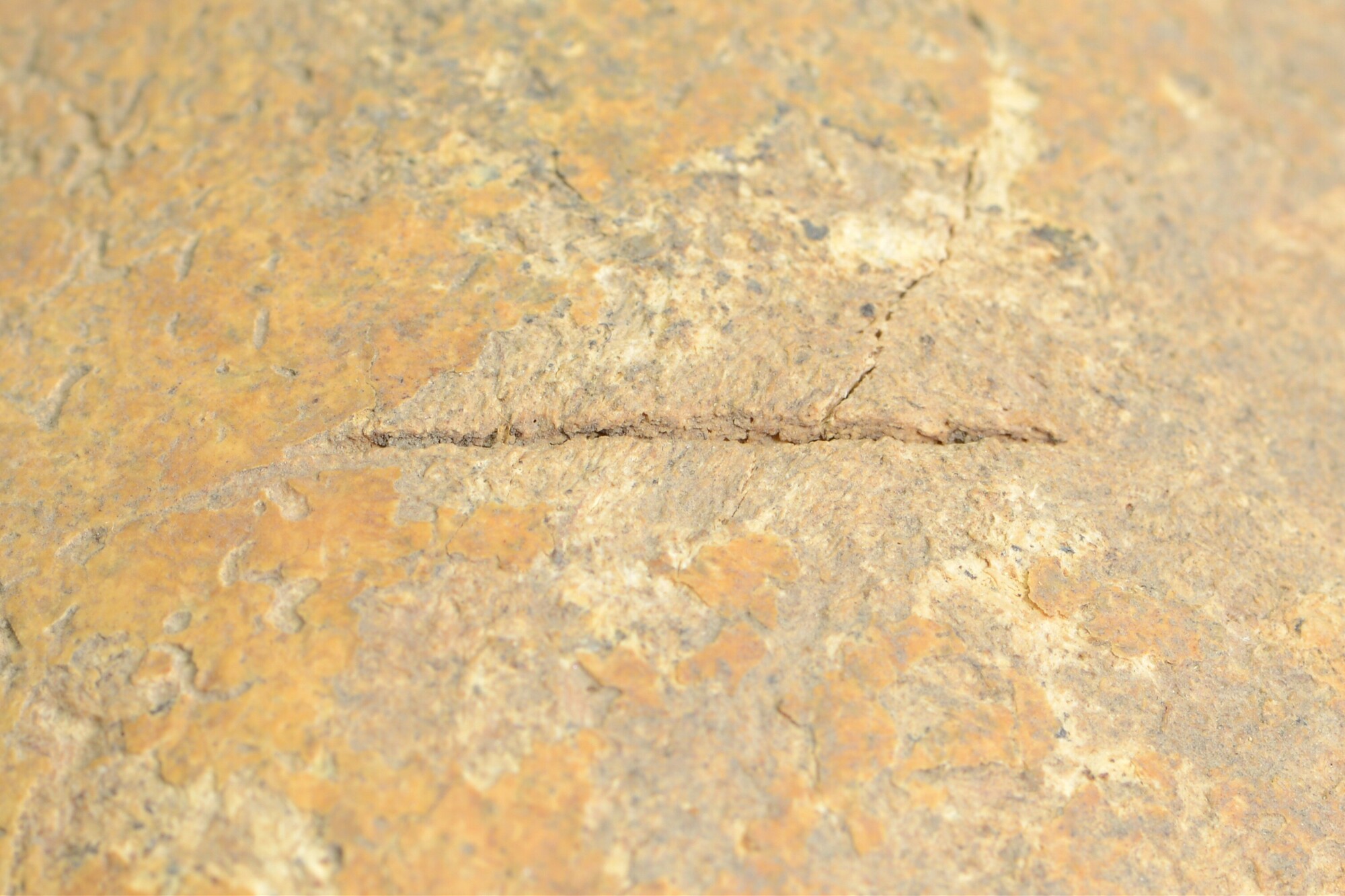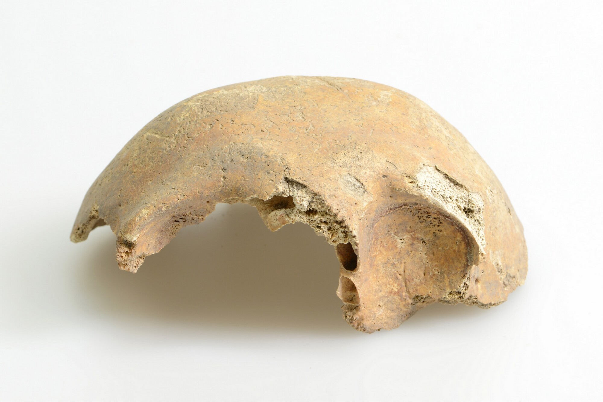 Deel van de schedel van een individu van 23-40 jaar oud met trauma door wapengeweld aan het voorhoofd en cribra orbitalia (poreus botweefsel binnenin de oogkassen door chronische bloedarmoede)