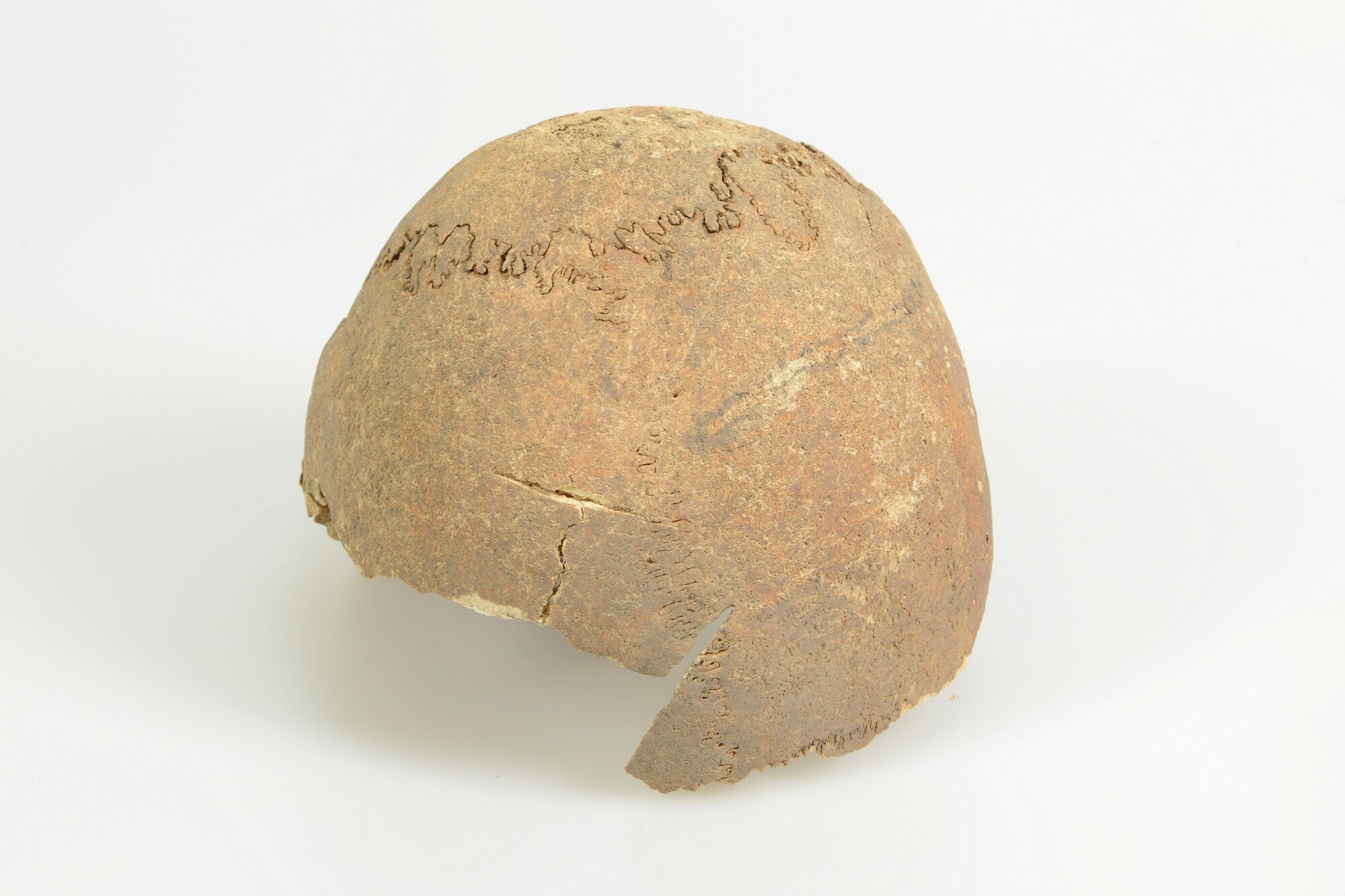 Deel van de schedel van een man van 30-60 jaar oud met trauma van 4,5 cm aan het rechter wandbeen (ossa parietalia). Behalve mechanische steeksporen in schedels zijn bij een aantal individuen ook delen van het schedeldak weggeslagen, met de dood tot gevolg. Hierbij is duidelijk op het schedeldak de vlakke kant waarneembaar waarmee met ...
