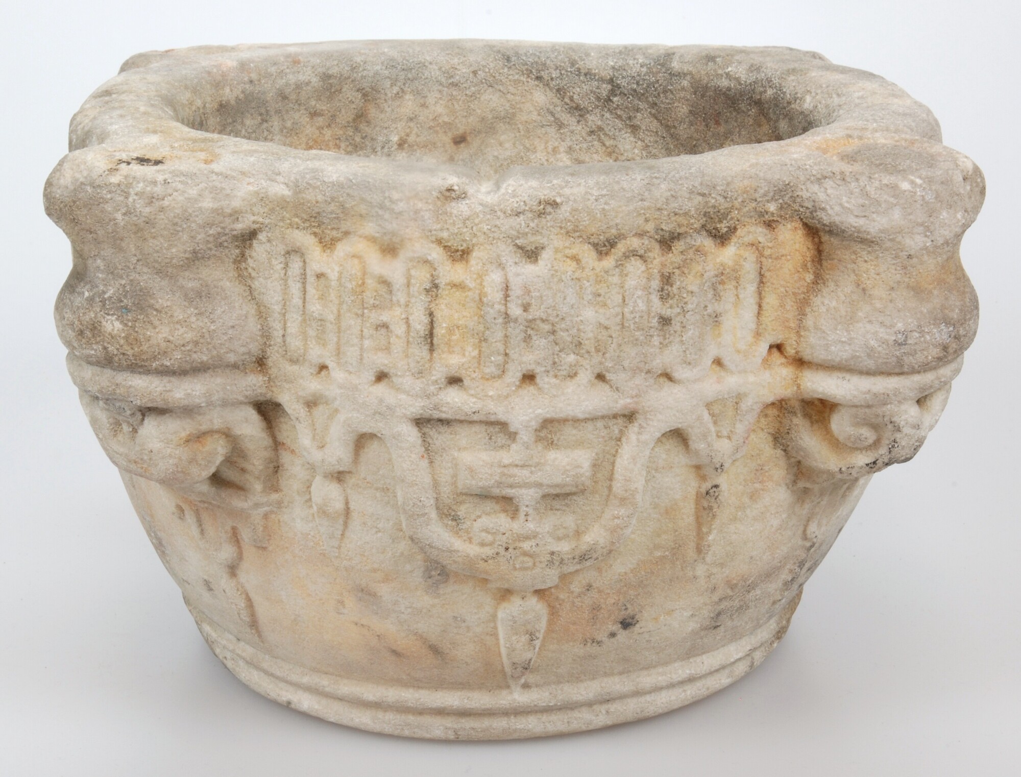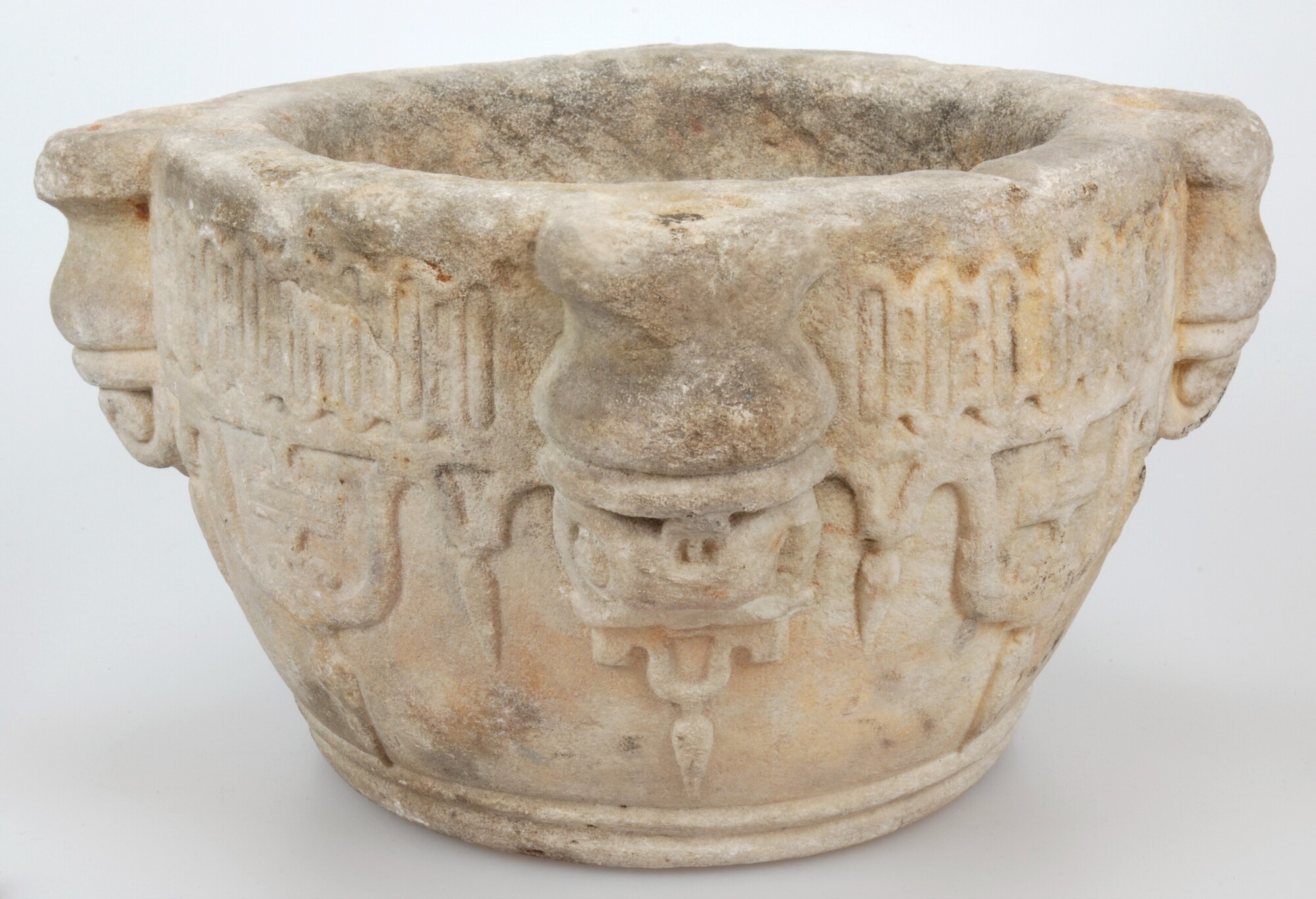 Vijzel; rond model op standvlak met vier uitstekende hoeken; reliëfdecoratie in renaissancestijl: eierlijst langs rand, draperieën op de wand en een dubbele ribbel langs de bodem; herkomst: Maasland
