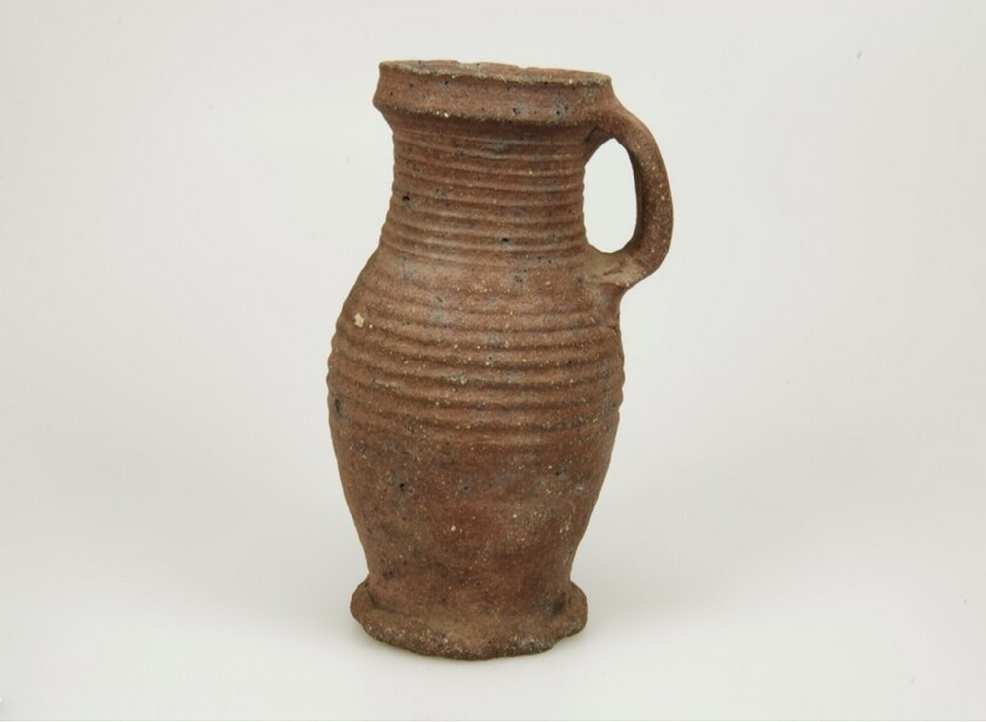 Kan; s5-kan-3; bolle kan met cilindrische hals en kraagrand; proto-steengoed; draairillen; standring; één verticaal lintoor; donkerbruin; productieplaats: Brunssum-Schinveld