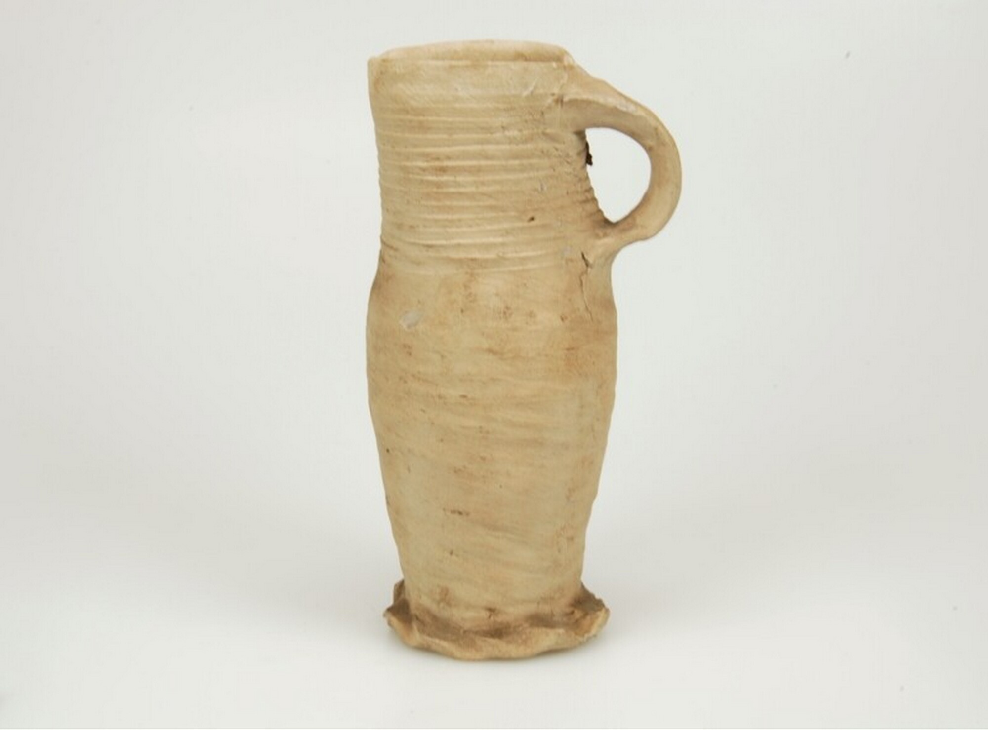 Kan; s1-kan-23; lage bekervormige kan met kraag op halsaanzet, iets verdikte hals, rechte rand; steengoed; geknepen standring; één verticaal lintoor; oranje blos; productieplaats: Siegburg